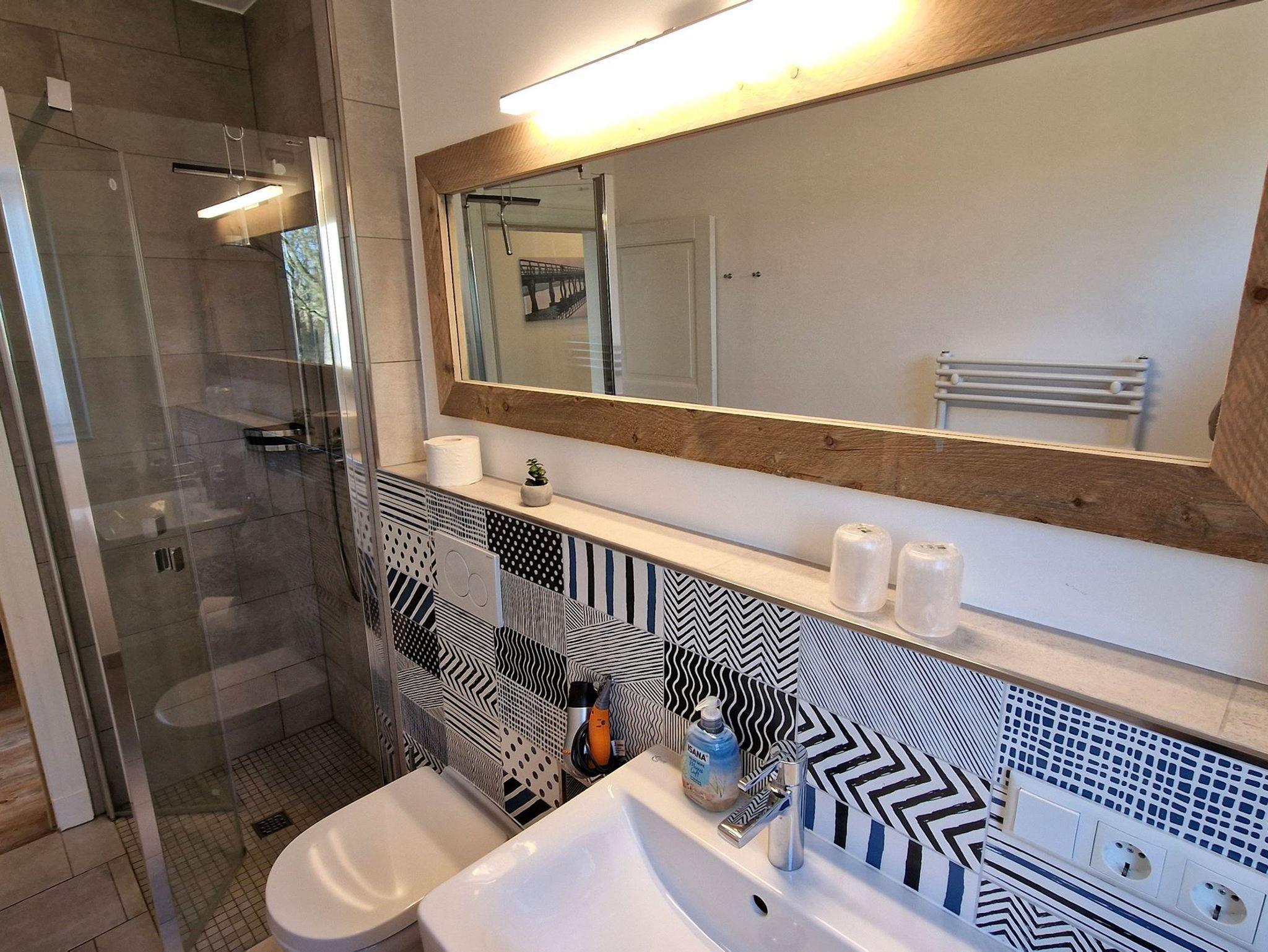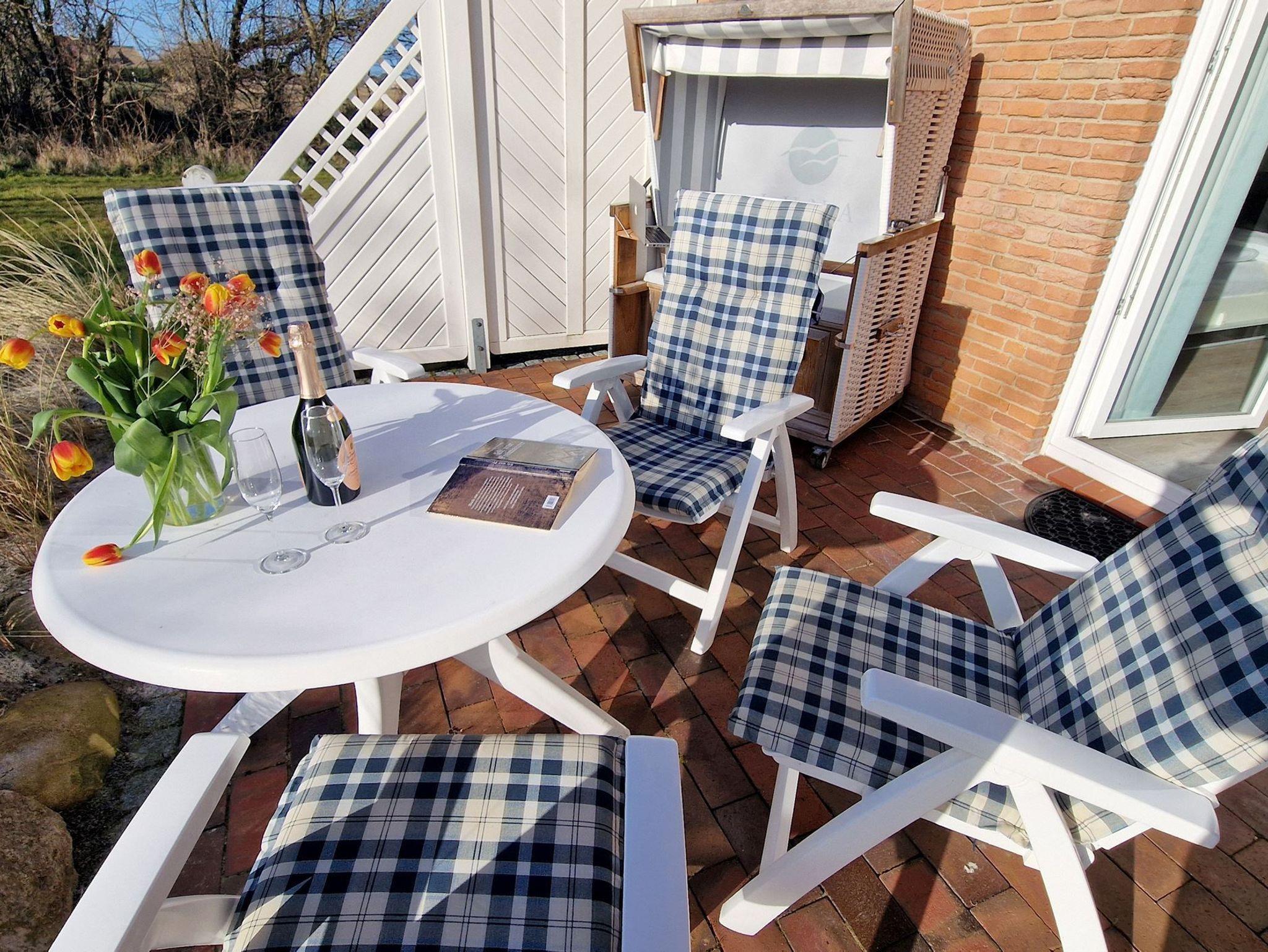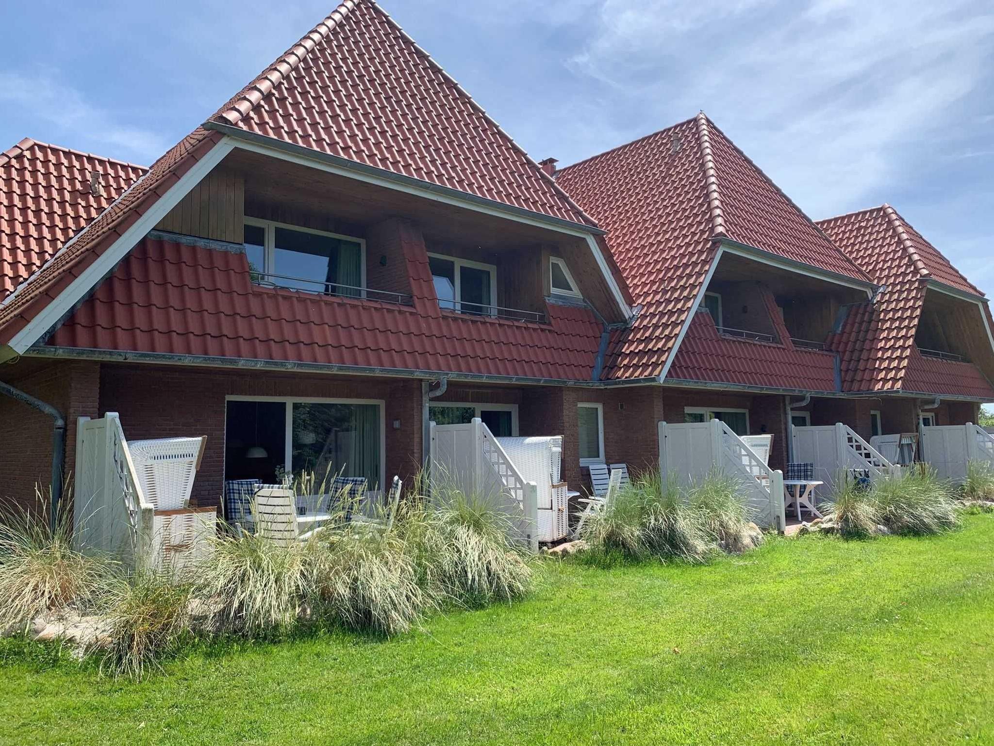 Sie teilt sich wie folgt auf: Eingangsdiele mit Garderobe, Schlafzimmer mit 2 Einzelbetten, Duschbad mit WC.Der großzügige Wohnraum mit direktem Zugang zur Terrasse und Garten überzeugt mit seiner gemütlichen Sitzecke mit direktem Blick nach draußen, moderne, weiße Küche, Essecke und als weitere Schlafmöglichkeit 1 Doppelschrankbett. Die Fußböden der Ferienwohnung sind aus Designerparkett oder Fliesen, Allergikergeeignet.