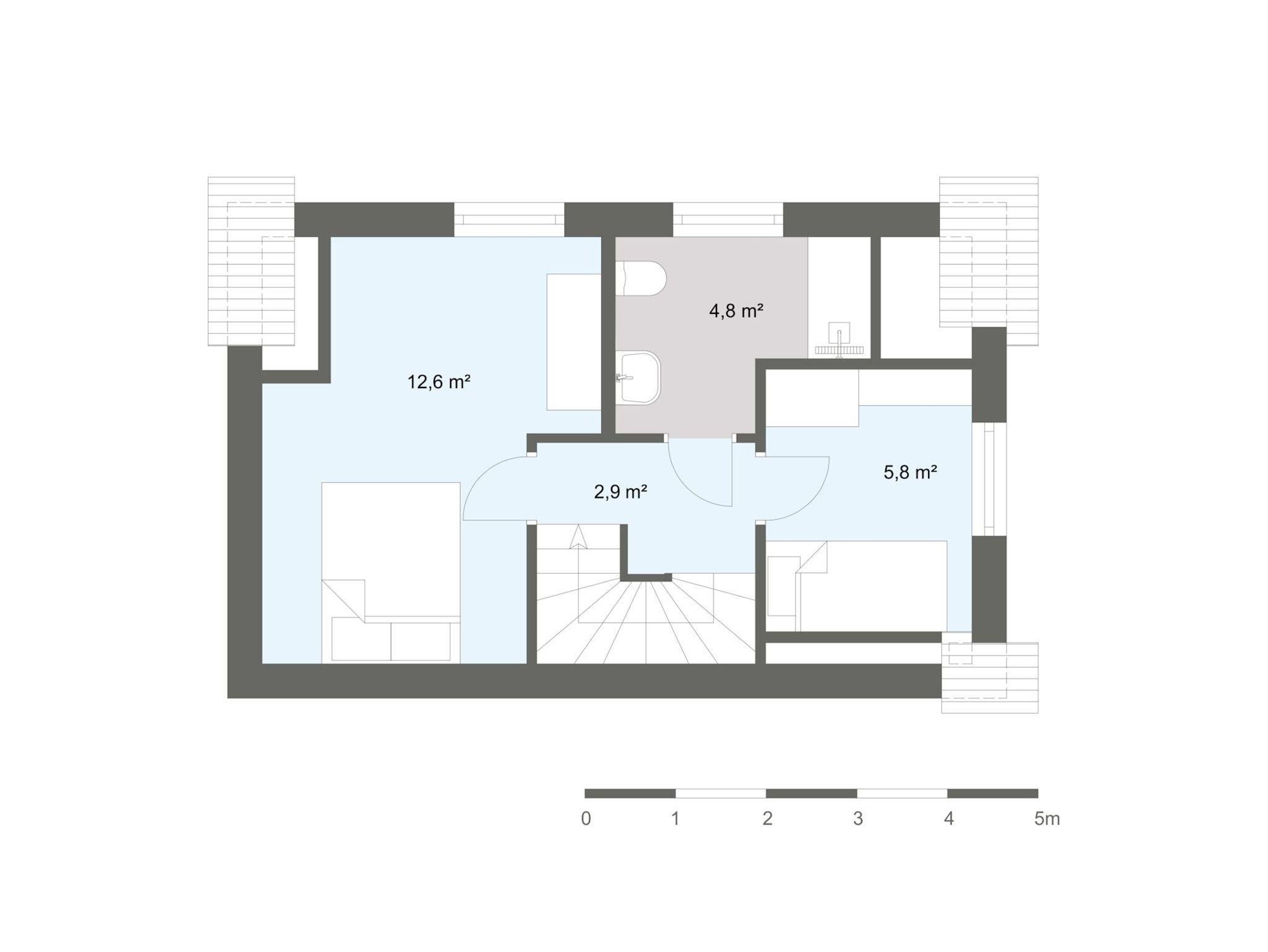 Die Wohnung verfügt über zwei Schlafzimmer in der oberen Etage. Das größere Zimmer hat ein Boxspringbett (160 x 200), das kleinere ein Einzelbett (90 x 200). Dazwischen finden Sie das Bad mit Dusche und Waschmaschine.