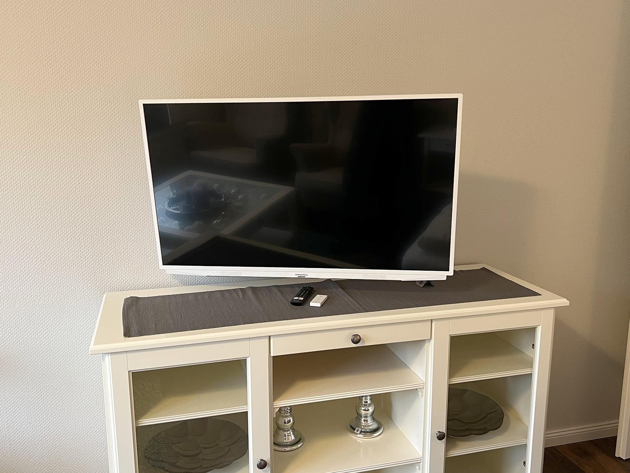 Wohnzimmer: Couch, Couchtisch, Ablage, Kabel-TV, Flachbildschirm, Stereoanlage mit CD-Player, Schrankwand, Schrankdoppelbett, Küchenzeile, 4 Plattenherd, Dunstabzugshaube, Kühlschrank, Mikrowelle, Kaffeemaschine, Wasserkocher, Toaster, Esstisch, 3 Stühle, Geschirr, Kochtöpfe