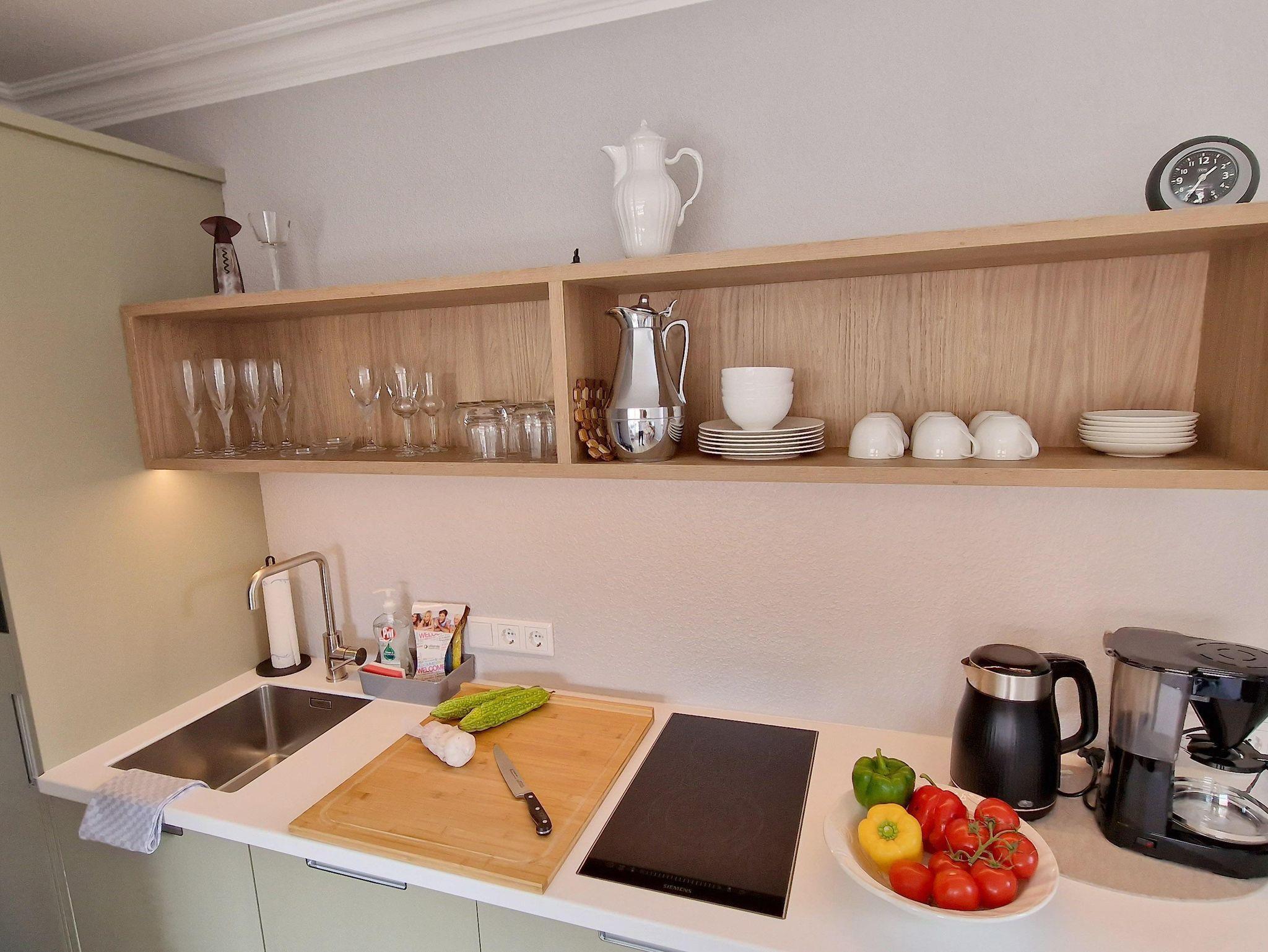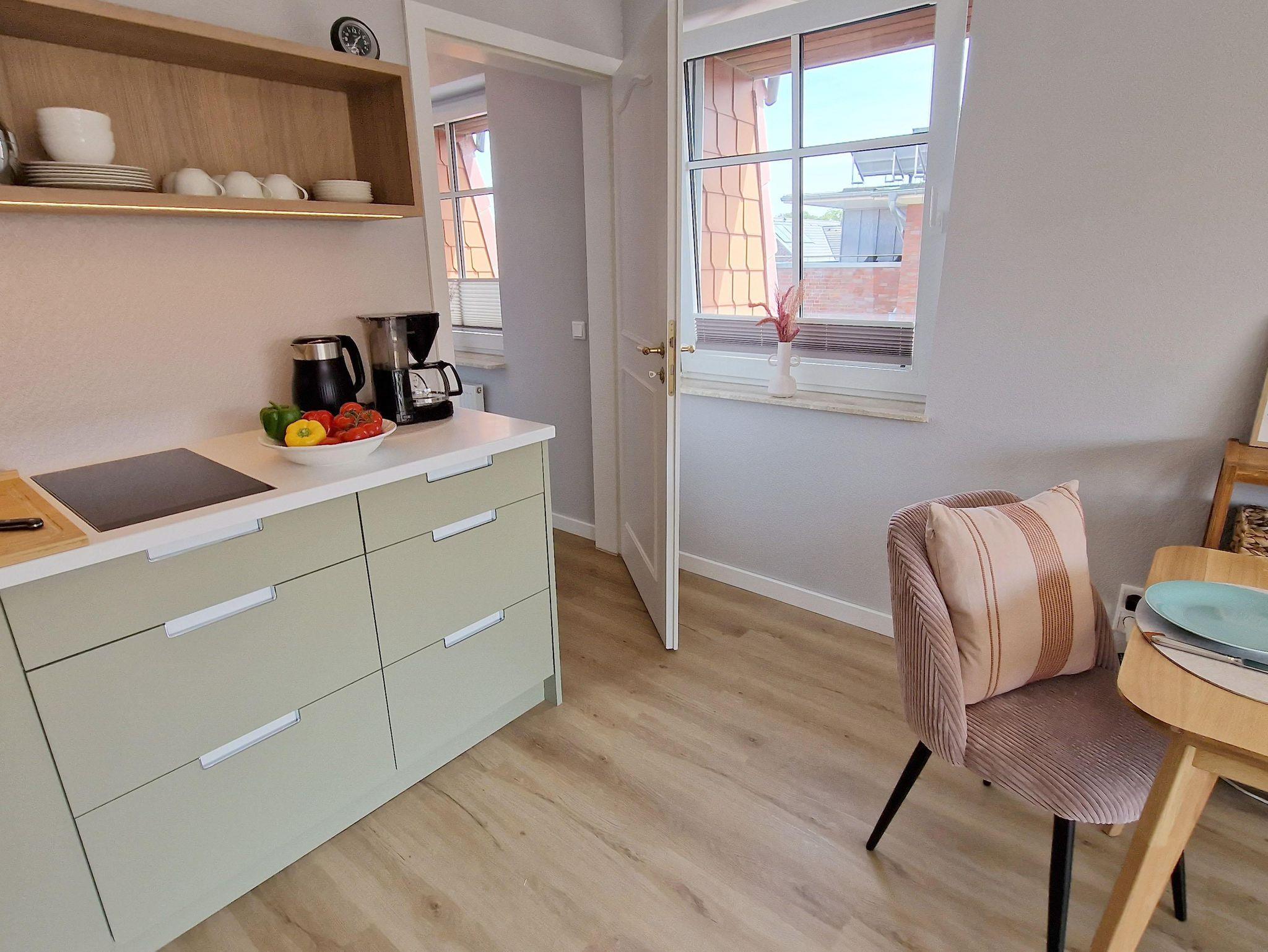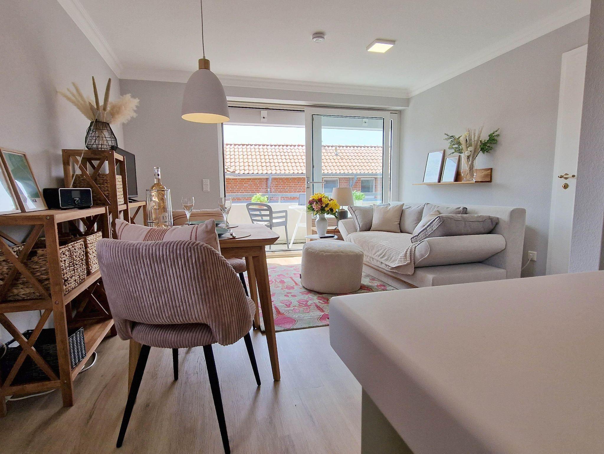 Eine mit Liebe zum Detail durchdachte, schicke und helle Ferienwohnung, um die Urlaubstage rundherum zu genießen. Hochwertige, moderne Ausstattung. Wohnzimmer mit bequemer Couch, großzügigem Balkon mit Gartenmöbeln, sowie zwei Markisen die Sie bei Bedarf vor der Sonne schützen. Moderne, offene Küche. Helles Schlafzimmer mit Boxspringbett (160x200) und einem weiteren Zugang zum Balkon. Ihr exklusives Feriendomizil für zwei Personen im 3. OG.