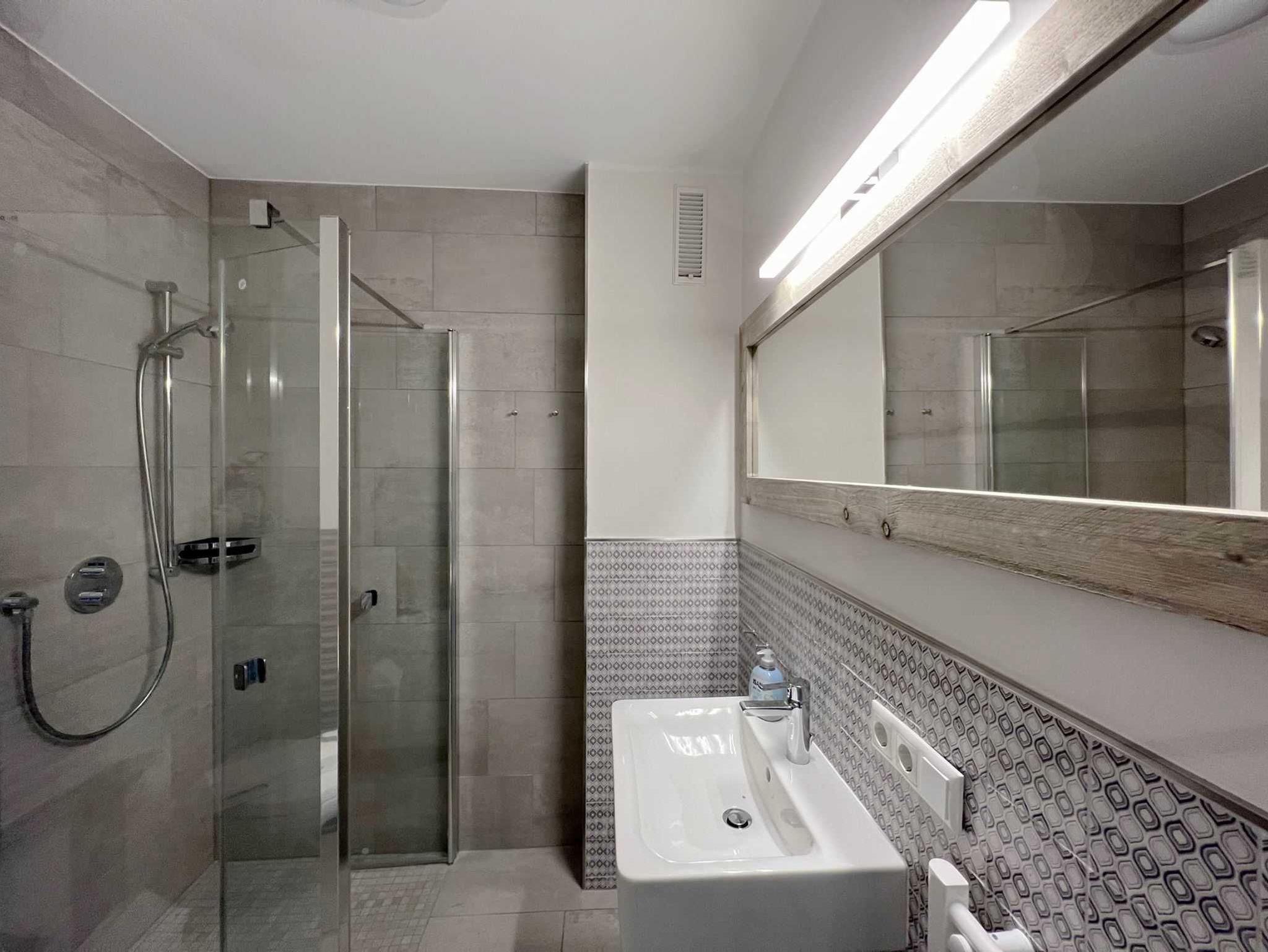 Sie teilt sich wie folgt auf: Eingangsdiele mit Garderobe, Schlafzimmer mit Doppelbett, Duschbad mit WC. Der großzügige Wohnraum mit direktem Zugang zur Loggia überzeugt mit seiner gemütlichen Sitzecke, der modernen weißen Küche, der Essecke und als weitere Schlafmöglichkeit 1 Schrankbett,
