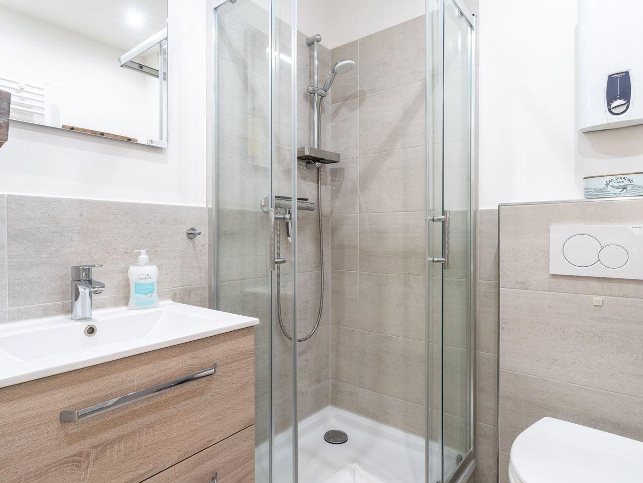Das Badezimmer der Feinen Butze bietet eine Dusche, ein Waschbecken sowie ein WC. Selbstverständlich sind auch ein Haartrockner und ein Spiegel vorhanden, sodass Sie sich nach einem entspannenden Bad frisch machen können. Zudem ist die Unterkunft ein Nichtraucherobjekt und bietet eine angenehme Atmosphäre ohne störende Gerüche.