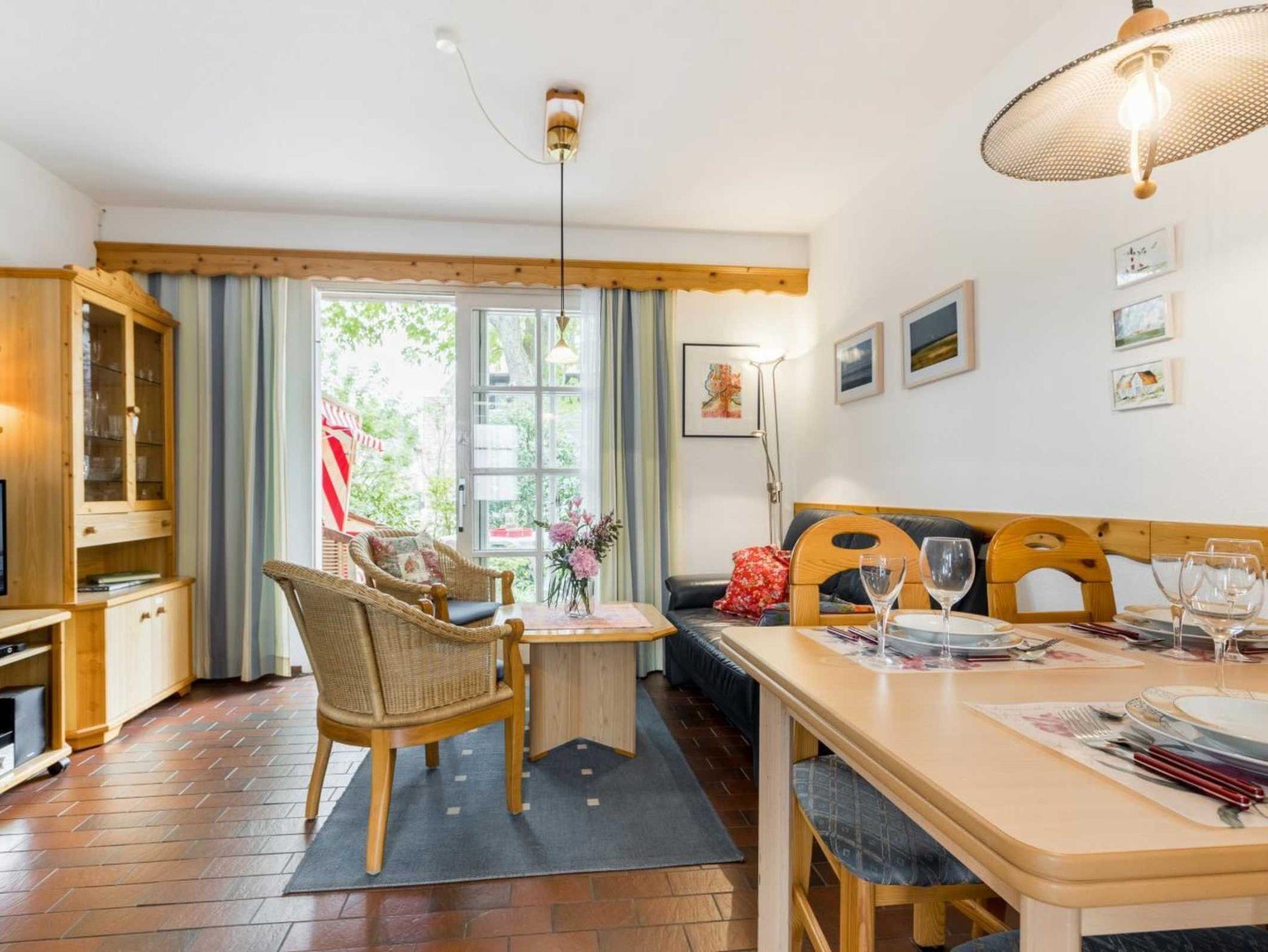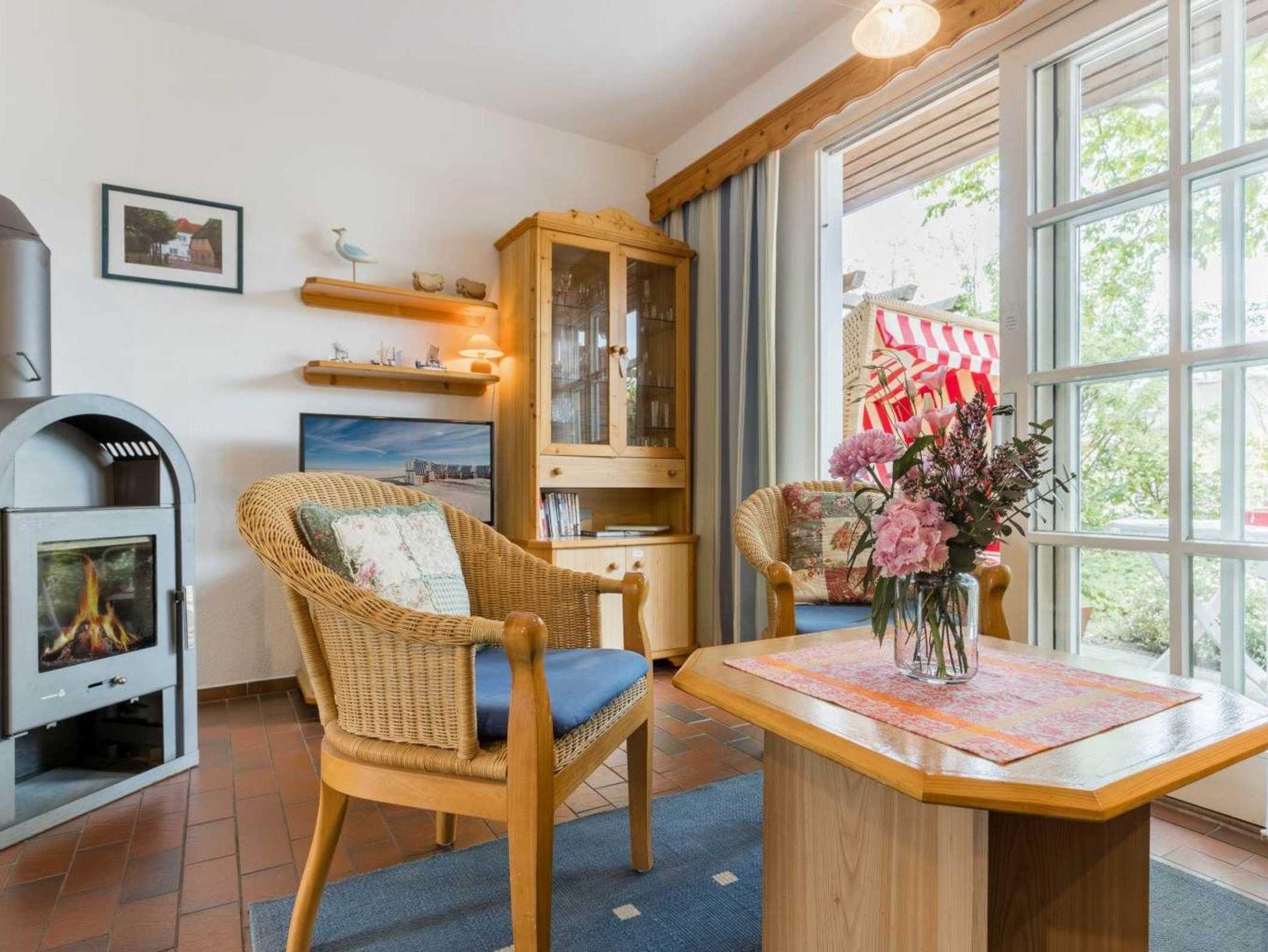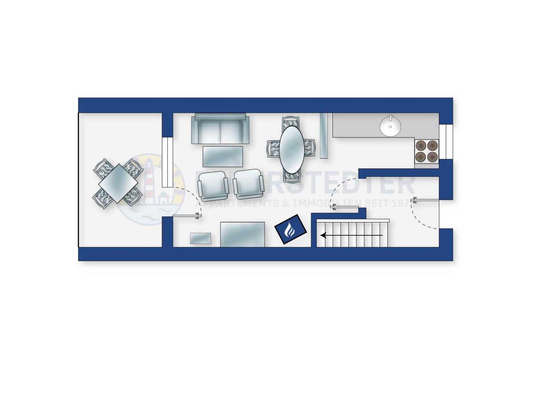 Wohnzimmer mit Sofa (2er), TV (Sat), DVD-Player, Stereo-Kompaktanlage, Kaminofen und separater Essecke mit 4 Stühlen. Offene Küche mit Backofen, Mikrowelle, Kühlschrank mit Gefrierfach und Geschirrspüler. Direkter Zugang zur windgeschützten, möblierten Terrasse nach Osten mit Strandkorb.