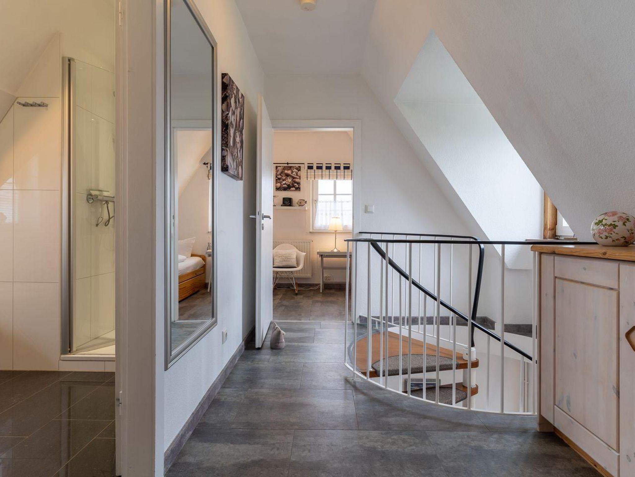 Über eine Rundtreppe gelangt man in das Obergeschoss mit zwei großzügigen Schlafzimmern und einem Duschbad.