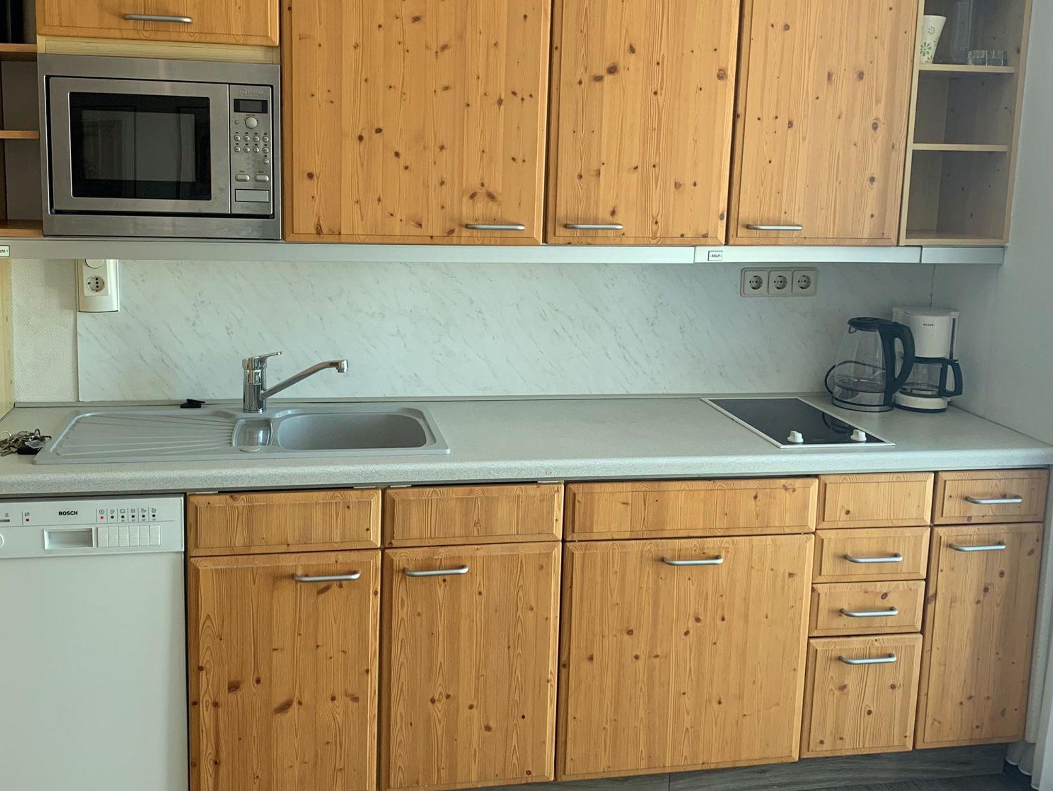 Wohnzimmer2 Sessel, Esstisch, 4 Stühle, TV-Tisch, Kabel-TV, Tischlampe, 2 Schränke, Regal, Schrankdoppelbett, Stereoanlage mit CD-Player, Küchenzeile, 2 Plattenherd, Dunstabzugshaube, Kühlschrank, Spülmaschine, Mikrowelle mit Grill, Staubsauger, Kaffeemaschine, Toaster, Geschirr, Kochtöpfe