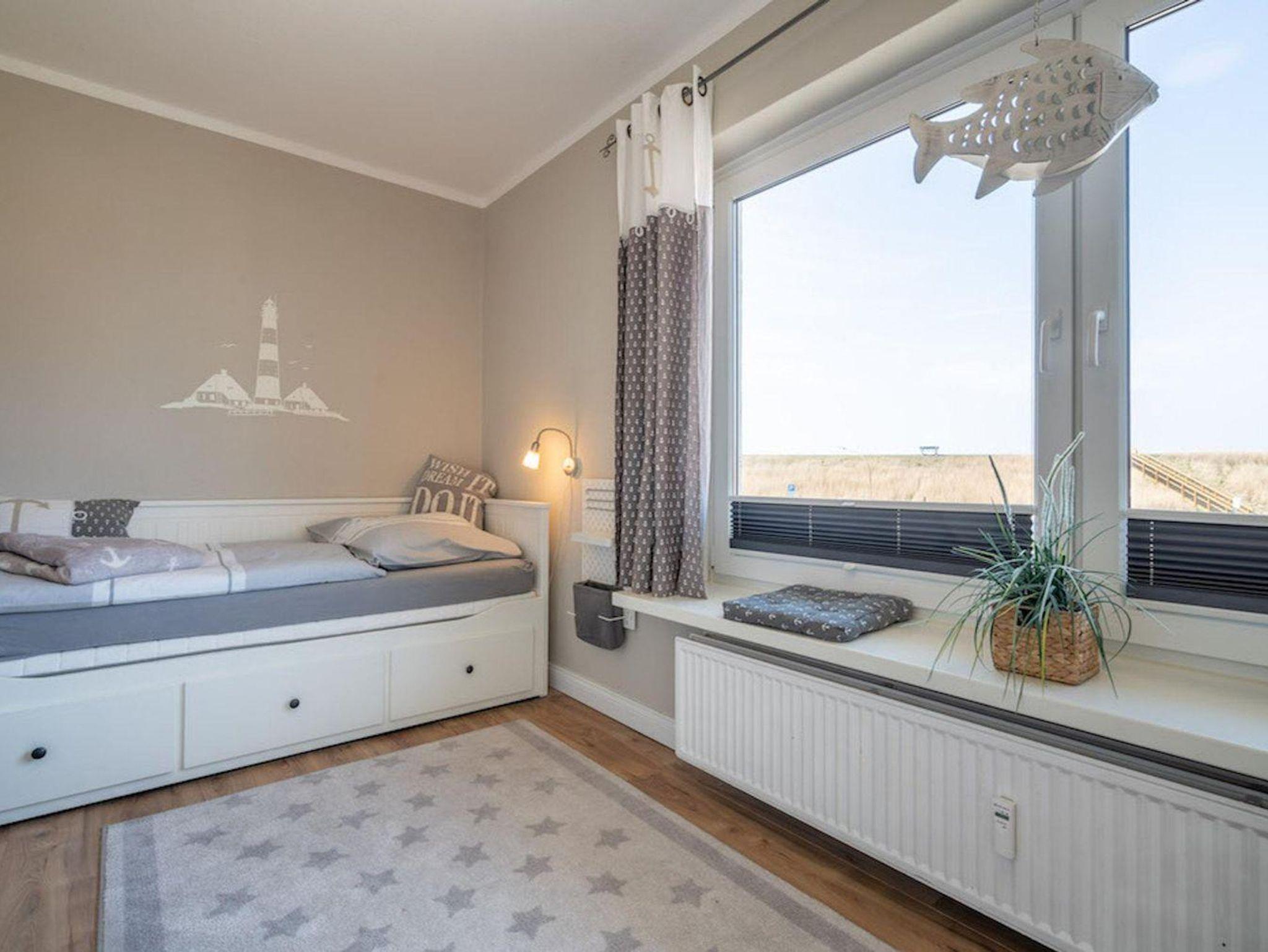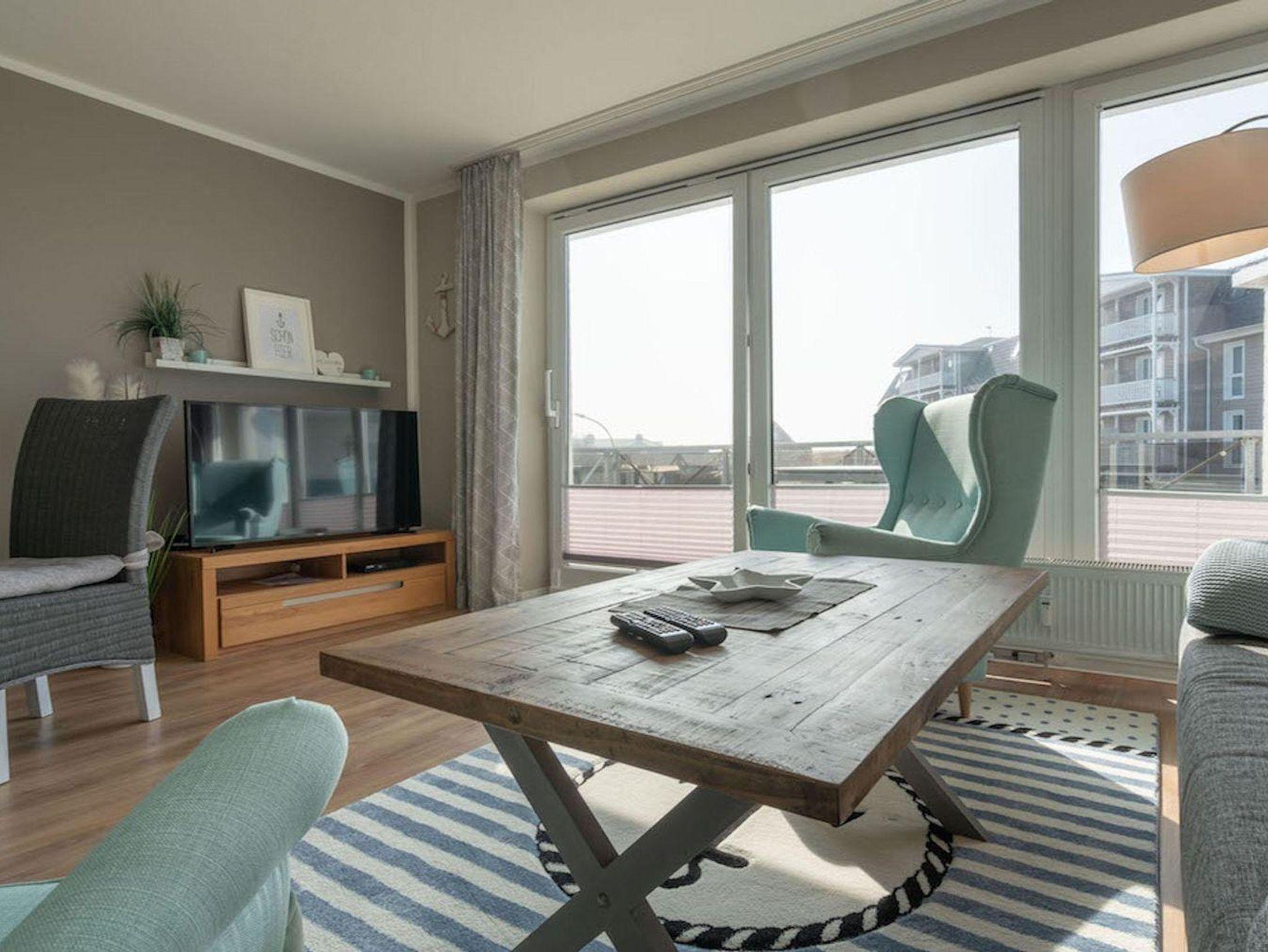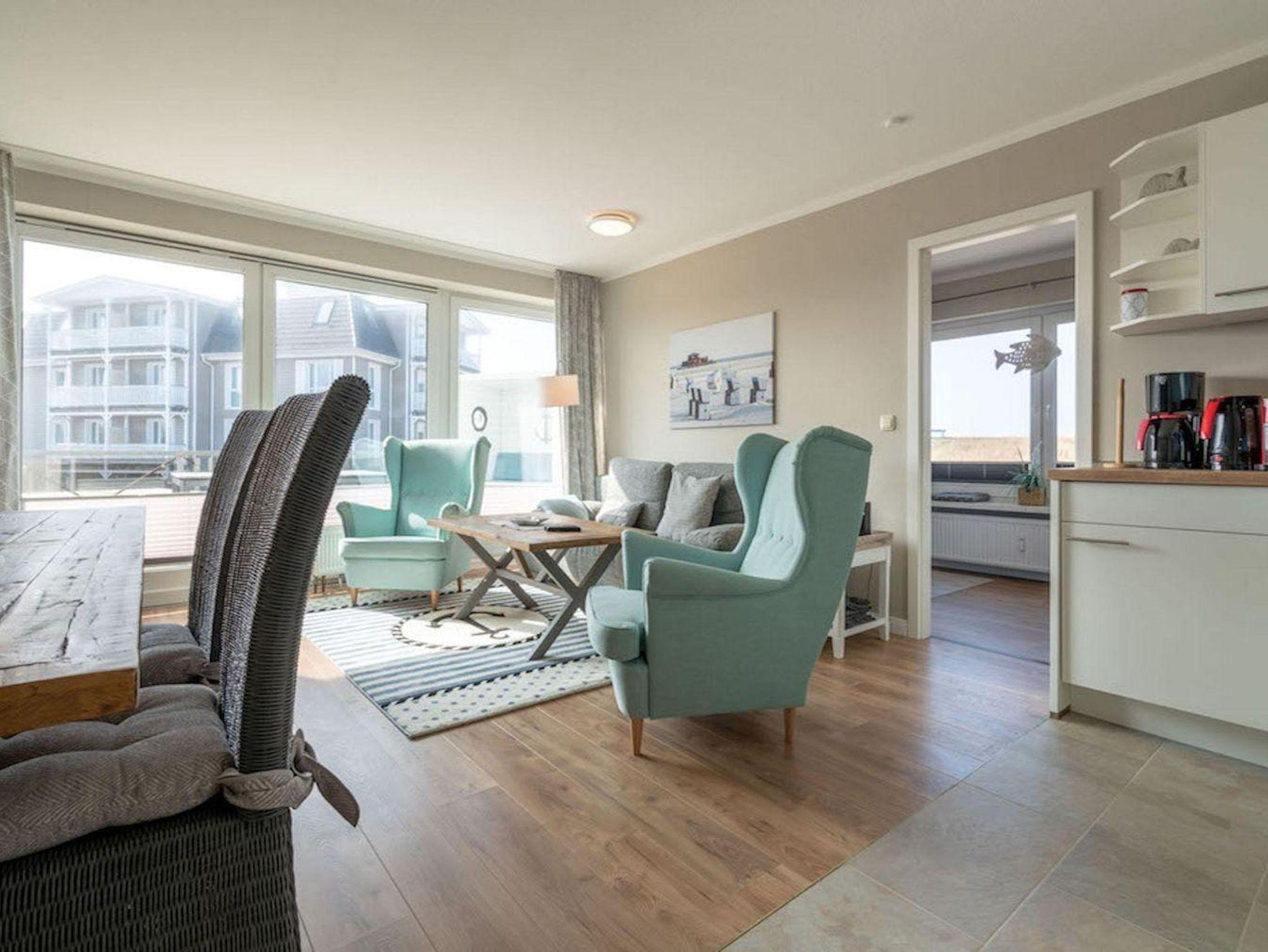 Das modernisierte Appartement bietet Platz für 4-6 Personen auf ca. 62qm und hat einen wunderbaren Ausblick auf den Deich mit der Strandüberfahrt. Der Wohnbereich der Ferienwohnung verfügt über eine Couch mit Couchtisch sowie zwei Sesseln. Des weiteren ist ein großer Esstisch mit 6 Stühlen vorhanden. Vom Wohnbereich gelangen Sie auf den Balkon der ebenfalls mit einem Tisch und 6 Stühlen ausgestattet ist. Die Küchenzeile verfügt über einen Herd mit Ceranfeld und Backofen, Dunstabzugshaube, Geschirr, Spülmaschine, Kaffeemaschine, Kochtöpfe, Kühlschrank, Toaster und einem Wasserkocher. Das erste Schlafzimmer ist ausgestattet mit einem Doppelbett (2,00 x 1,80 m) einem TV und 2 Nachttischen sowie einem Kleiderschrank.