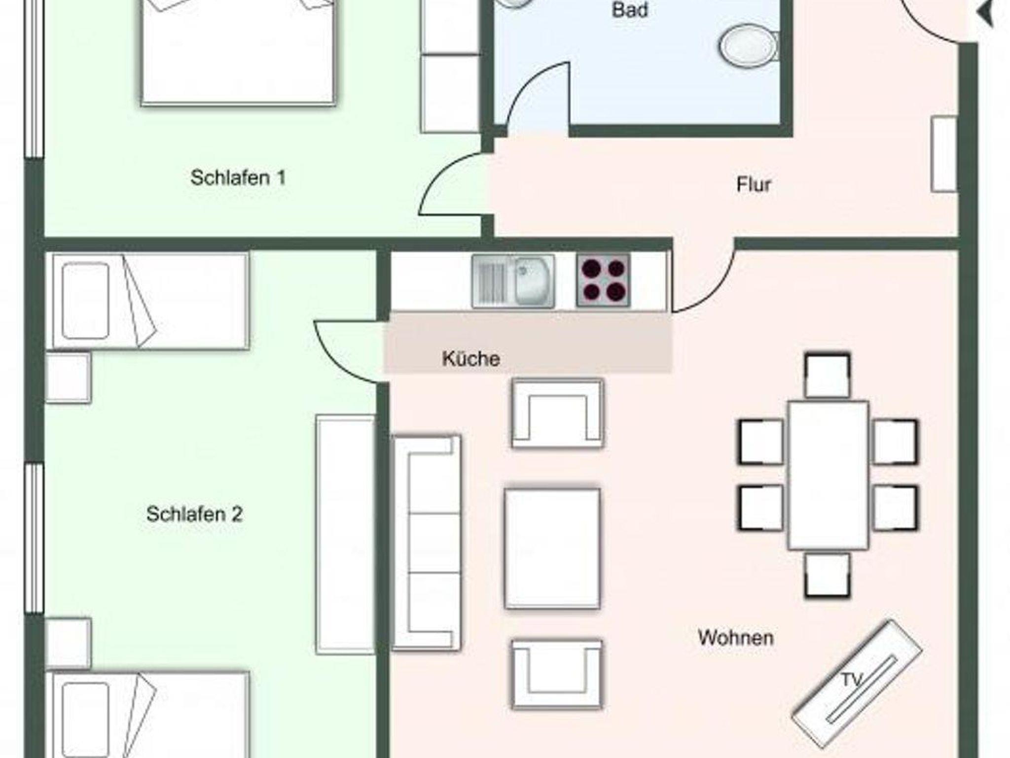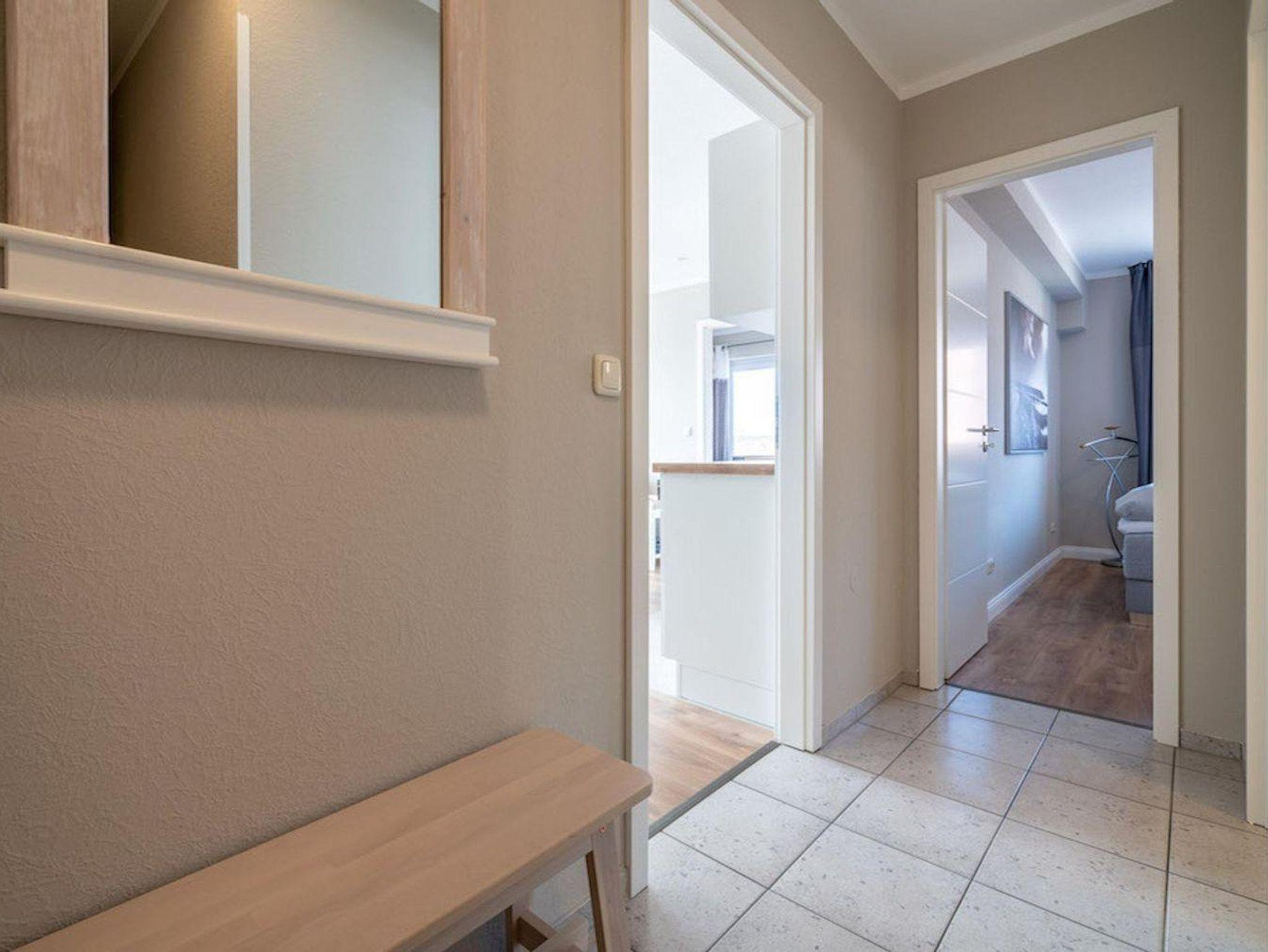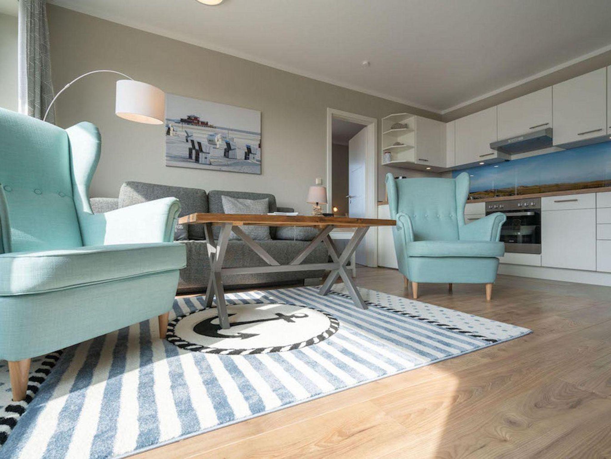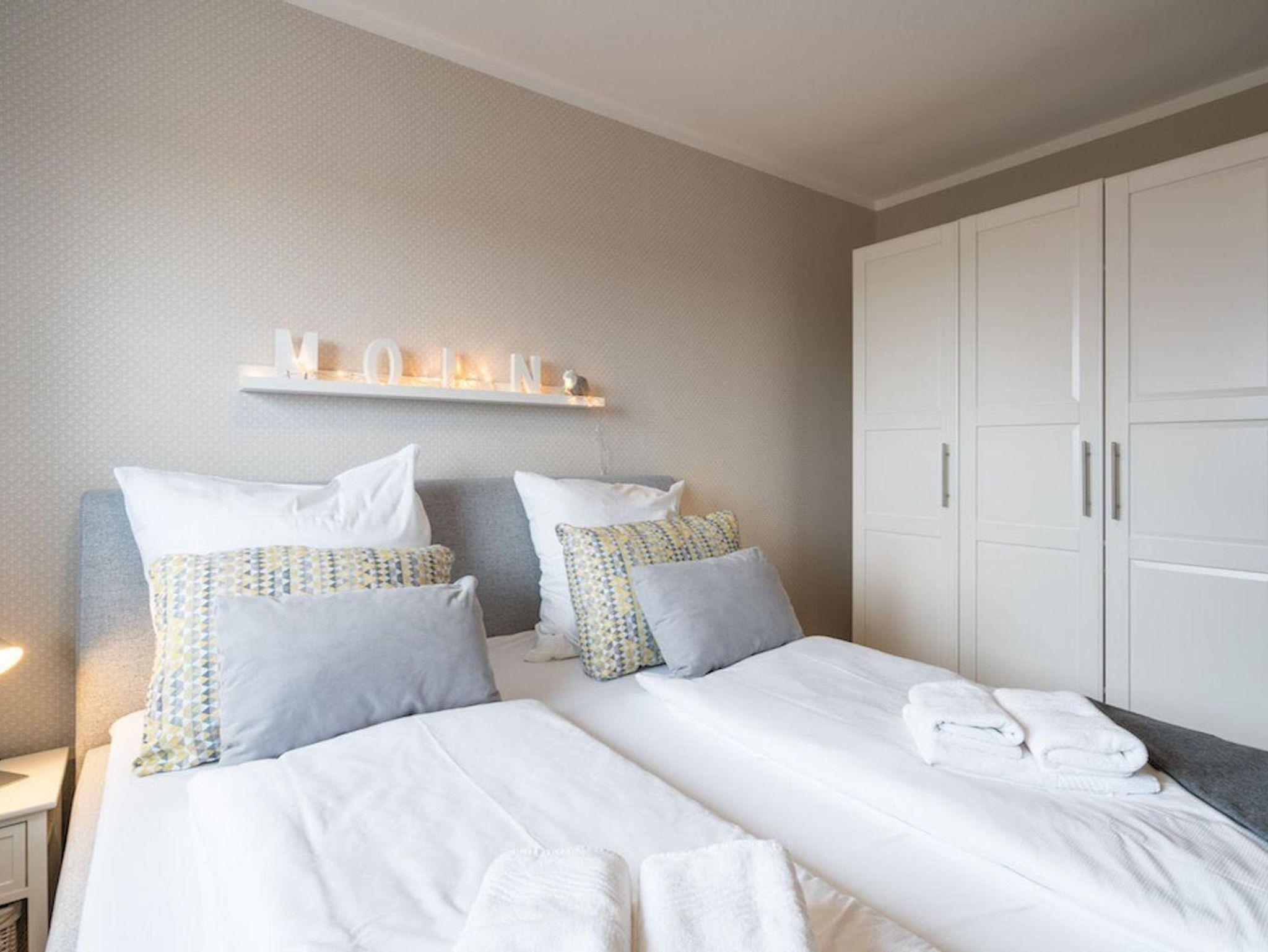 Das modernisierte Appartement bietet Platz für 4-6 Personen auf ca. 62qm und hat einen wunderbaren Ausblick auf den Deich mit der Strandüberfahrt. Der Wohnbereich der Ferienwohnung verfügt über eine Couch mit Couchtisch sowie zwei Sesseln. Des weiteren ist ein großer Esstisch mit 6 Stühlen vorhanden. Vom Wohnbereich gelangen Sie auf den Balkon der ebenfalls mit einem Tisch und 6 Stühlen ausgestattet ist. Die Küchenzeile verfügt über einen Herd mit Ceranfeld und Backofen, Dunstabzugshaube, Geschirr, Spülmaschine, Kaffeemaschine, Kochtöpfe, Kühlschrank, Toaster und einem Wasserkocher. Das erste Schlafzimmer ist ausgestattet mit einem Doppelbett (2,00 x 1,80 m) einem TV und 2 Nachttischen sowie einem Kleiderschrank.