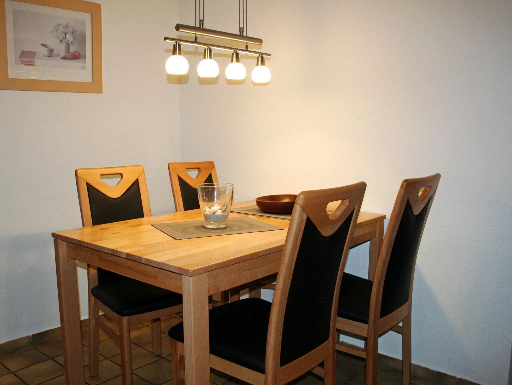 Couch, Couchtisch, 2 Sessel, 2 Stehlampen, Nachtspeicherofen, Stereoanlage mit CD-Player, TV-Vitrinenschrank, Schrankdoppelbett, Kleiderschrank, Kabel-TV, Esstisch, 4 Stühle