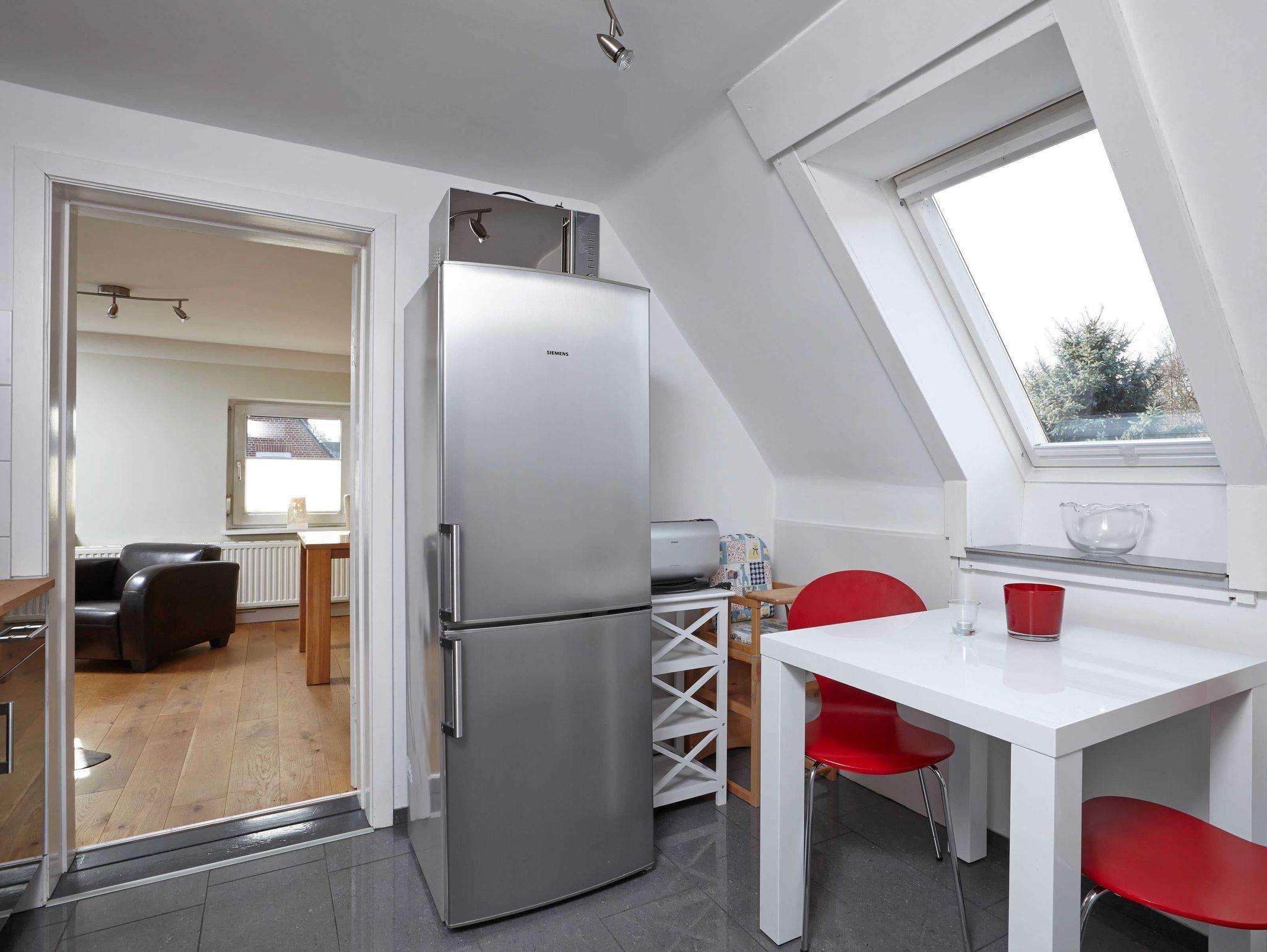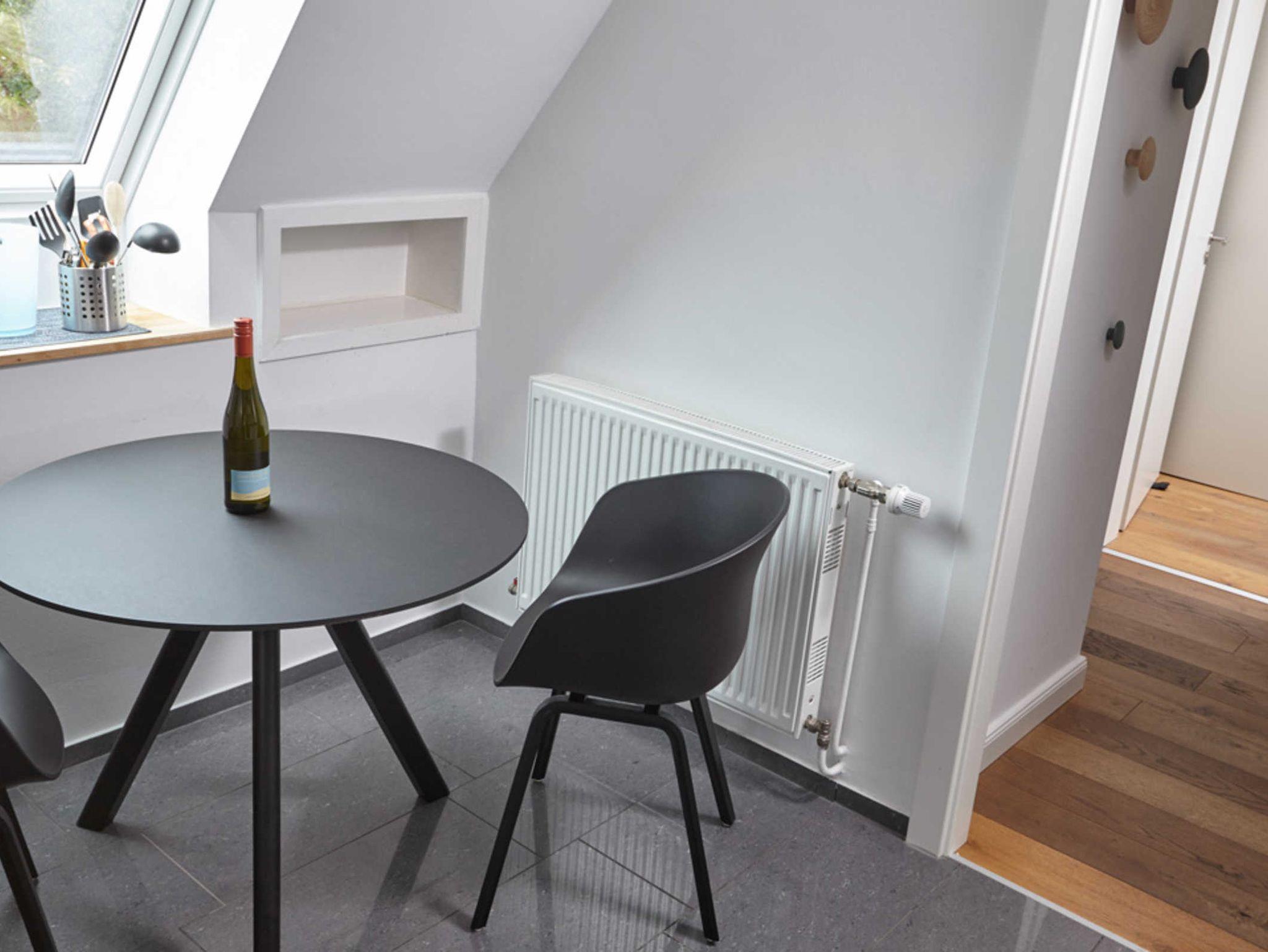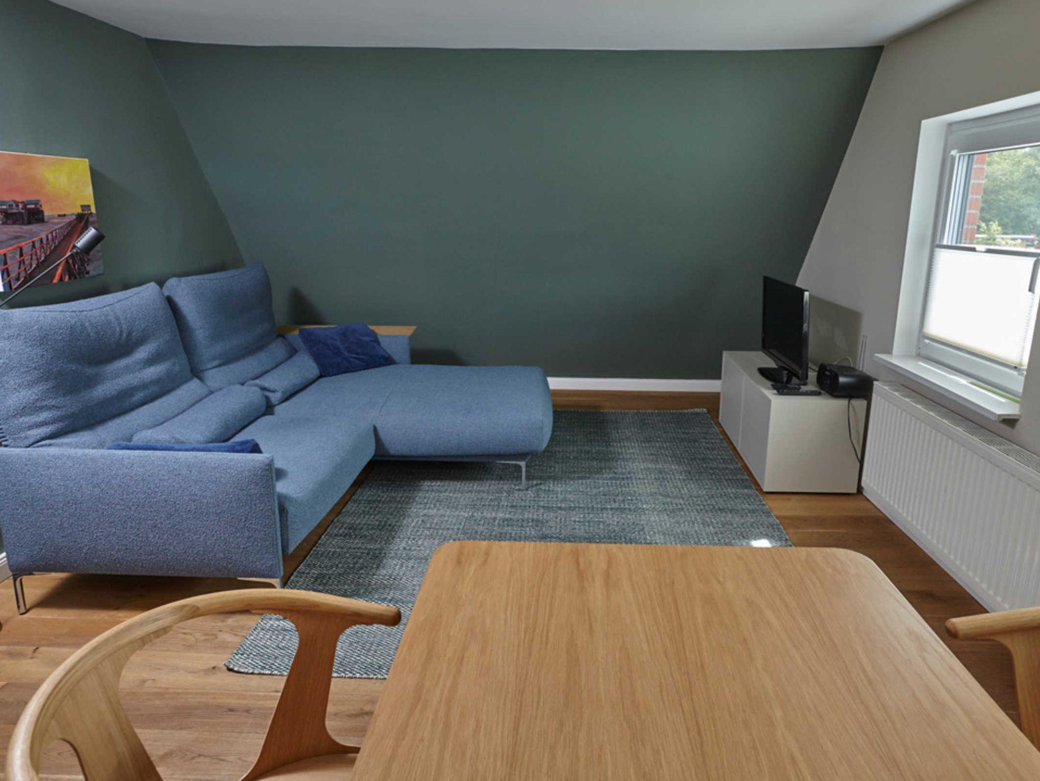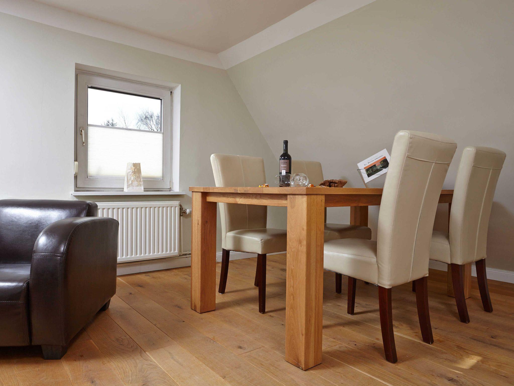 Die helle Wohnung im 1.OG besticht durch ihr modernes Interieur. Die Wohn-und Schlafräume sind mit einer Eichendiele ausgelegt. Das Wohnzimmer verfügt über Ledersofas, die nach einem Tag am Strand zum Chillen einladen. Gespeist wird an einer großen Tafel. In der Küche kann auch ein ordentliches Dinner zubereitet werden, da sie über alle erdenklichen Utensilien und Geräte deutscher Markenhersteller verfügt. Das Duschbad ist aufwendig gefliest und selbstverständlich vom WC separiert. Die Schlafzimmer laden durch ihr freundliches Ambiente zum Träumen ein. Geschmackvolle Ölbilder einer norddeutschen Malerin runden das Ambiente ab.