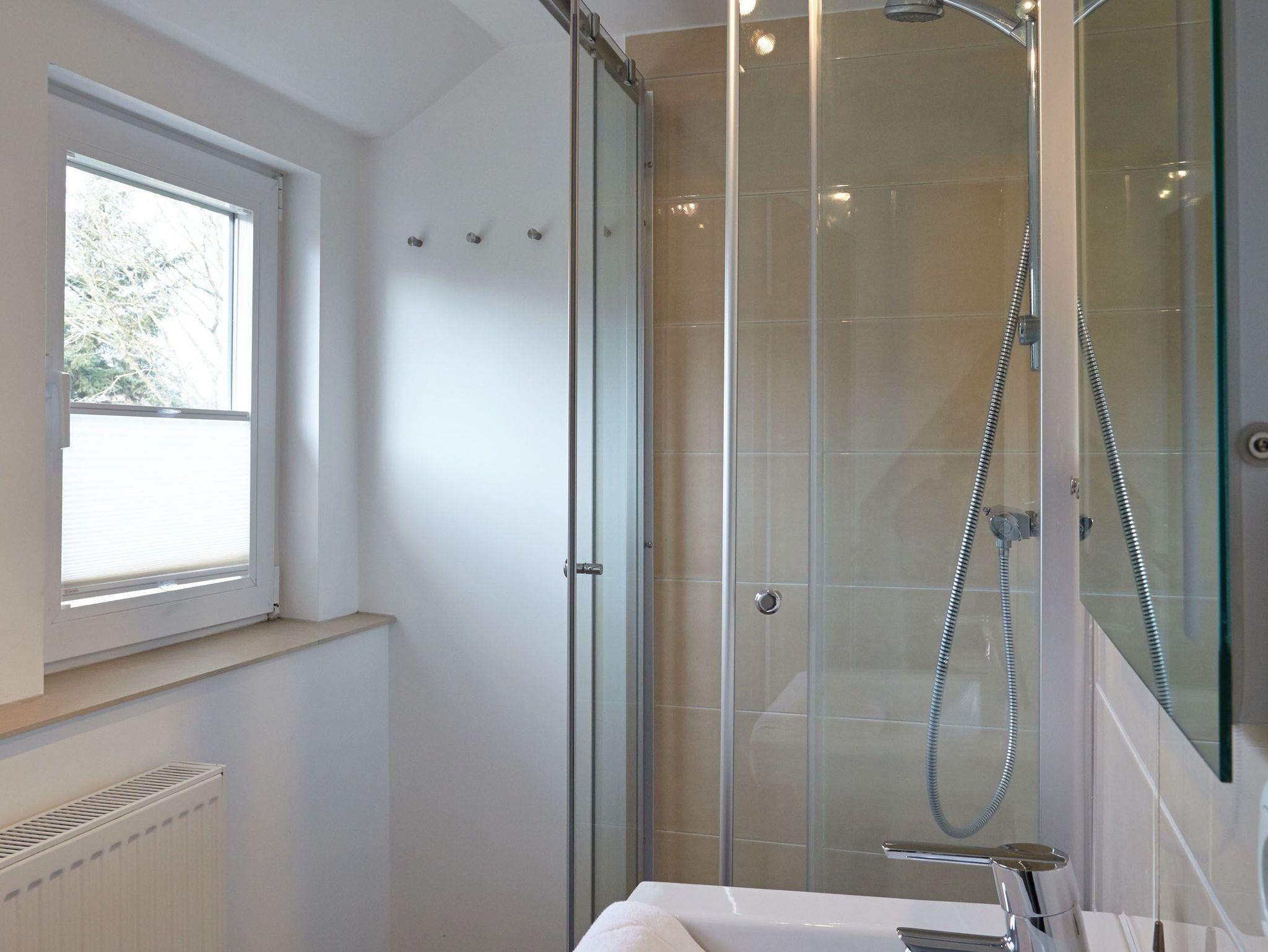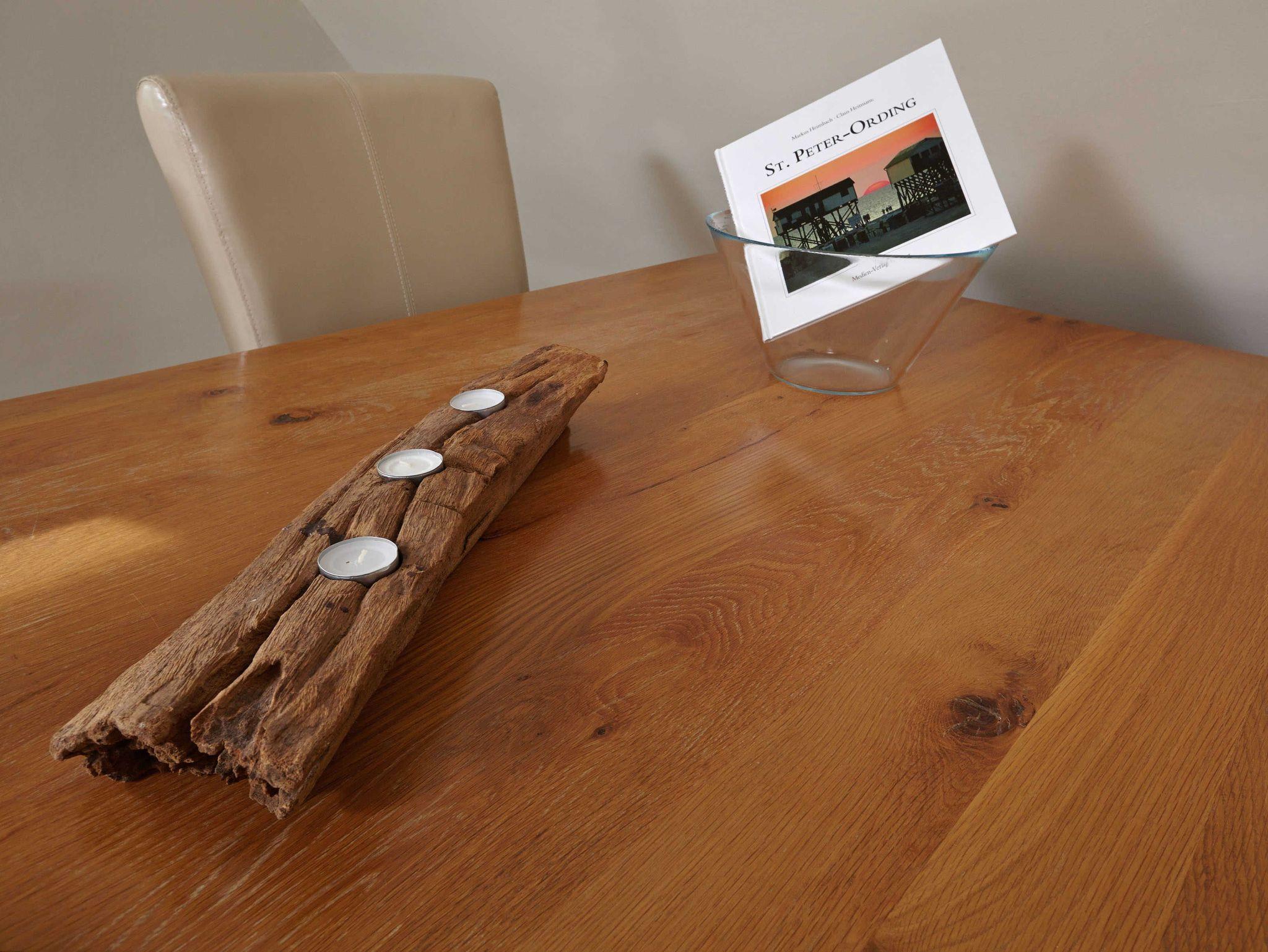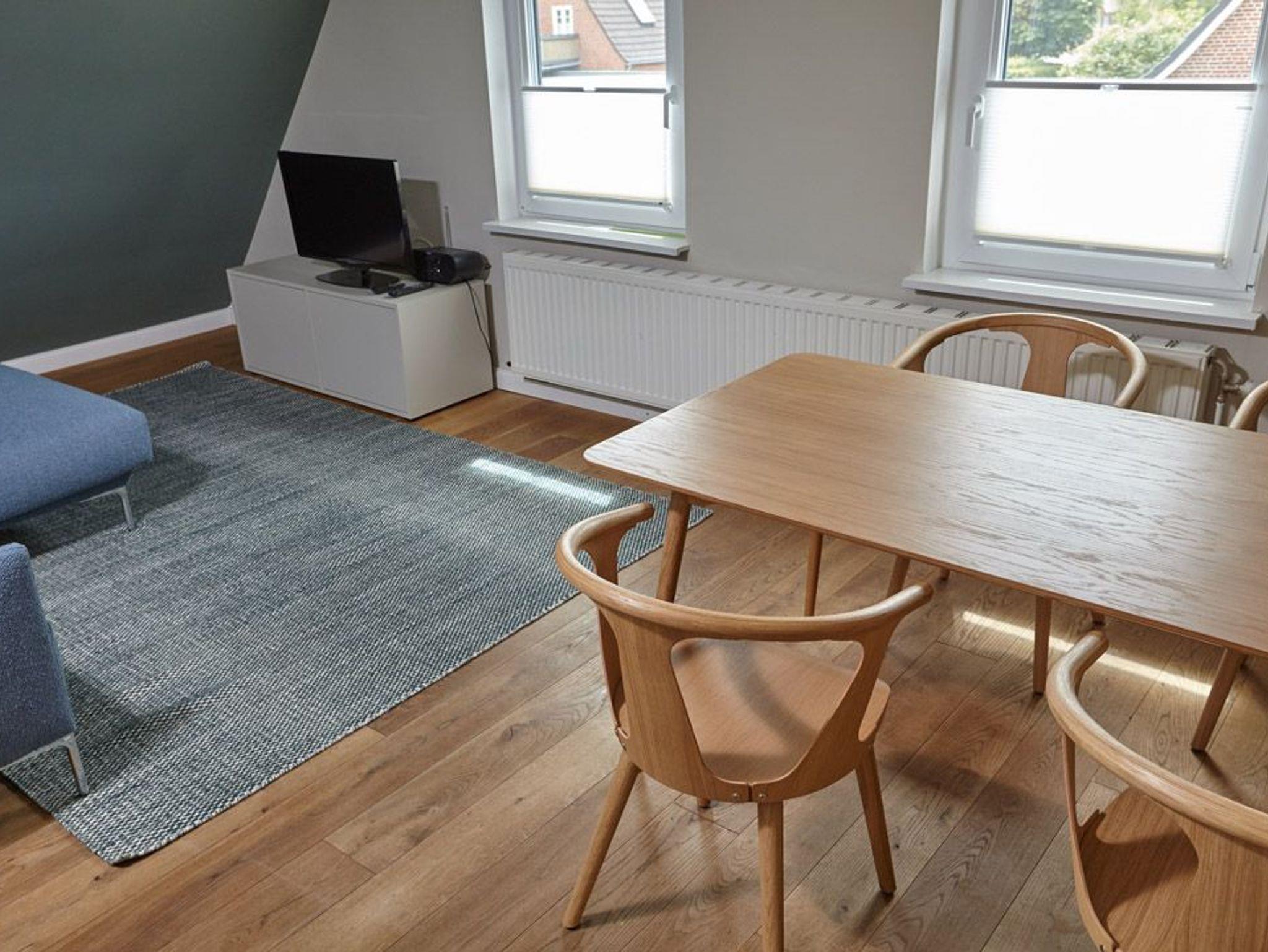 Die helle Wohnung im 1.OG besticht durch ihr modernes Interieur. Die Wohn-und Schlafräume sind mit einer Eichendiele ausgelegt. Das Wohnzimmer verfügt über Ledersofas, die nach einem Tag am Strand zum Chillen einladen. Gespeist wird an einer großen Tafel. In der Küche kann auch ein ordentliches Dinner zubereitet werden, da sie über alle erdenklichen Utensilien und Geräte deutscher Markenhersteller verfügt. Das Duschbad ist aufwendig gefliest und selbstverständlich vom WC separiert. Die Schlafzimmer laden durch ihr freundliches Ambiente zum Träumen ein. Geschmackvolle Ölbilder einer norddeutschen Malerin runden das Ambiente ab.