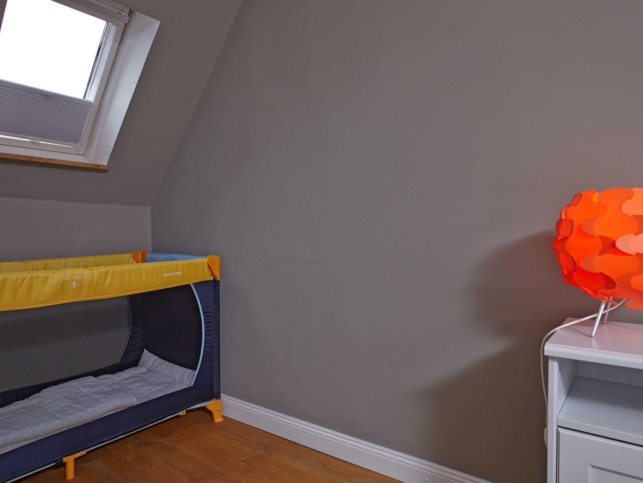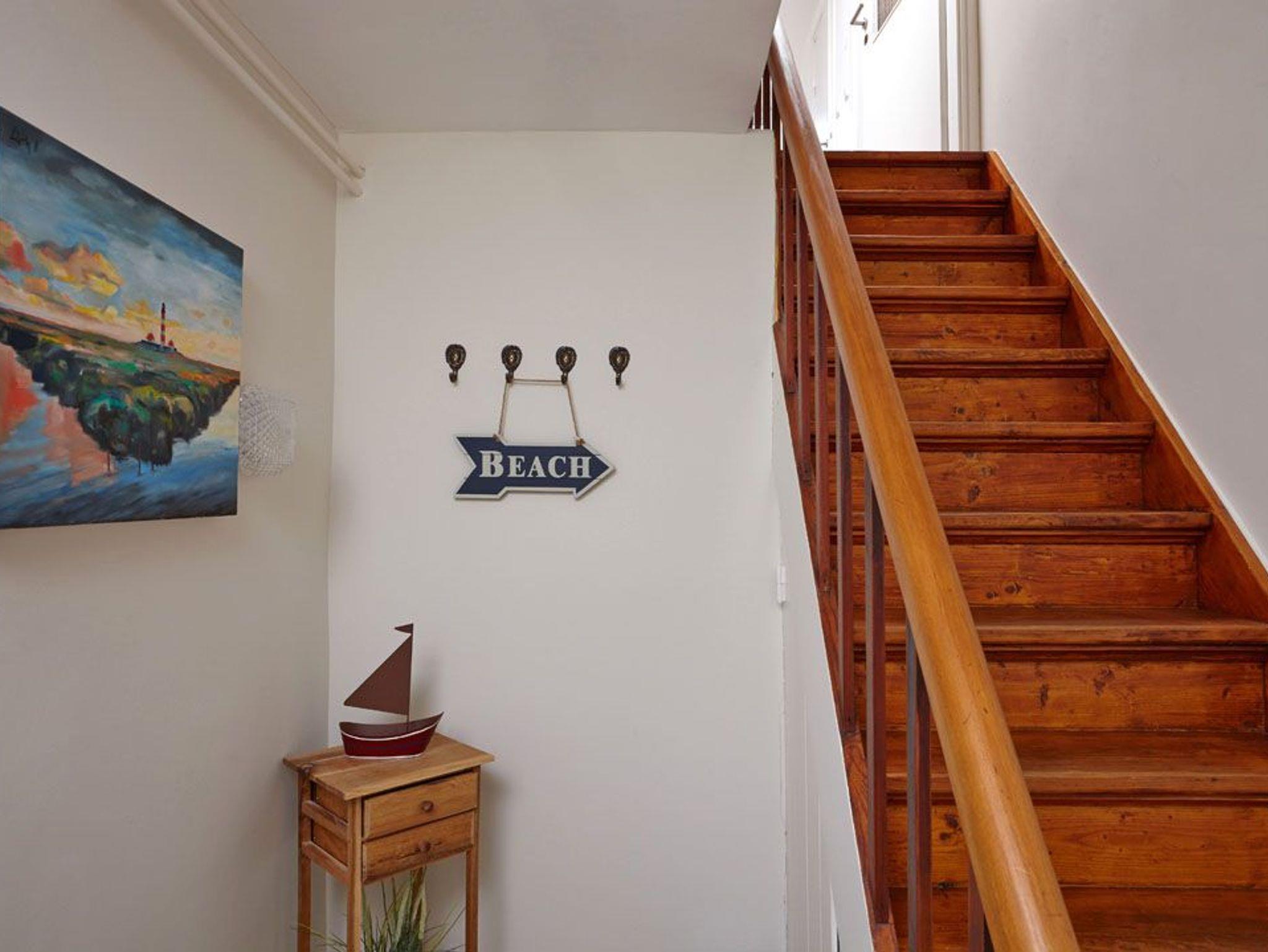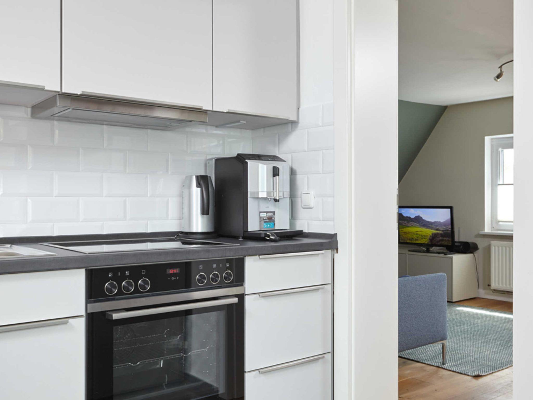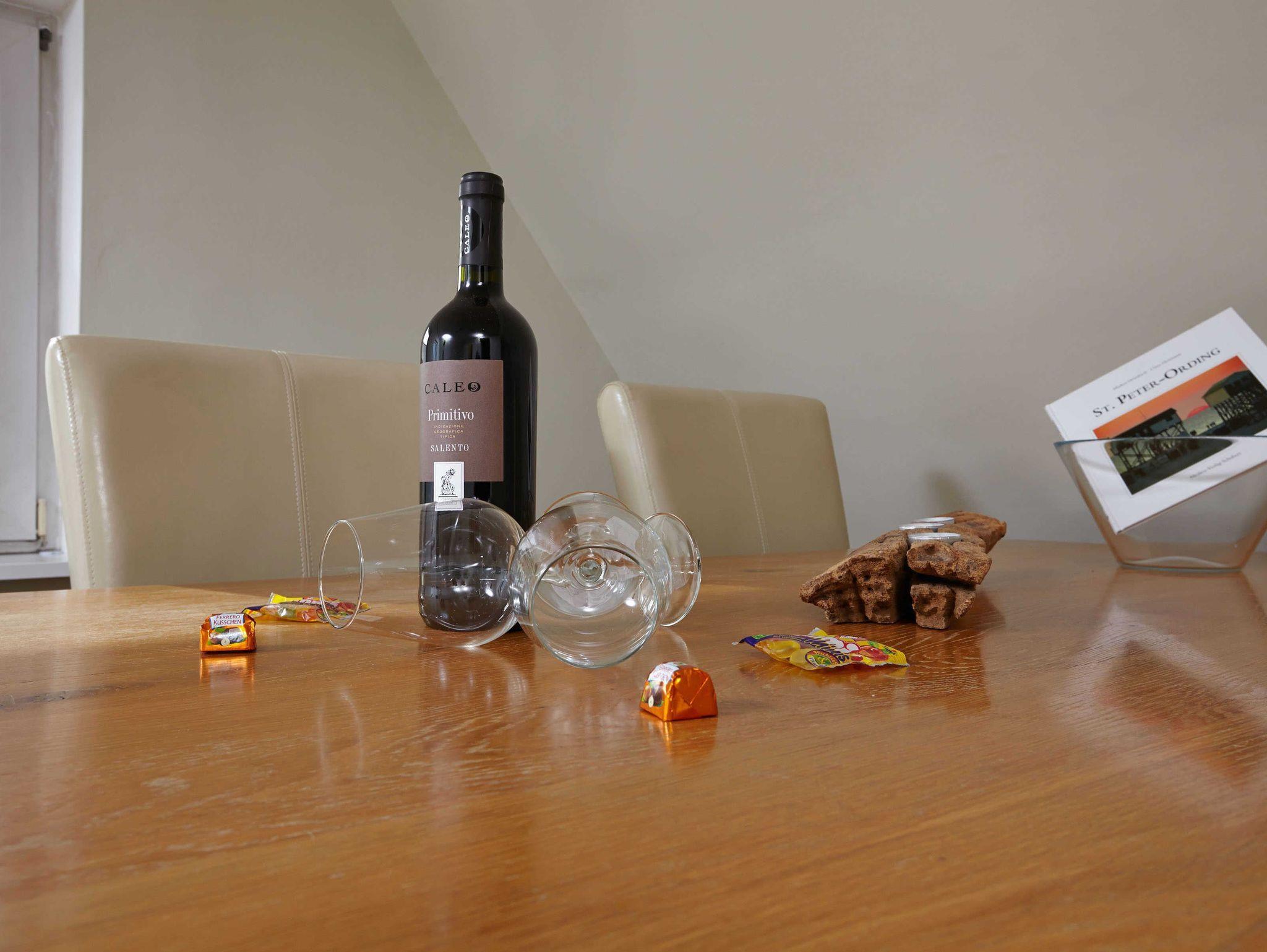 Die helle Wohnung im 1.OG besticht durch ihr modernes Interieur. Die Wohn-und Schlafräume sind mit einer Eichendiele ausgelegt. Das Wohnzimmer verfügt über Ledersofas, die nach einem Tag am Strand zum Chillen einladen. Gespeist wird an einer großen Tafel. In der Küche kann auch ein ordentliches Dinner zubereitet werden, da sie über alle erdenklichen Utensilien und Geräte deutscher Markenhersteller verfügt. Das Duschbad ist aufwendig gefliest und selbstverständlich vom WC separiert. Die Schlafzimmer laden durch ihr freundliches Ambiente zum Träumen ein. Geschmackvolle Ölbilder einer norddeutschen Malerin runden das Ambiente ab.