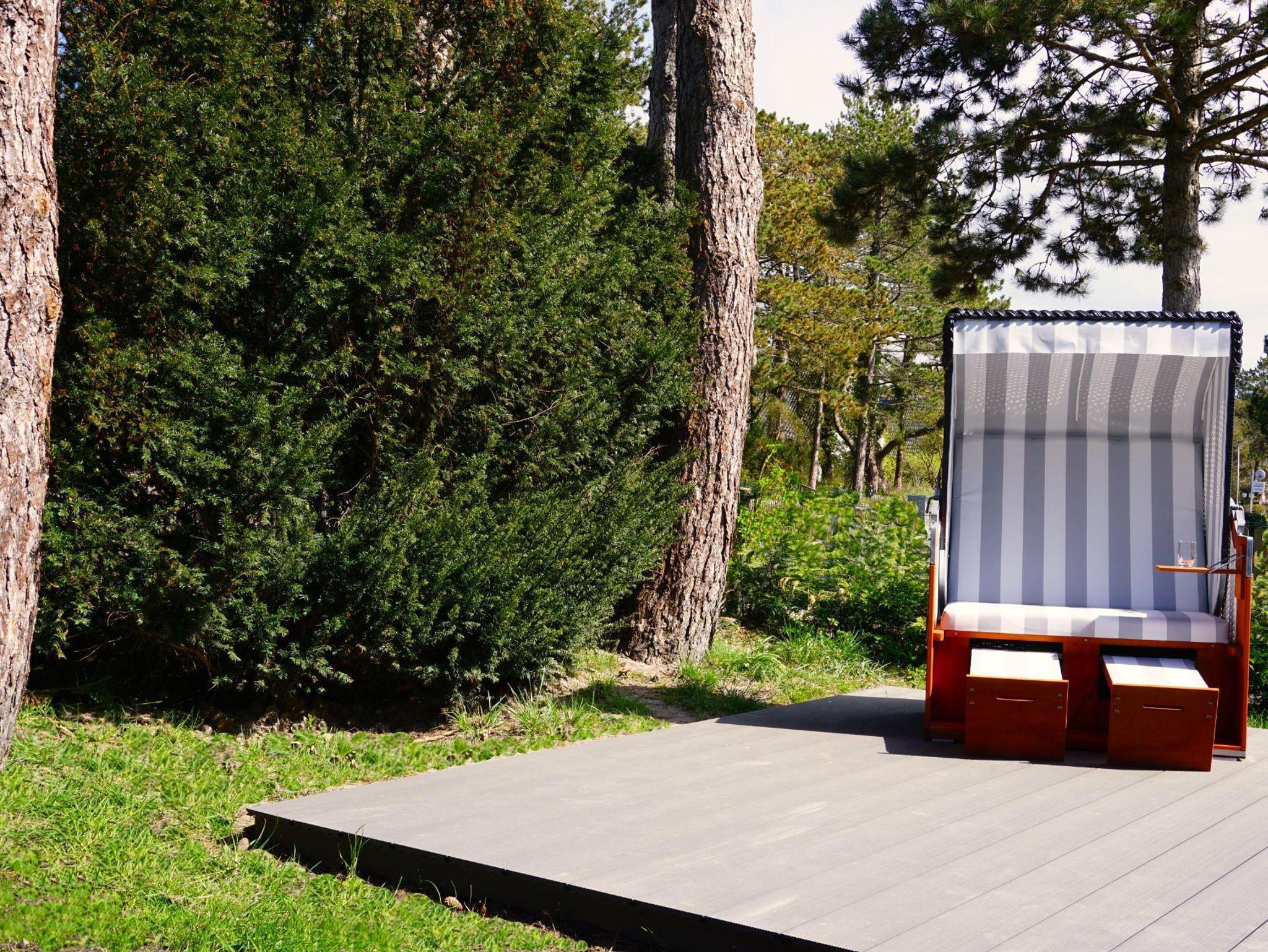 Die Ferienwohnung Strandmuschel Garden Suite im Erdgeschoss (96 m²) bietet Platz für bis zu 6 Personen (geeignet für maximal 3 Erwachsene und 3 Kinder) und besticht durch das Wohlfühl-Bad mit Walk-In-Dusche, die Terrasse mit eigenem Garten, eine hochwertige vollständige Ausstattung, einen XXL-Kühlschrank und kostenfreies WLAN.