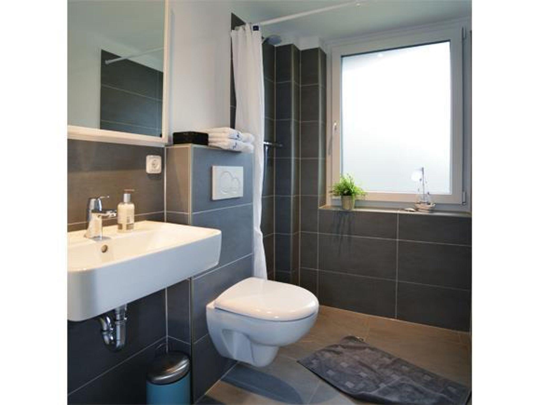 Im Badezimmer befindet sich eine Dusche, Waschtisch, WC und Haarfön.