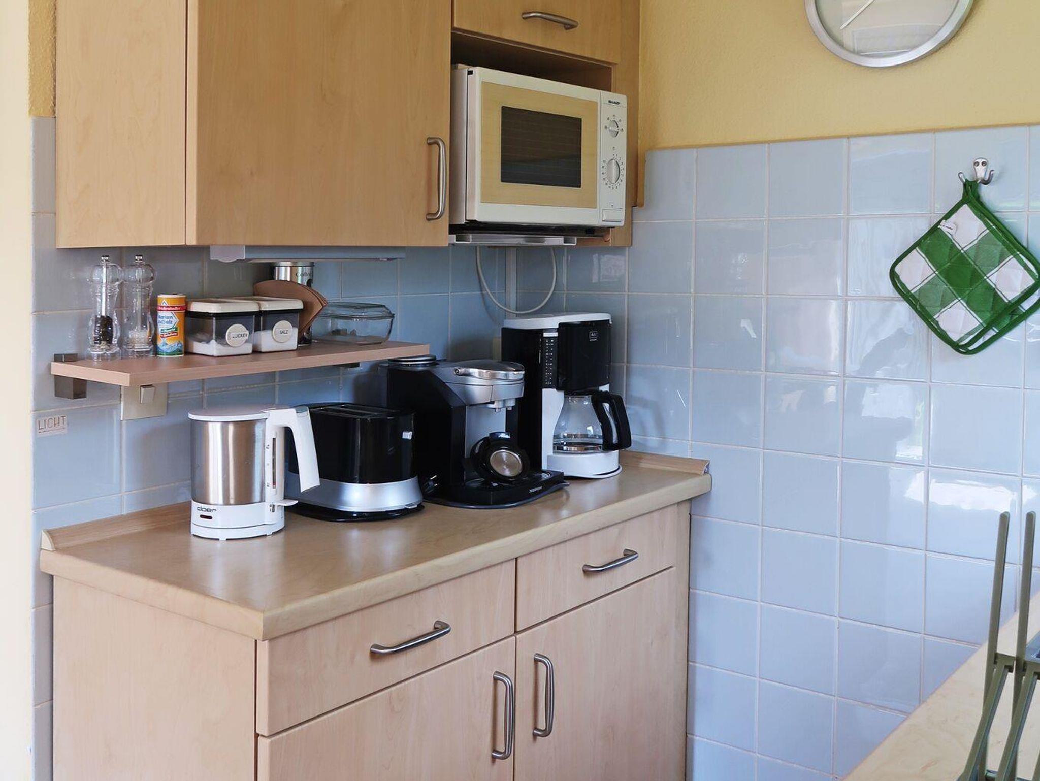 Eine offene Einbauküche ist wie folgt ausgestattet: Herd mit Backofen (mit Umlauft) und Ceranfeld, Mikrowelle, Wasserkocher, Toaster, Kaffeemaschine,... Das Bad ist gefliest, im Rest der Wohnung liegt Eichenparkett und ist somit allergikerfreundlich gestaltet.