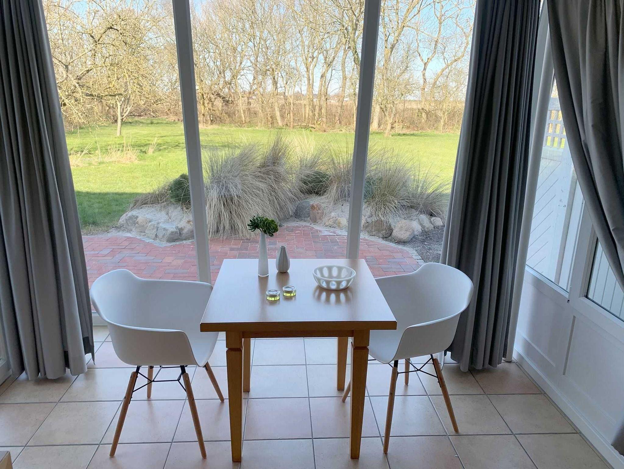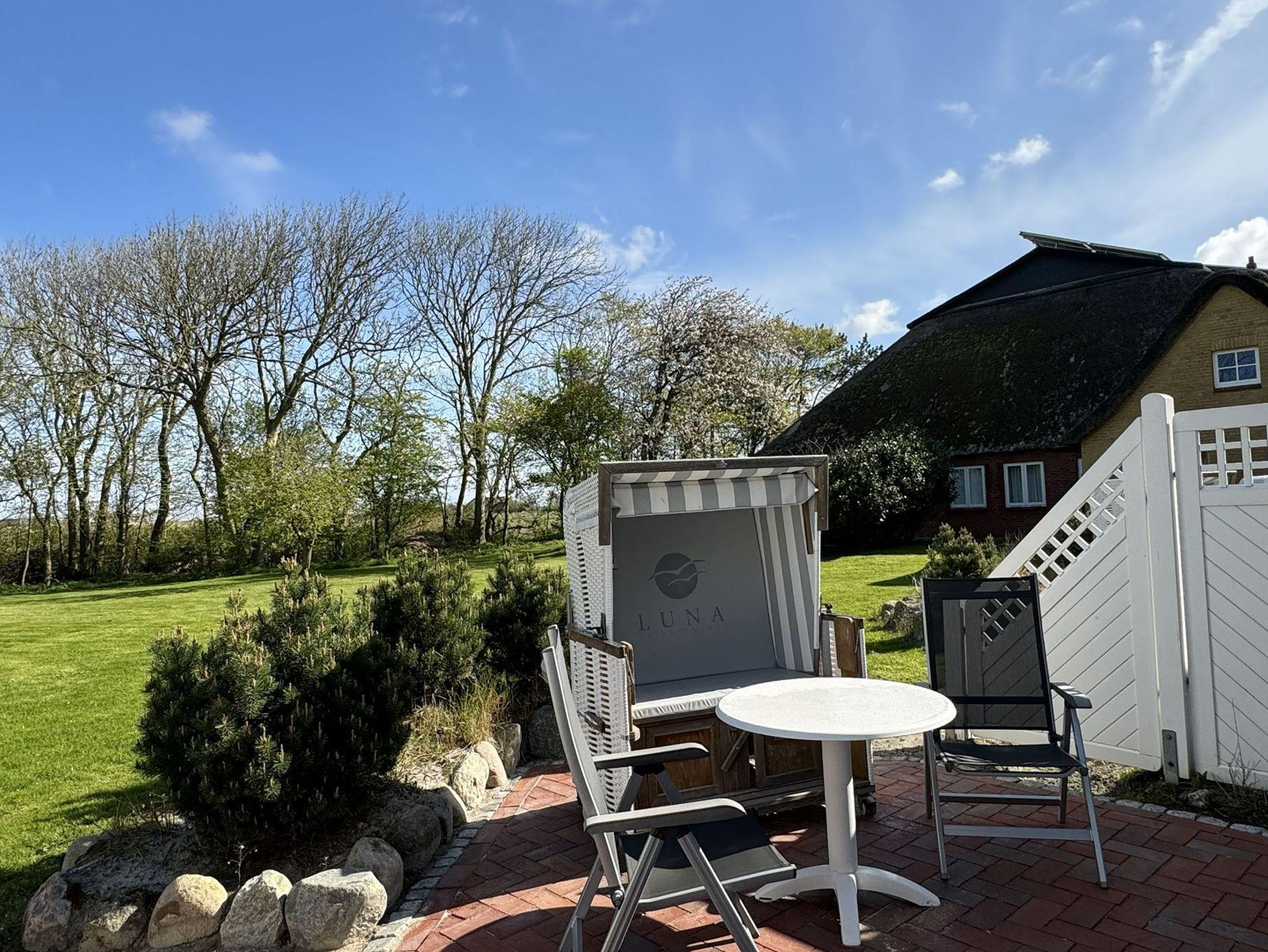 Helle, strandnahe Ferienwohnung in St. Peter-Ording im Erdgeschoß mit Terrasse mit Blick in den Obstgarten für 2 Personen.