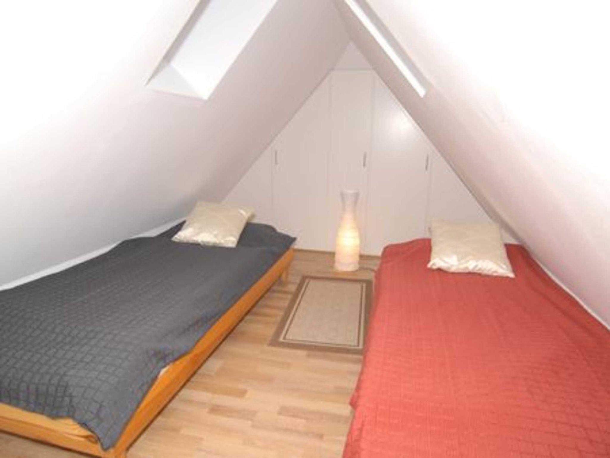 Gemütliche Schlafmöglichkeiten: Genießen Sie erholsame Nächte in den komfortablen 2 Einzelbetten im Dachgeschoss und dem einladenden Boxspringbett im Wohnbereich.