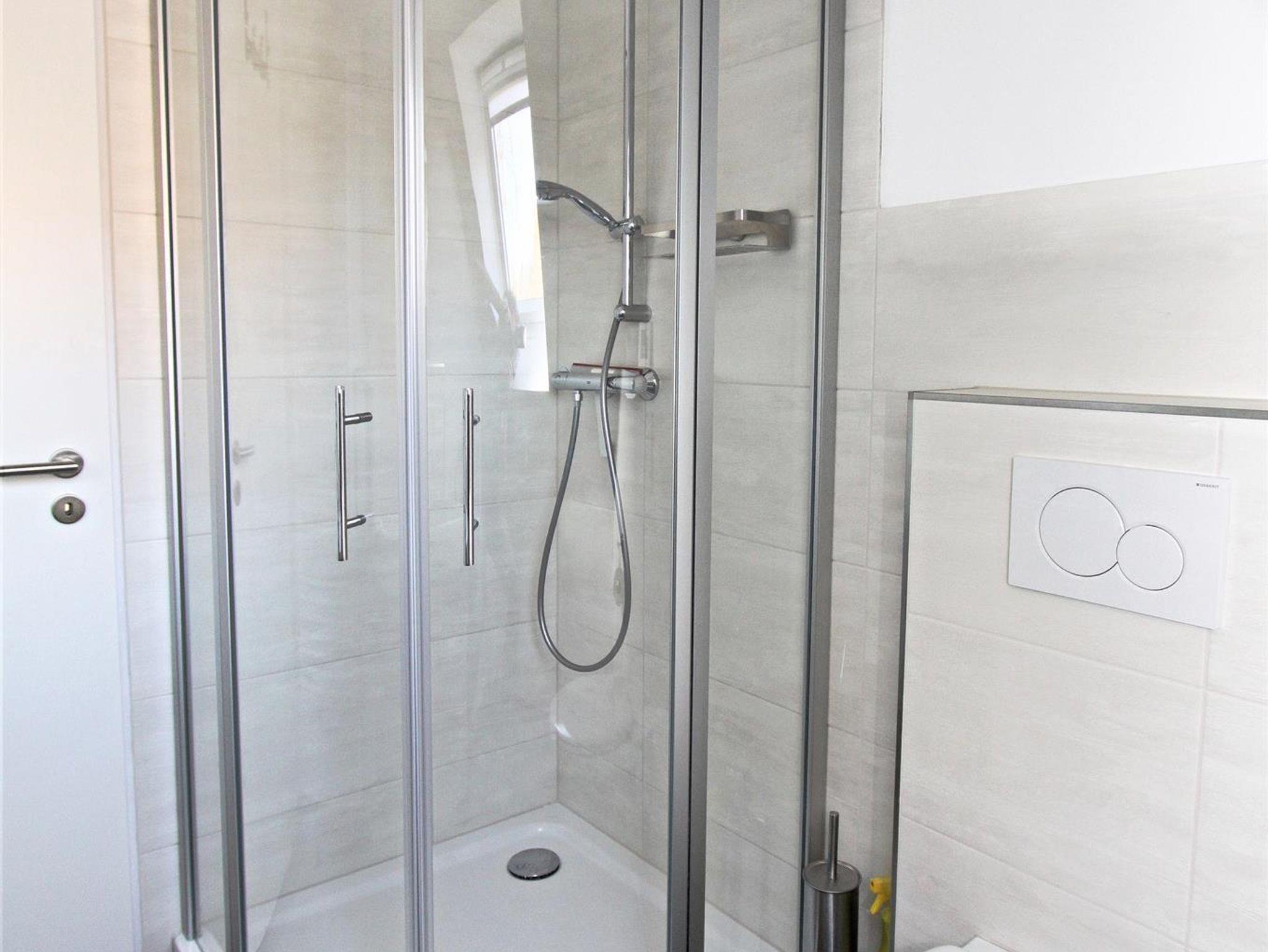 Das 2021 vollständig modernisierte Badezimmer ist ausgestattet mit Dusche, Handtuchheizkörper, Waschtisch und WC.