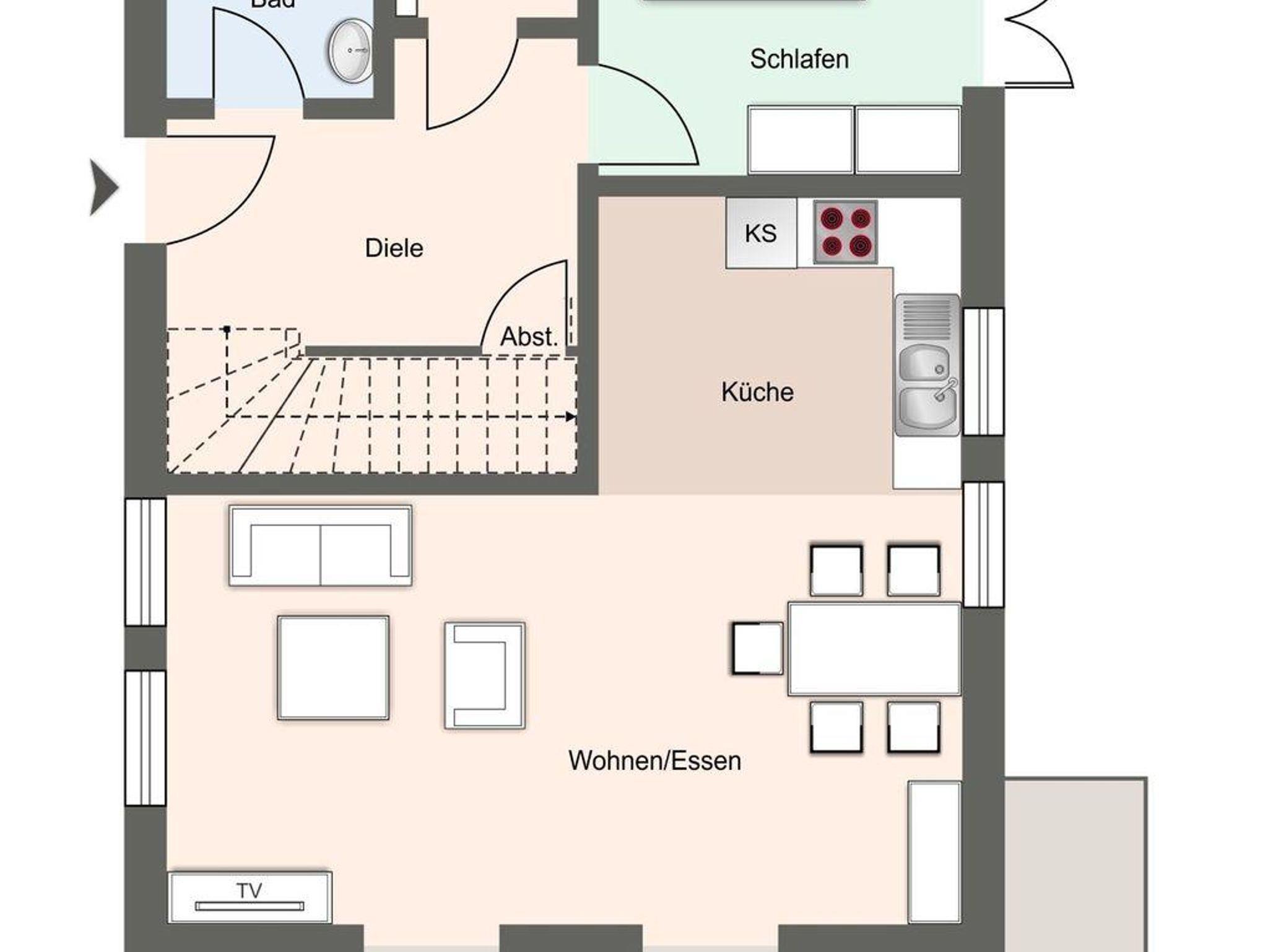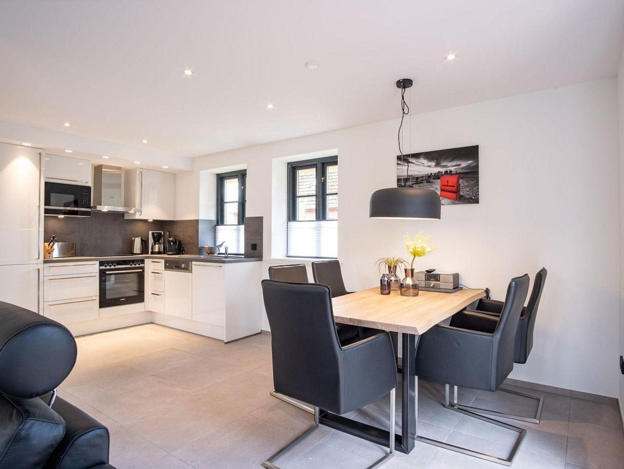 Im Erdgeschoss befindet sich der lichtdurchflutete Wohnraum mit TV, einer luxuriösen, angrenzenden Küche sowie einem stilvollen Essbereich. Der Wohnraum ist mit modernen, stylischen Möbeln eingerichtet. Die Küche verfügt über hochwertige Elektrogeräte und ist voll ausgestattet. An den Wohnbereich schließen sich ein Flur, ein Duschbad und ein Doppelschlafzimmer mit TV an.