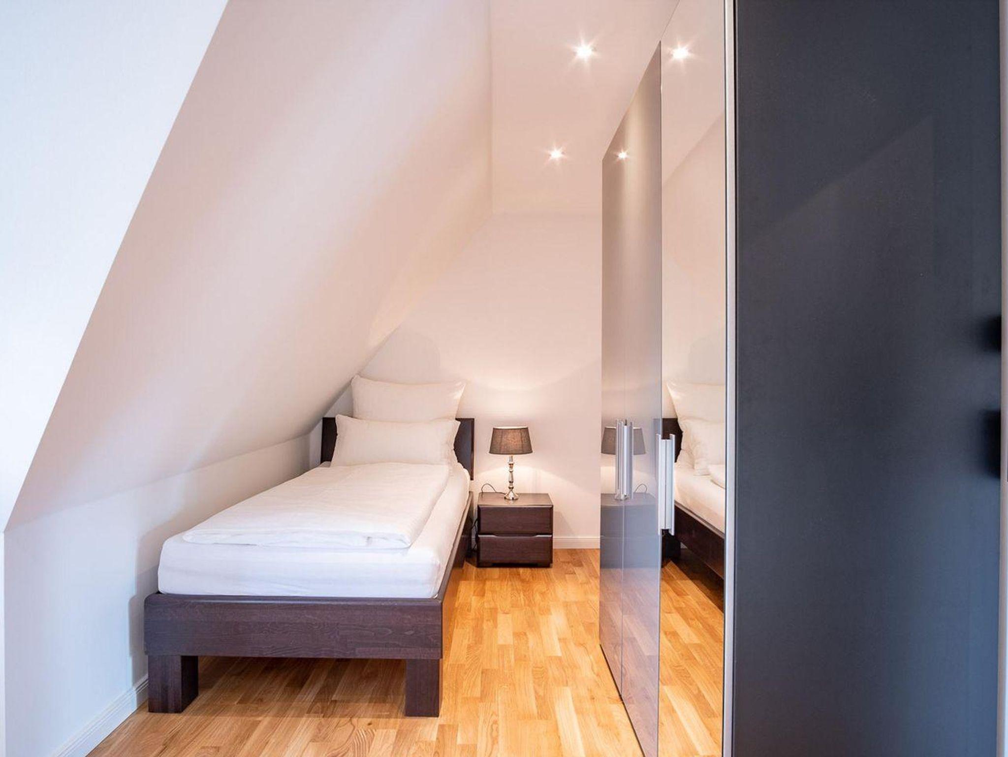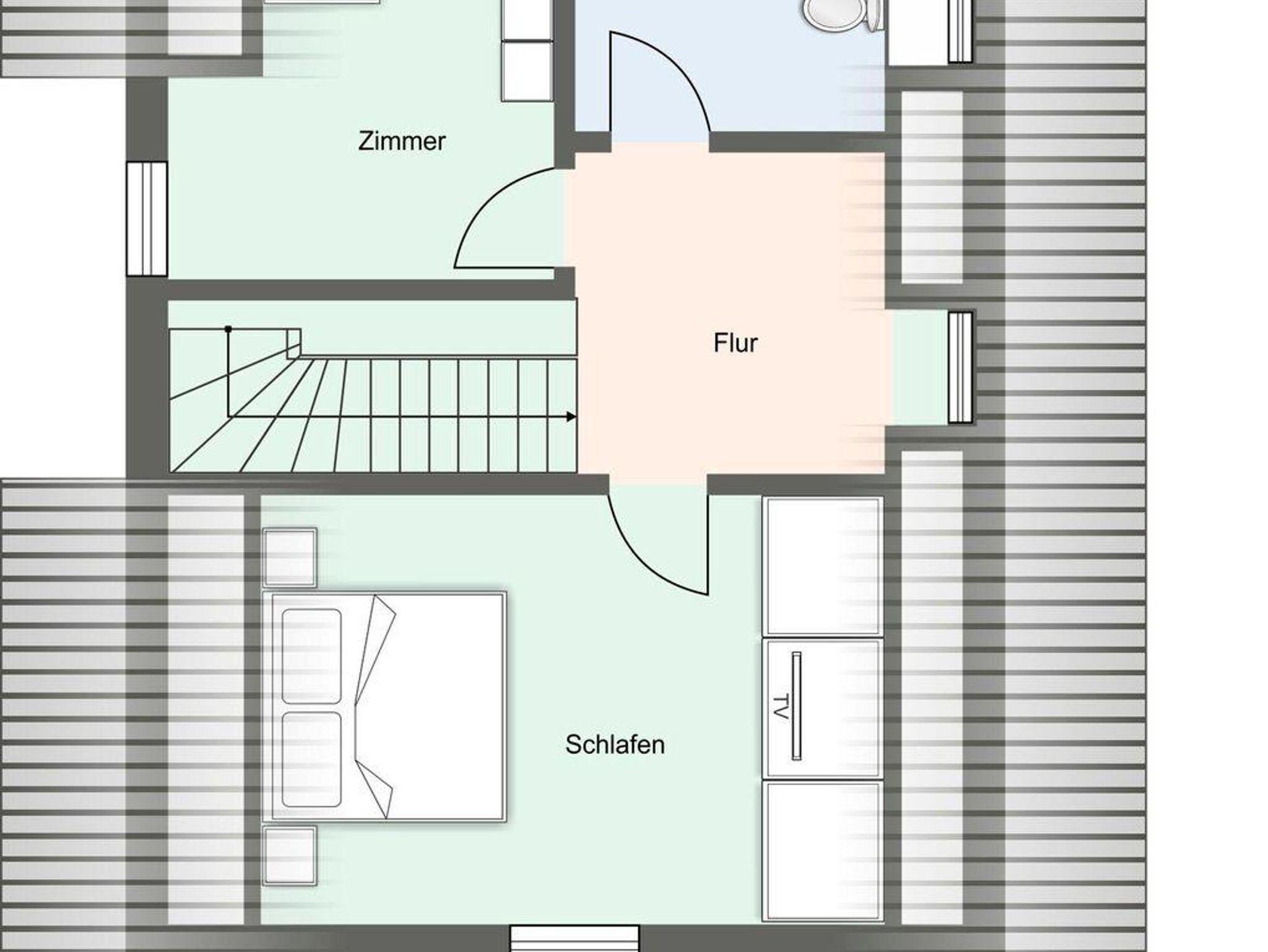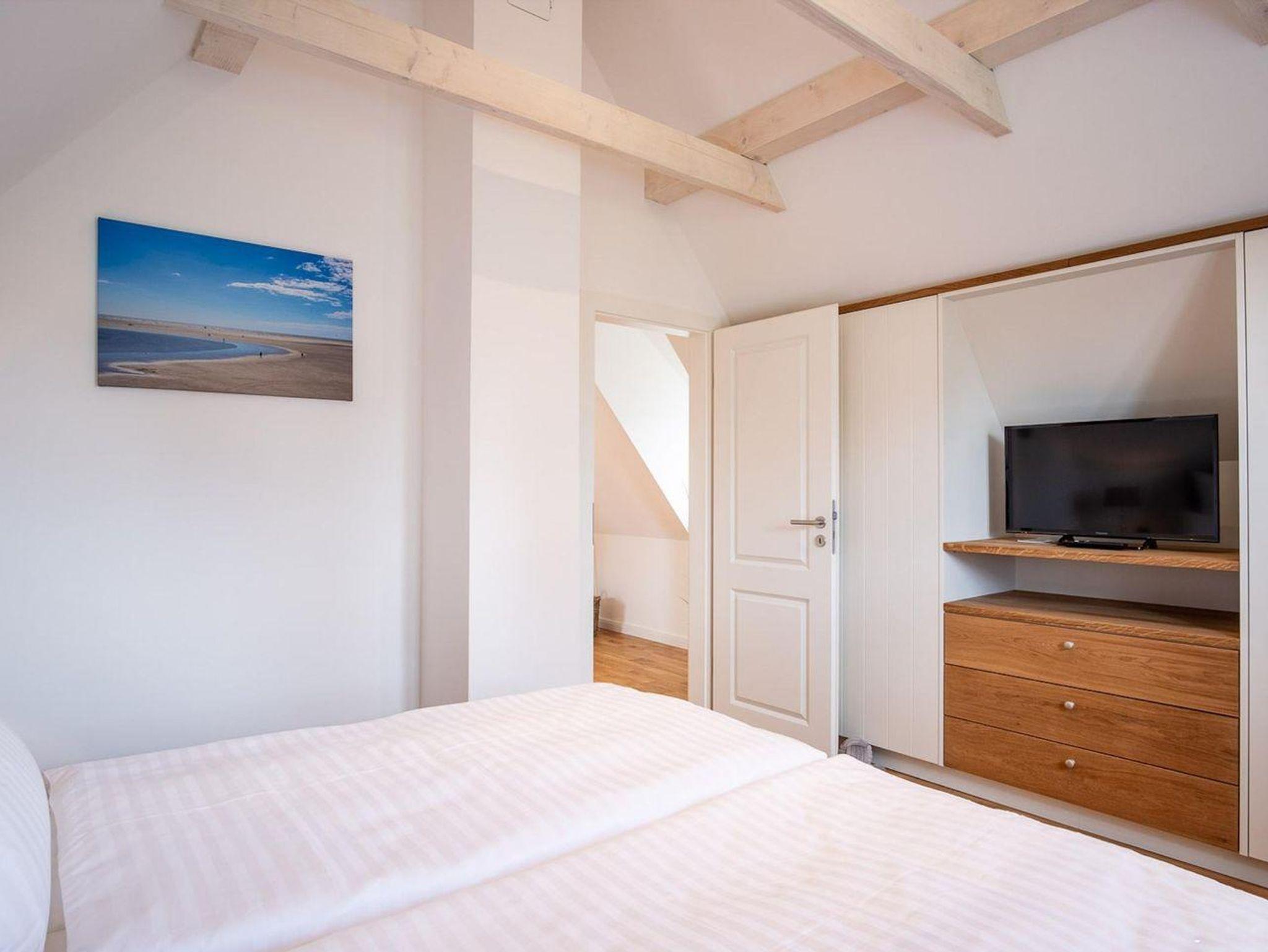 Über eine Holztreppe gelangt man in das Obergeschoss. Die beiden Schlafzimmer, eines mit Doppelbett und TV und das andere mit 1 Einzelbett, bieten ruhevolle Erholung.