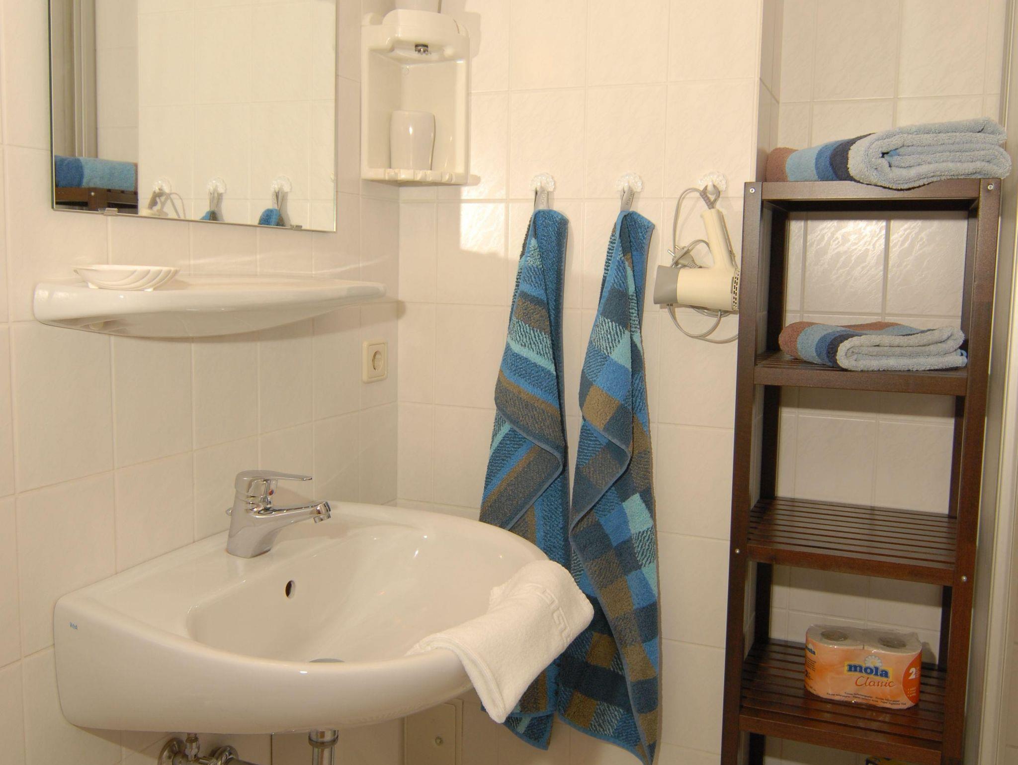 Bad Dusche, Waschbecken, WC, Duschkabine, Fön, Spiegel, Regal, Kosmetikspiegel