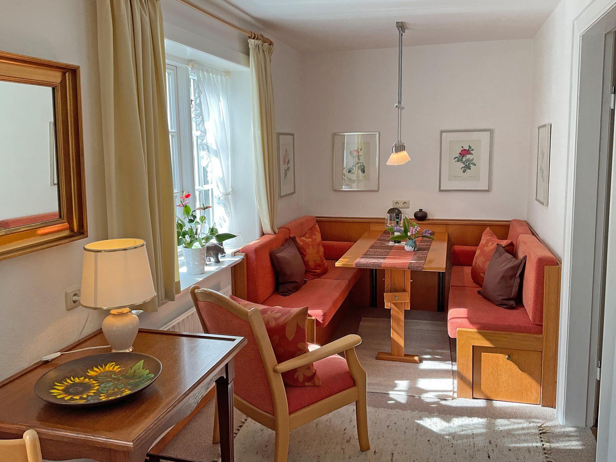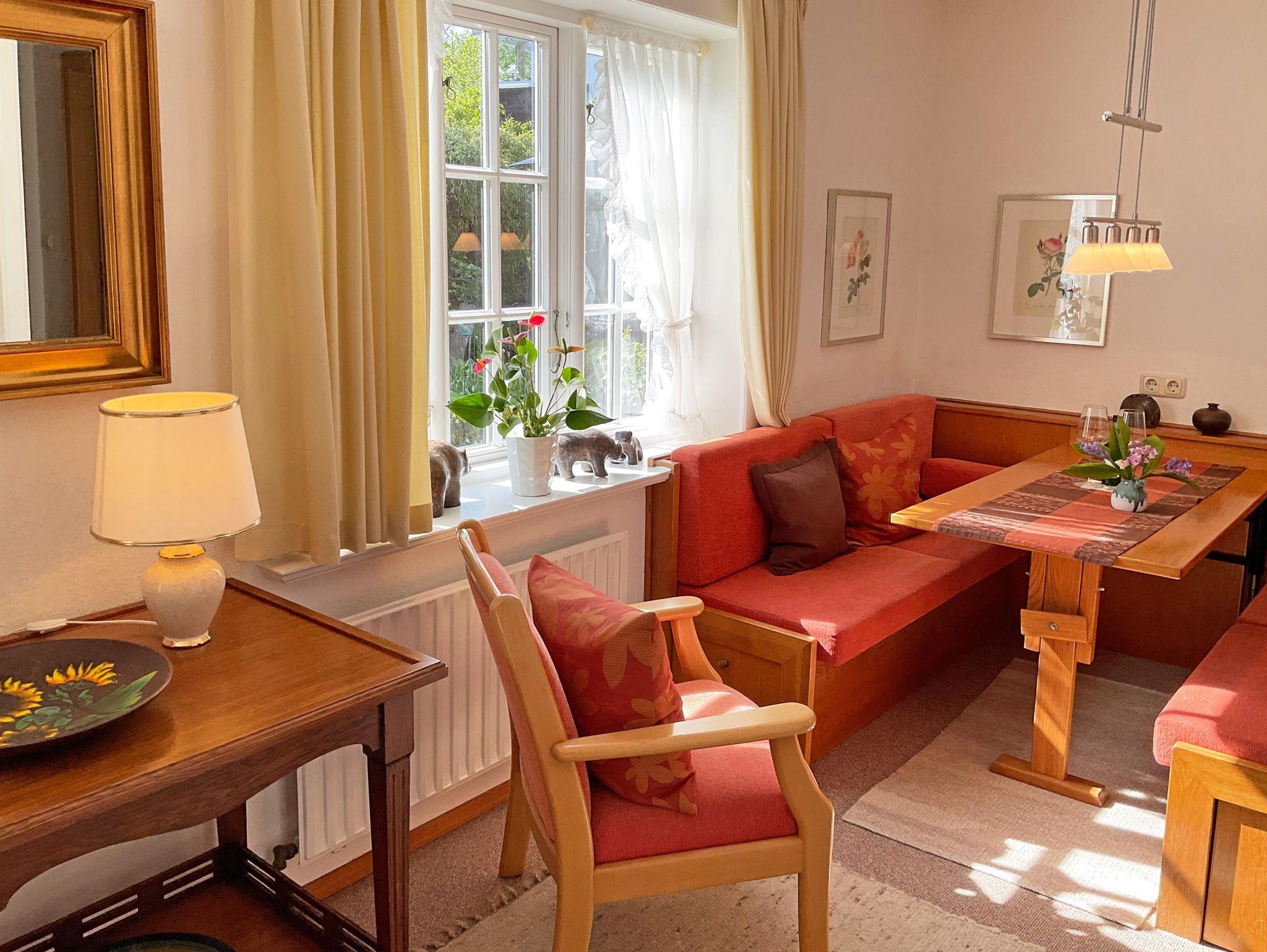 Der helle , gemütliche Raum mit einer Sitzgruppe und großem Tisch gibt den Blick in den herrlichem Garten frei.