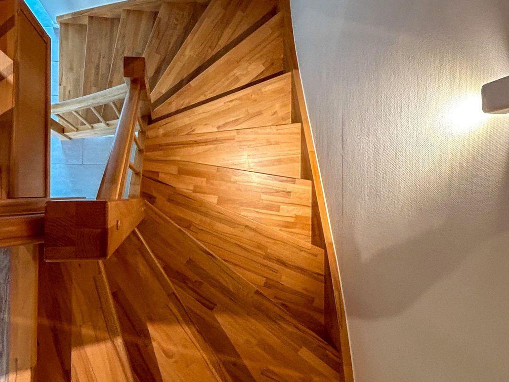 Eine massive Holztreppe führt in das Obergeschoss, wo Ihnen zwei Schlafzimmer mit jeweils einem Doppelbett (1,80 x 2,00) ungestörte Entspannung bieten. Ein großzügiges Vollbad ergänzt diese Etage. Im Dachgeschoss erwartet Sie ein Arbeitszimmer mit einem Schreibtisch, einem bequemen Stuhl, einem hochwertigen TV und einem ausziehbaren Schlafsessel (0,90 x 2,00).