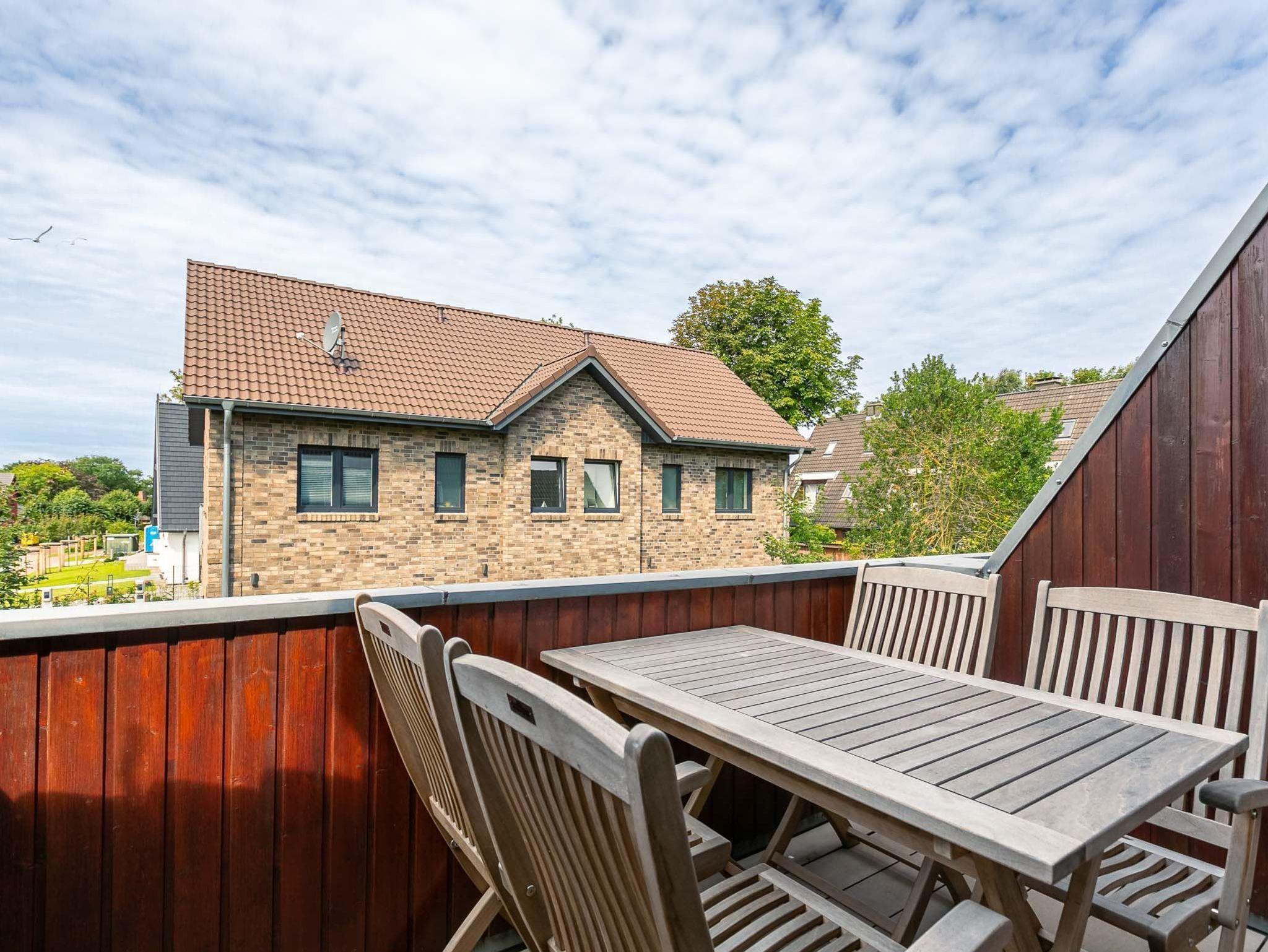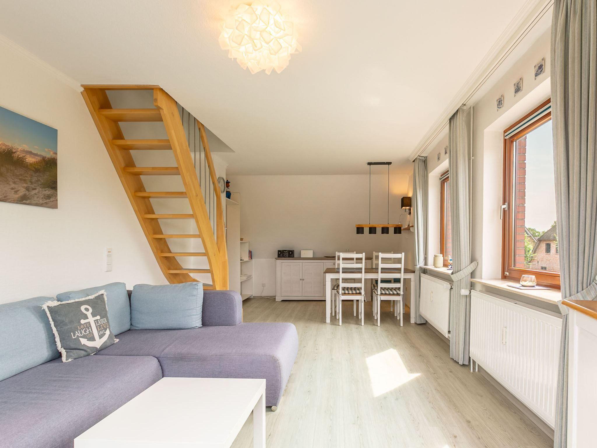 Wohnzimmer mit (ausklappbarem Schlaf-) Sofa (140x200cm), SMART-TV (Sat) und Esstisch für 4 Personen. Direkter Zugang zum möblierten und windgeschützten West-Balkon mit Markise. Vom Wohnzimmer führt eine steile Treppe zum Schlafzimmer. Offene Küche mit Backofen, Mikrowelle, Geschirrspüler, Kühlschrank, sep. Gefrierschrank, Philips Senseo Kapsel-Kaffeemaschine und Frühstückstisch für 2 Personen.