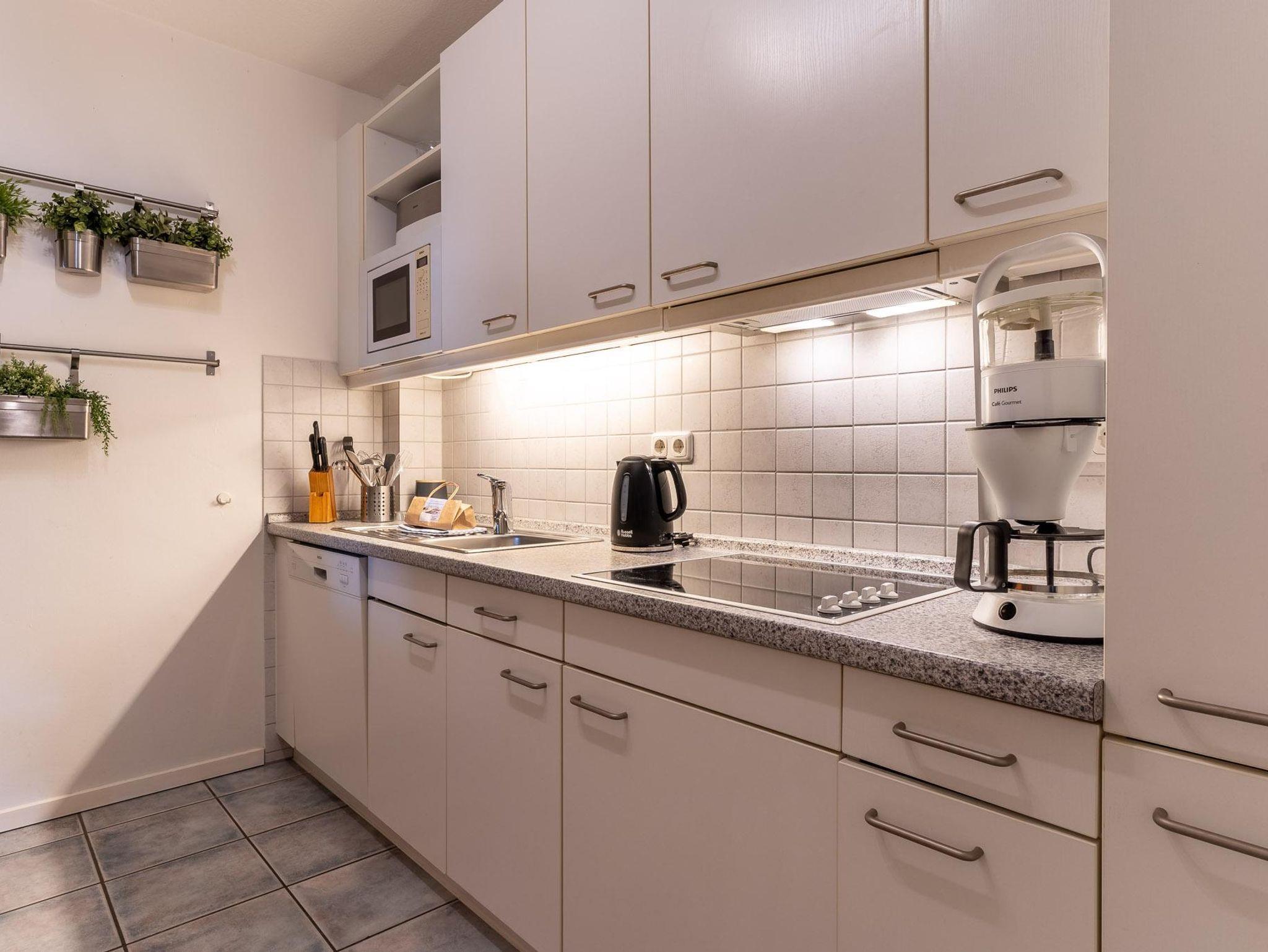 In der separaten Küche befindet sich ein Esstisch, eine Spülmaschine, Mikrowelle und ein Kühlschrank mit Gefrierfach.