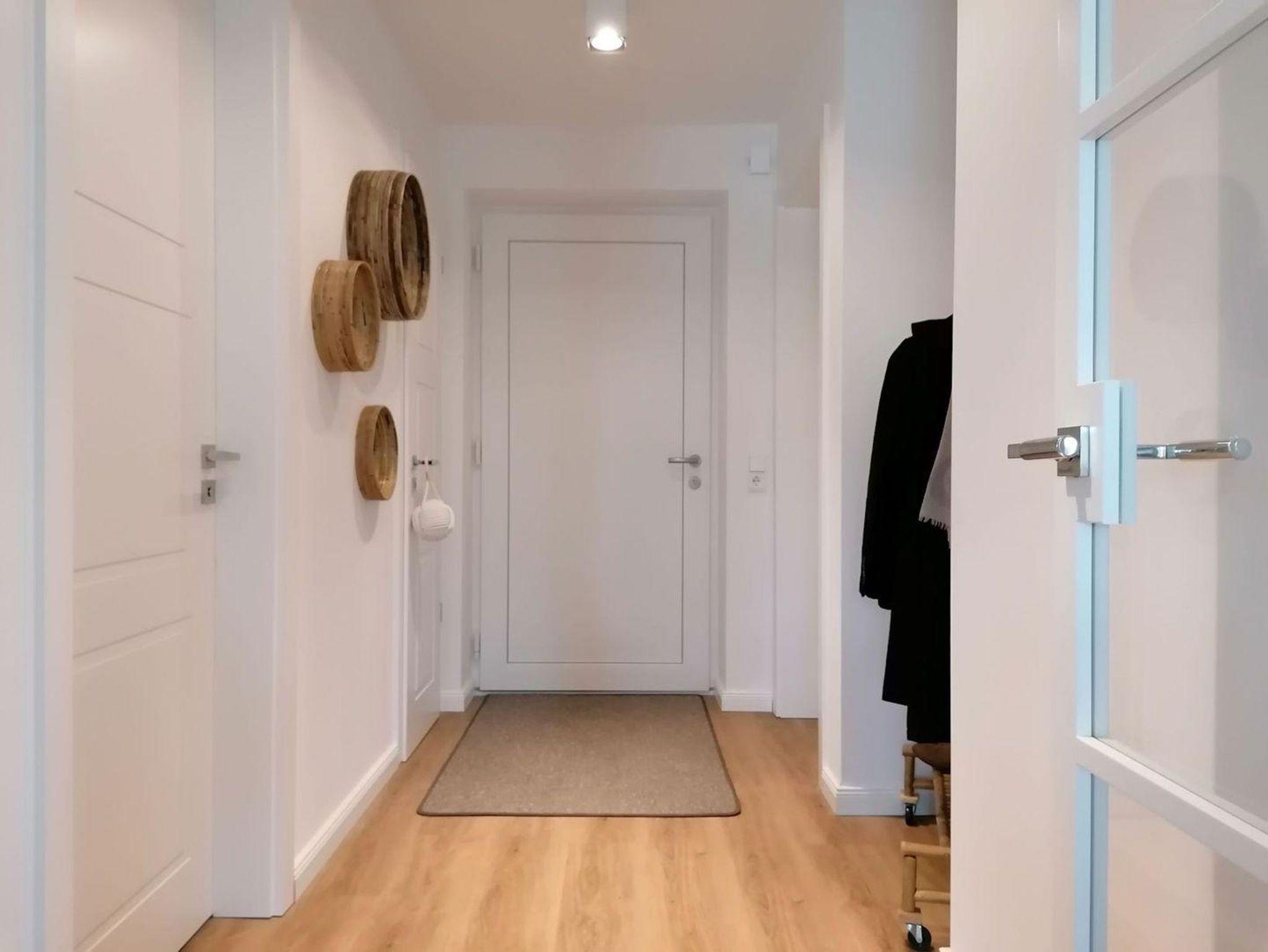 Vom Flur mit Garderobe, welche ausreichend Platz für Jacken und Schuhe bietet, gelangen Sie in ein Duschbad. Außerdem befindet sich im Erdgeschoss ein Arbeitszimmer.