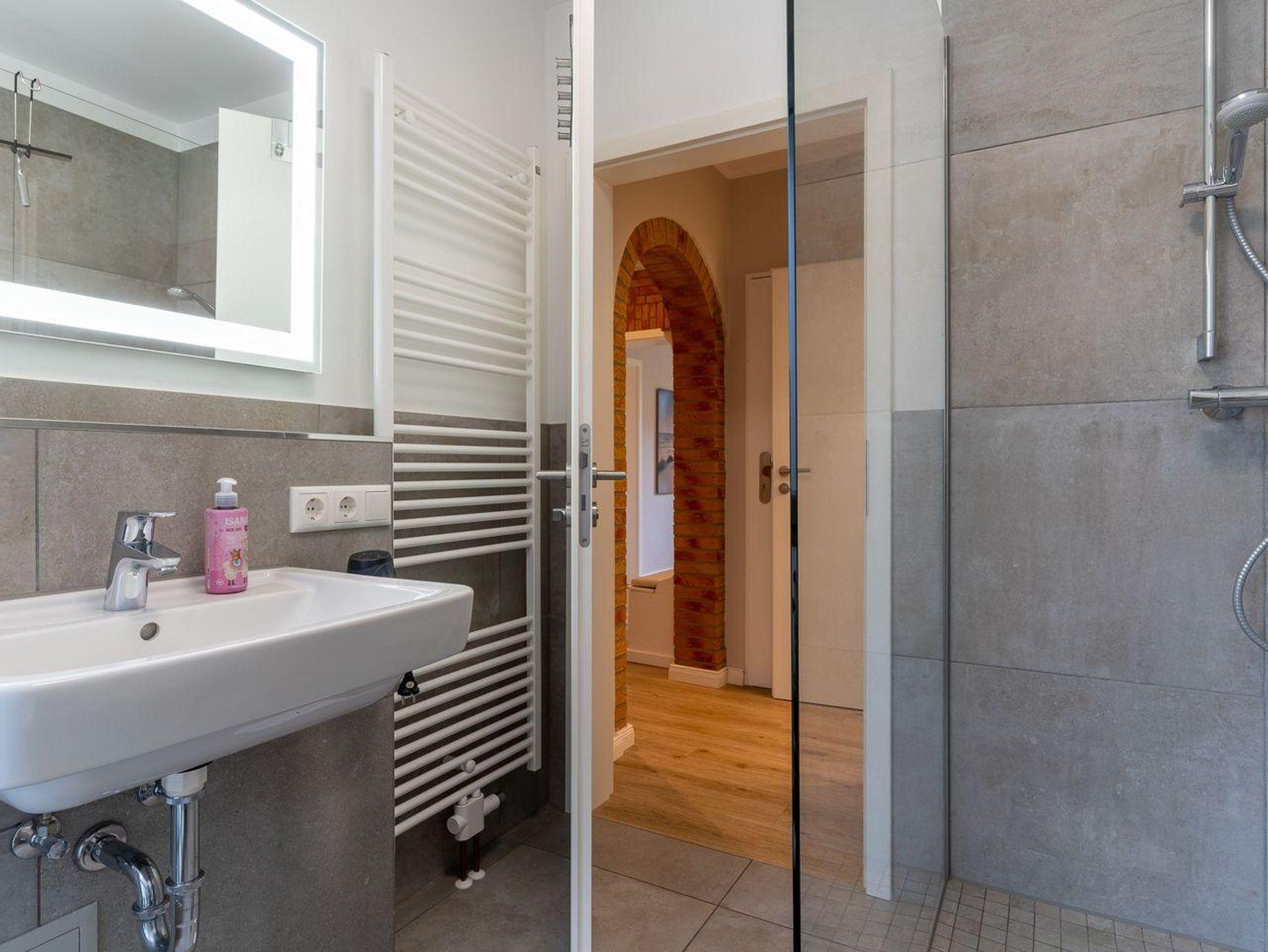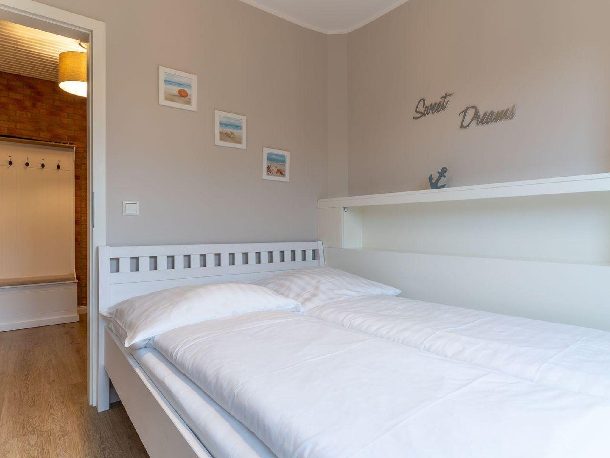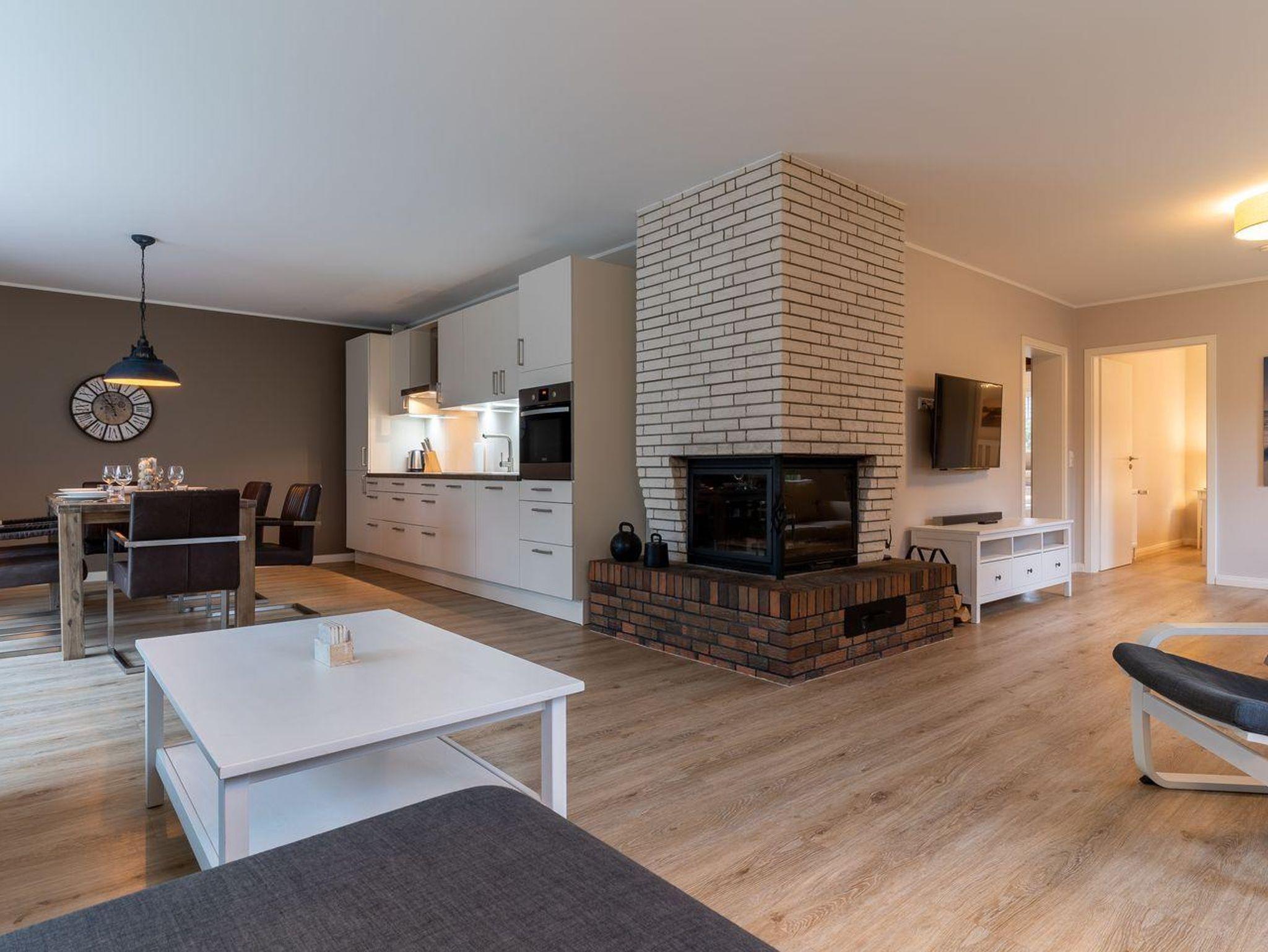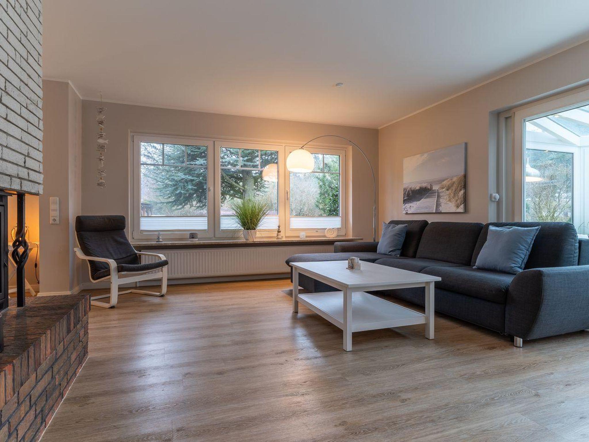 Die Wohnung befindet sich im Erdgeschoss und hier befindet sich der lichtdurchflutete und sehr großzügige Wohnraum mit TV, Kamin und einem stilvollen Essbereich, sowie einer modernen Wohnküche. Die Wohnräume sind mit neuen und modernen Möbeln ausgestattet. An den Wohnbereich schließen sich ein Flur mit Garderobe, und ein Duschbad, sowie ein Gäste WC an.Die beiden Schlafzimmer sind jeweils mit einem Doppelbett ausgestattet (1,80 x 2,00 und 1,40 x 2,00 m) und die Kleiderschränke gewähren Ihnen hinreichend Ablageflächen. Zusätzlich gibt es im Wohnzimmer ein gemütliches Schlafsofa für 2 Personen. Darüber hinaus befindet sich am Wohnzimmer ein großer Wintergarten und bringt Sie sofort in Urlaubsstimmung.Das Grundstück mit Stellplatz, Rasenfläche und einer geschützten Terrasse ist mit heimischen Pflanzen angelegt.