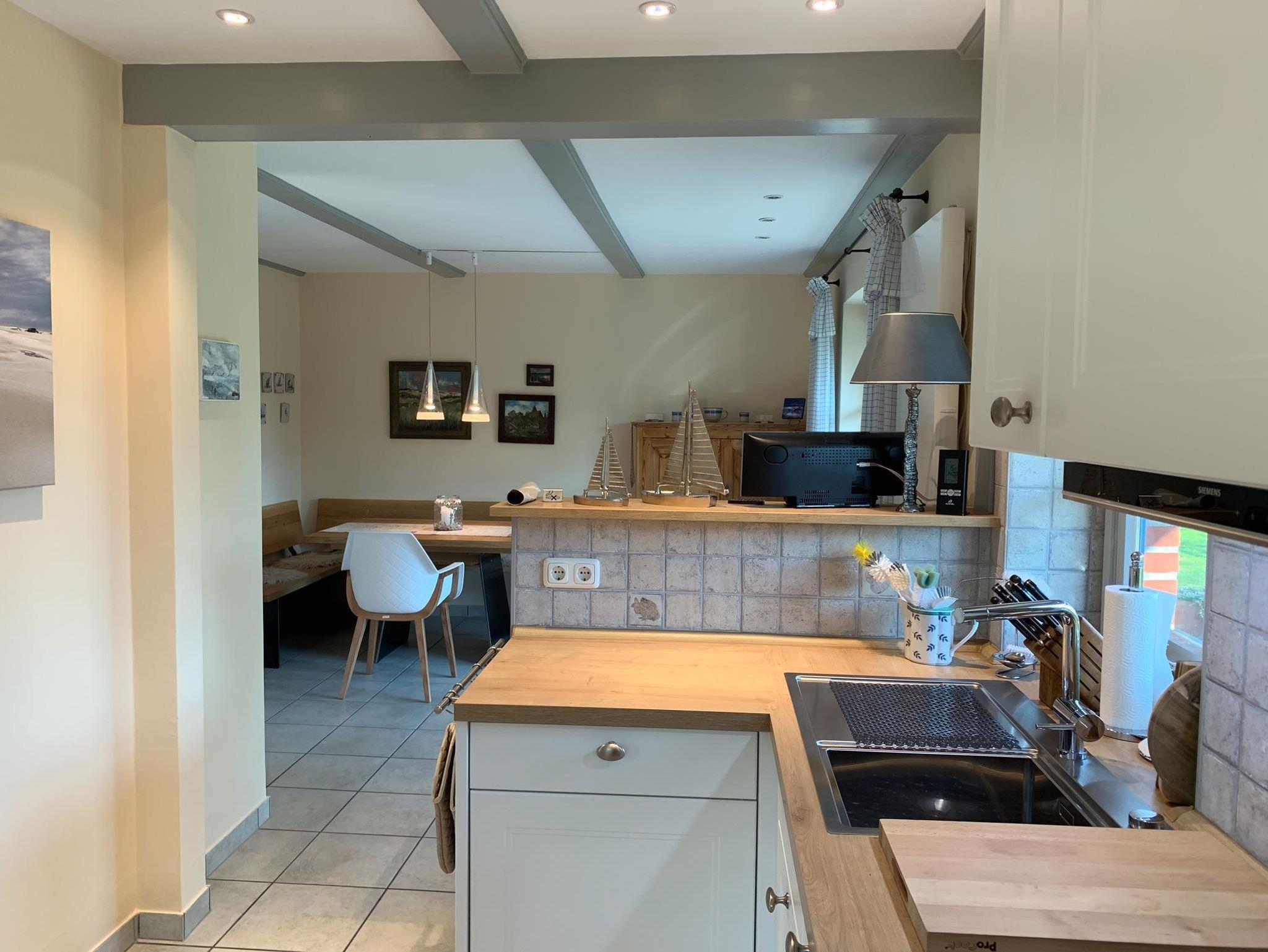 KücheEinbauküche, 4 Plattenherd mit Ceranfeld und Backofen, Dunstabzugshaube, Kühlschrank, Spülmaschine, Mikrowelle, Kaffeemaschine, Wasserkocher, Toaster, Handmixer, Stabmixer, Geschirr, Kochtöpfe, Esstisch, Eckbank, 2 Korbstühle, Rollwagen, Vertico, Anrichte, Kabel-TV, Flachbildschirm