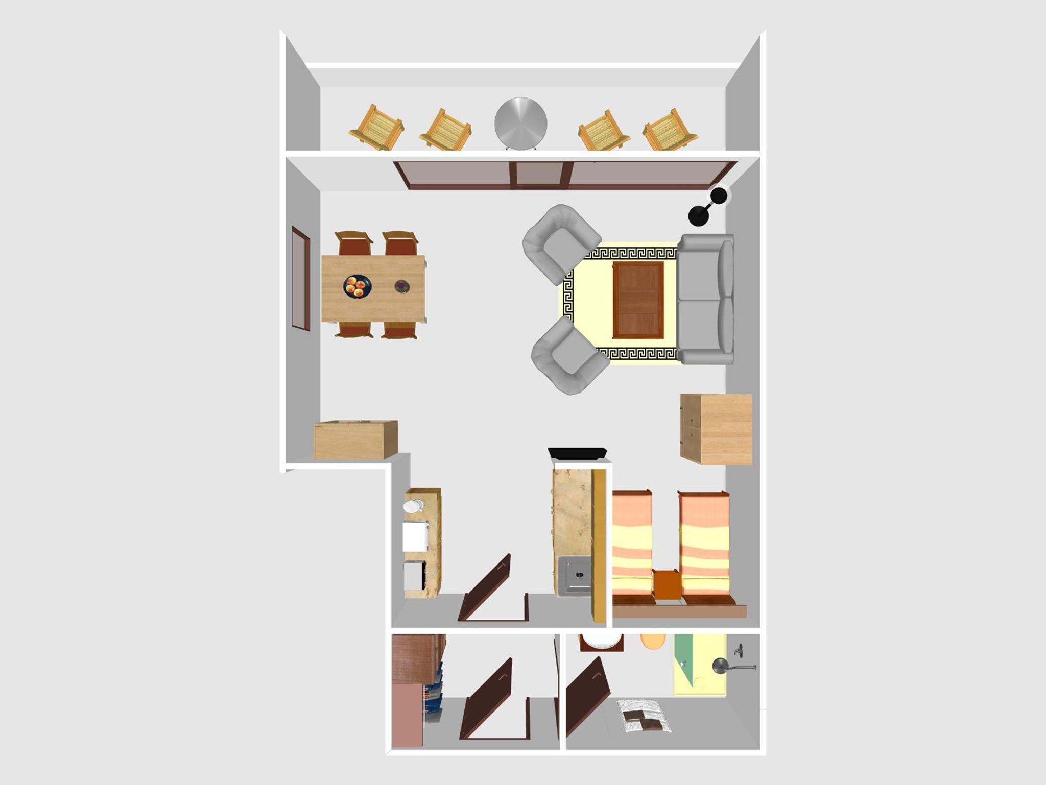 Wohn-Schlafraum mit 2 Einzelbetten (je 2,00 m x 0,80 m), PVC-Fußboden, Kabel-TV, Durchwahltelefon, Sitzecke, Essecke, Küche mit Mikrowelle, Dusche/WC,