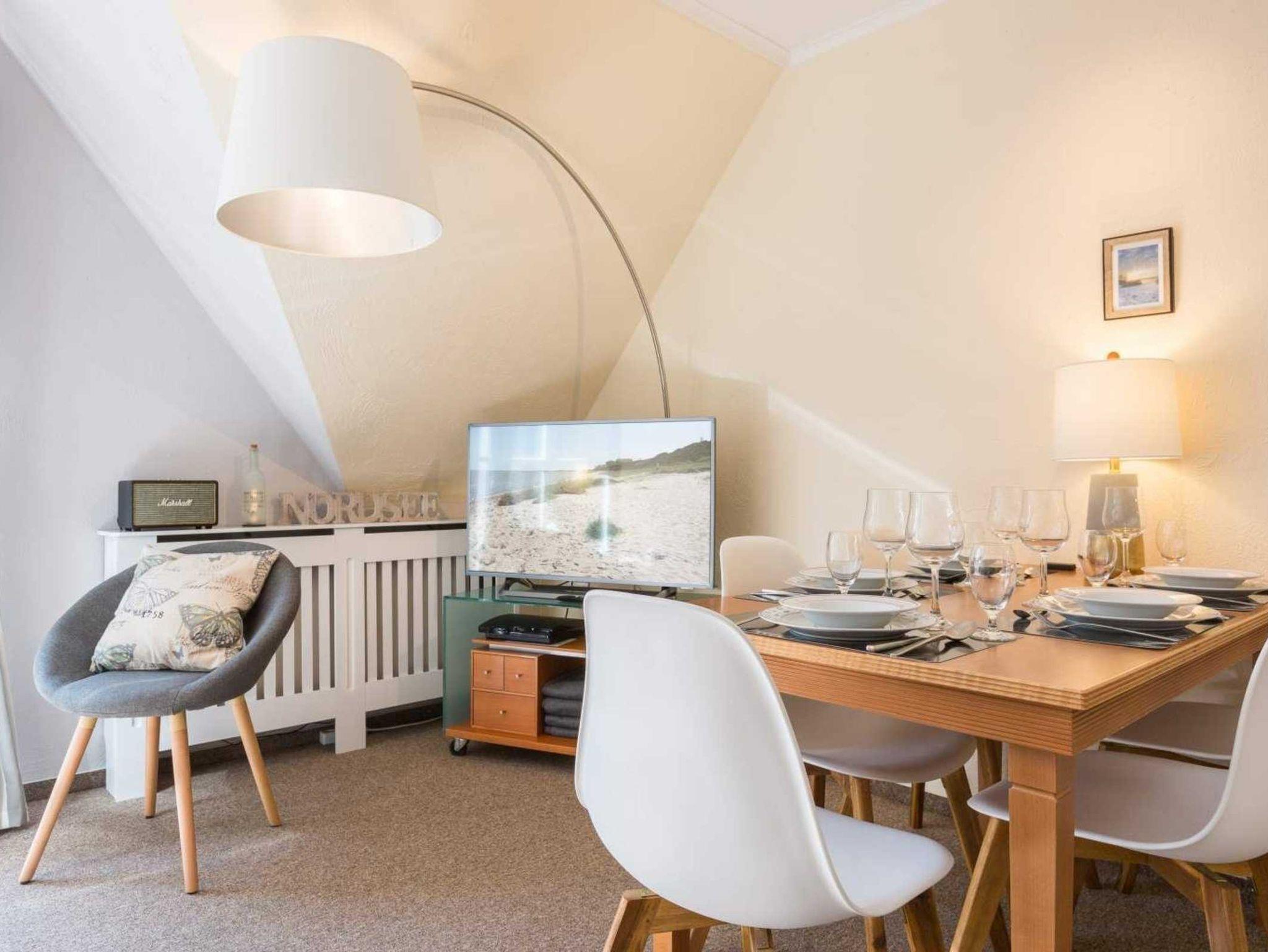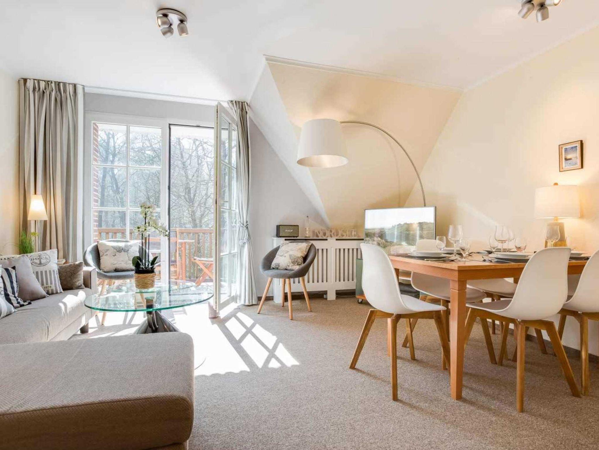 Wohnzimmer mit großem Ecksofa für 2-4 Personen, 2 Sesseln, großem TV (Kabel), Sony Playstation 3, Stereo-Kompaktanlage (mit Bluetooth) und Esstisch mit 5 Stühlen. Vom Wohnzimmer führt eine Treppe zum 2. Schlafzimmer. Direkter Zugang zum möblierten Balkon nach Südwesten mit Ausblick auf das Kurwäldchen. Offene Küche mit Herd mit 2 Kochstellen, Mikrowelle mit Grillfunktion, Geschirrspüler, Kühlschrank mit Gefrierfach und De Longhi Nespresso Kapsel-Kaffeemaschine.