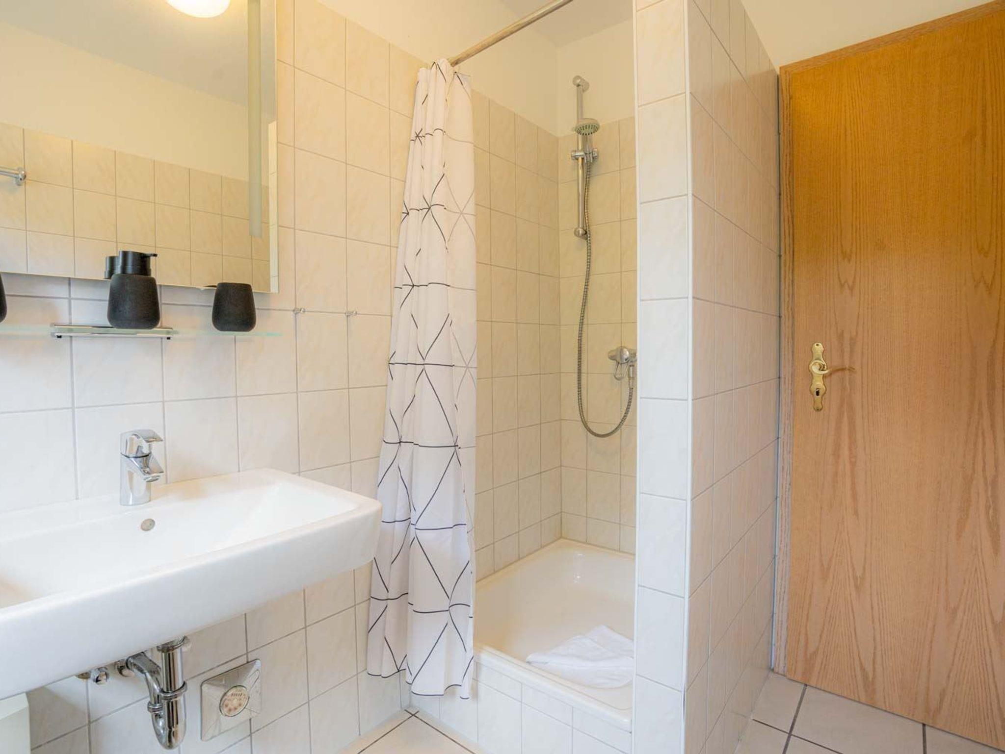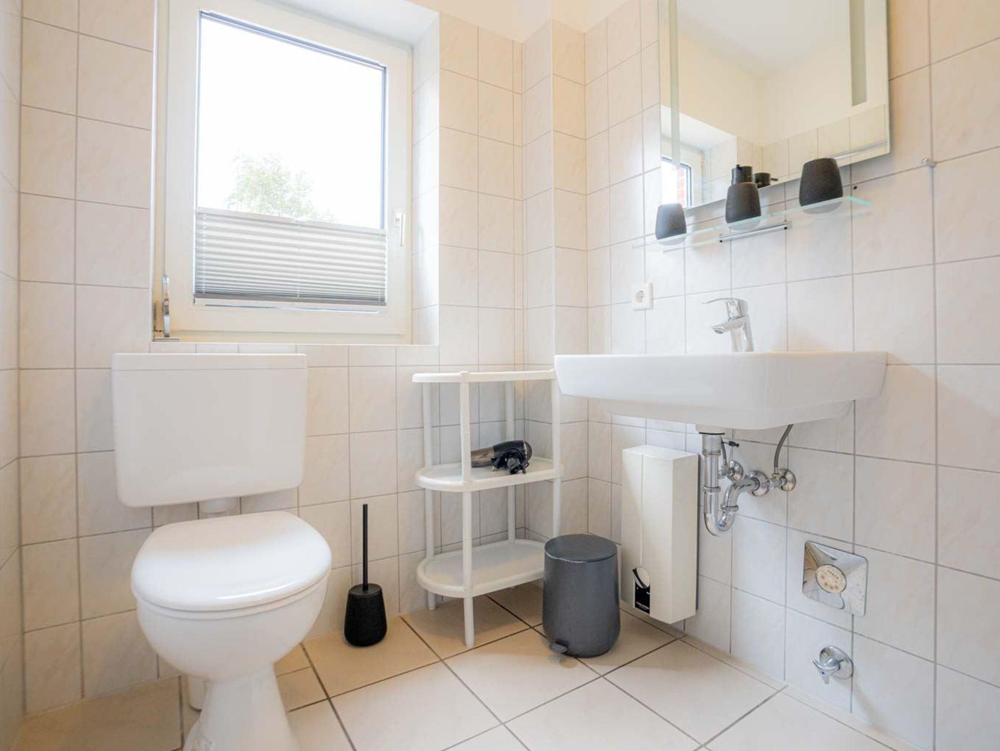 Badezimmer (Duschbad) mit Dusche, WC, Tageslicht und Föhn.