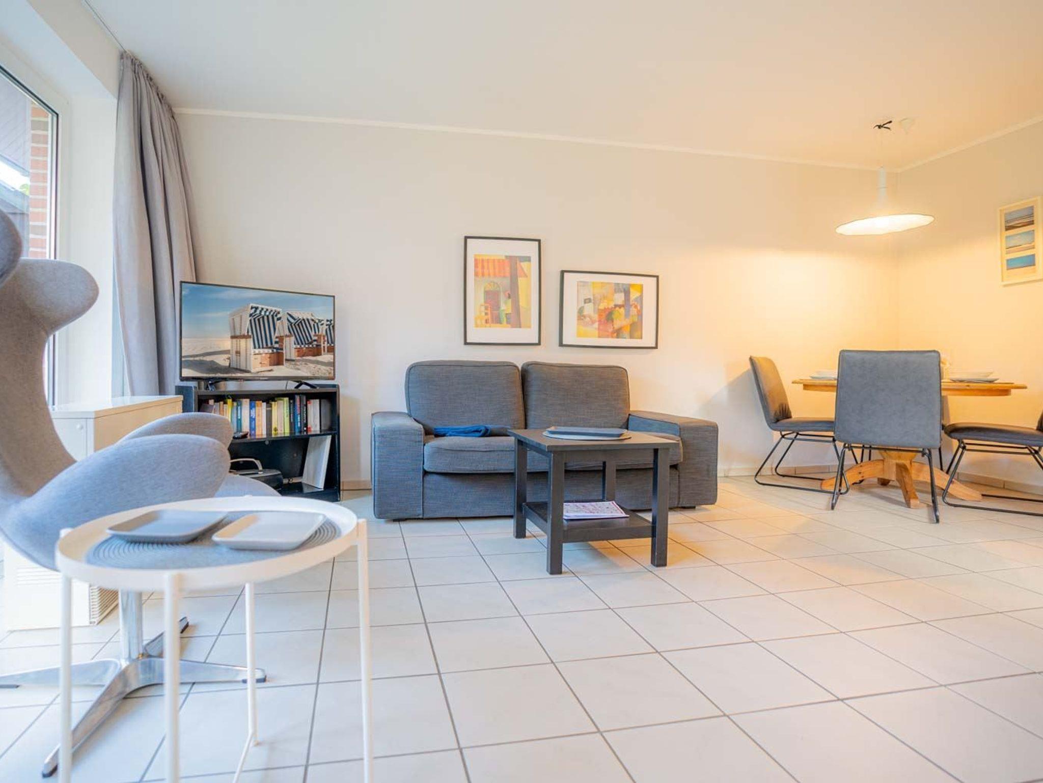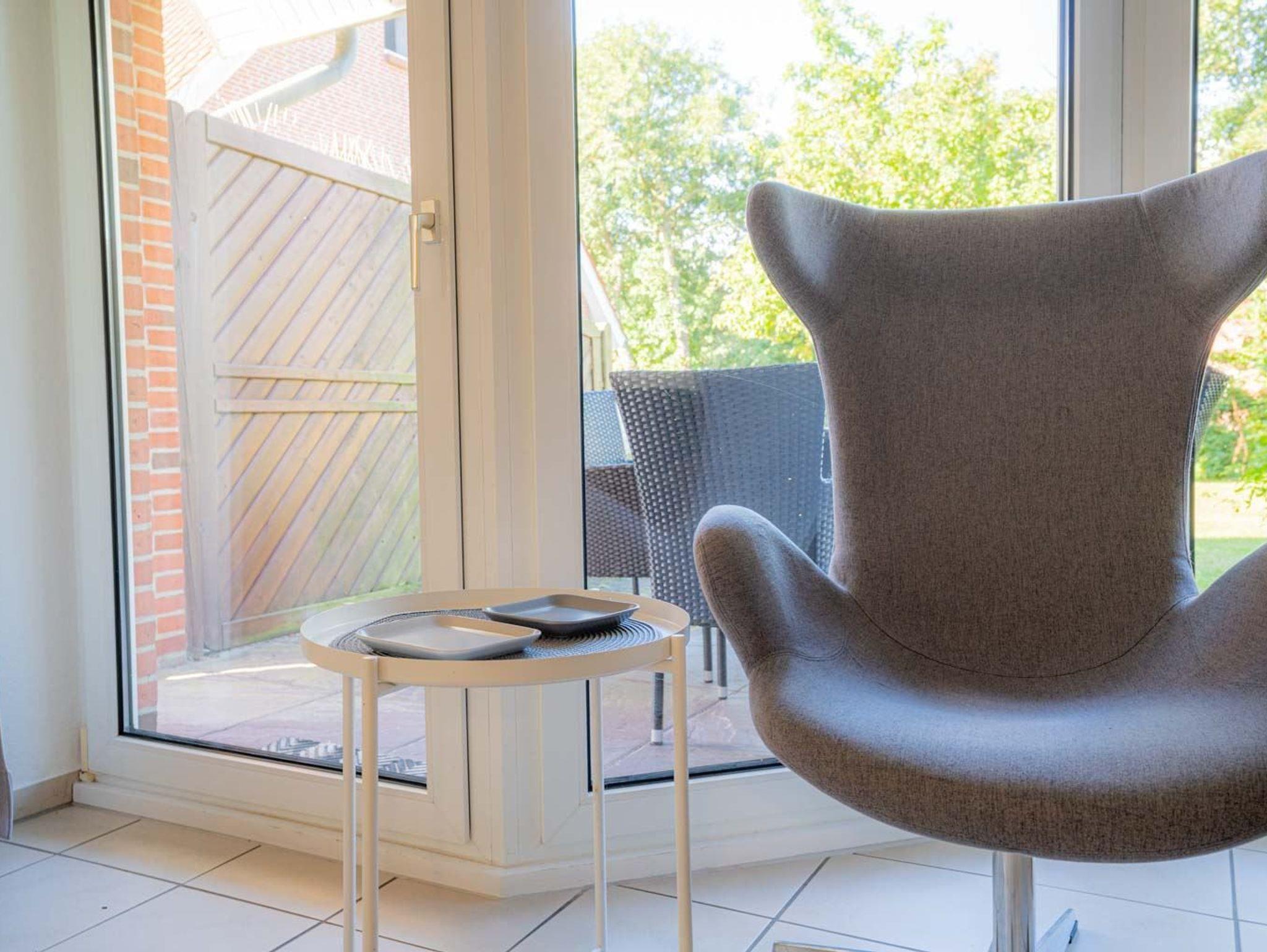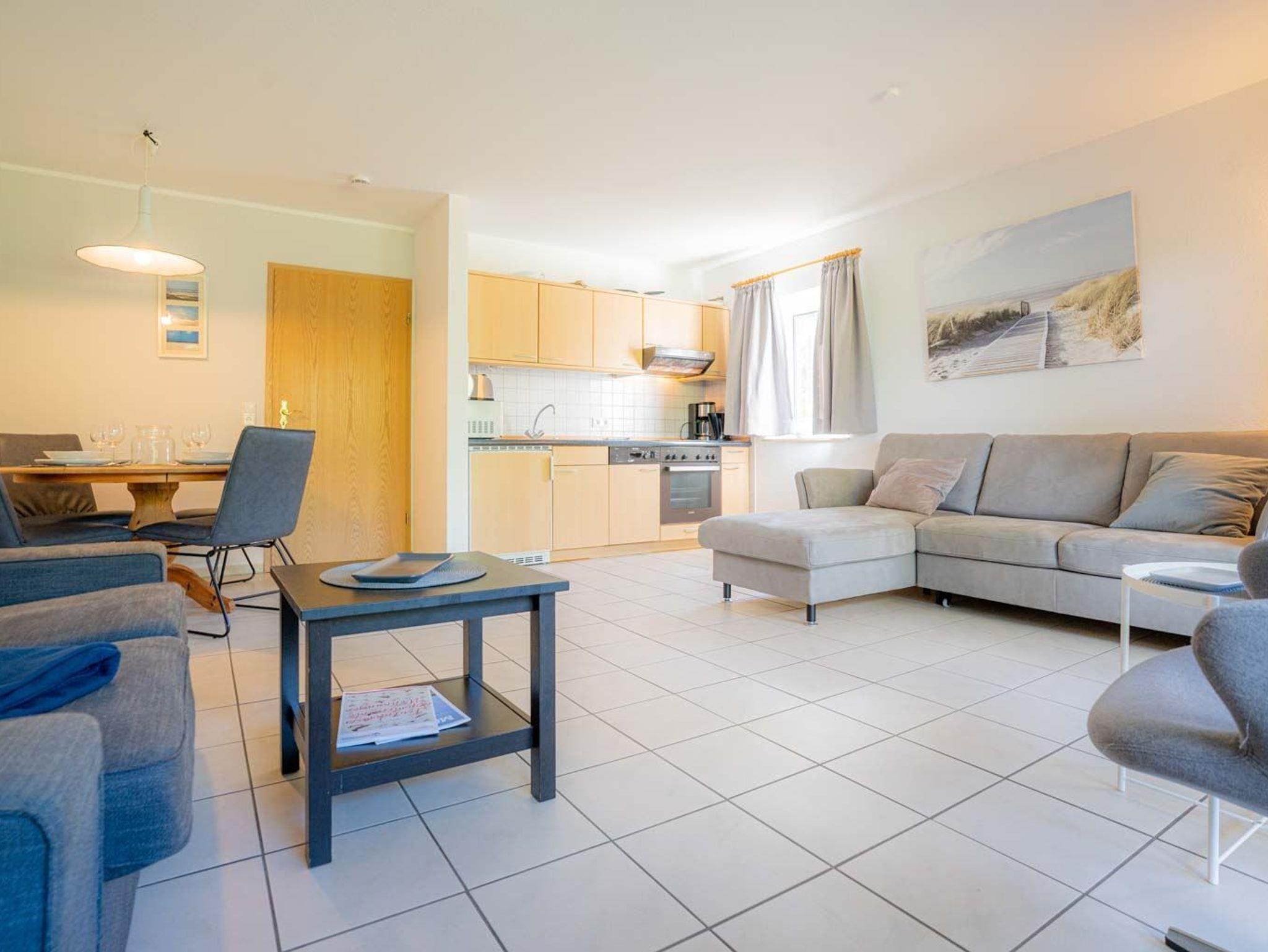 Wohnzimmer mit zwei Sofas (eines davon zum Schlafsofa ausziehbar, 120x200cm), einem Sessel, TV (Sat) und Esstisch mit 4 Stühlen. Direkter Zugang zur windgeschützten, möblierten Gartenterrasse nach Westen. Offene Küche mit Backofen, Mikrowelle, Geschirrspüler und Kühlschrank mit Gefrierfach.