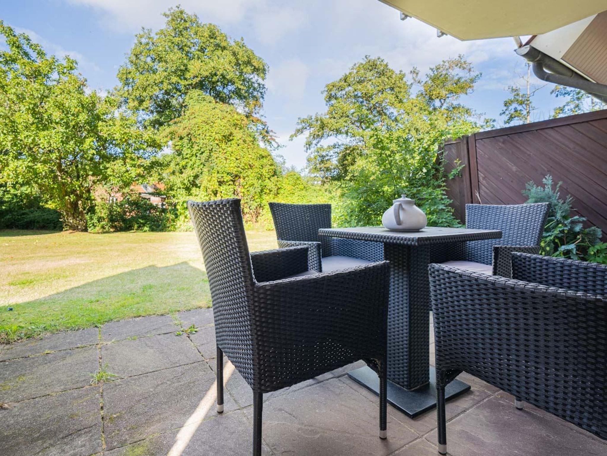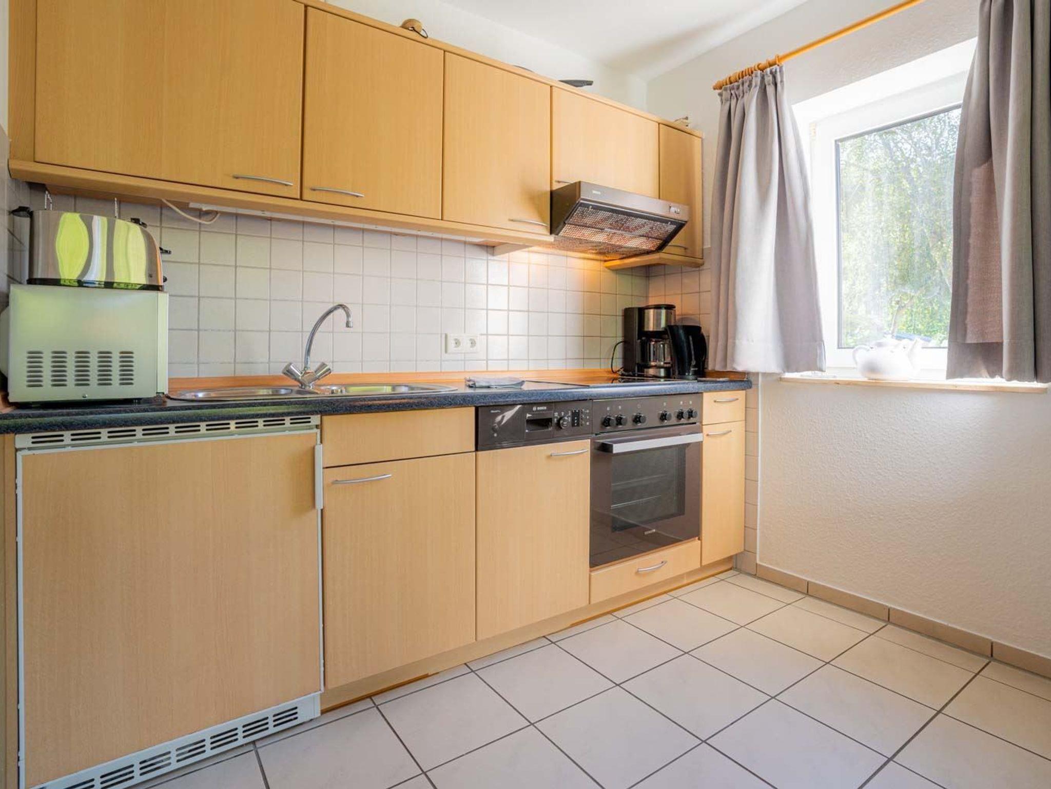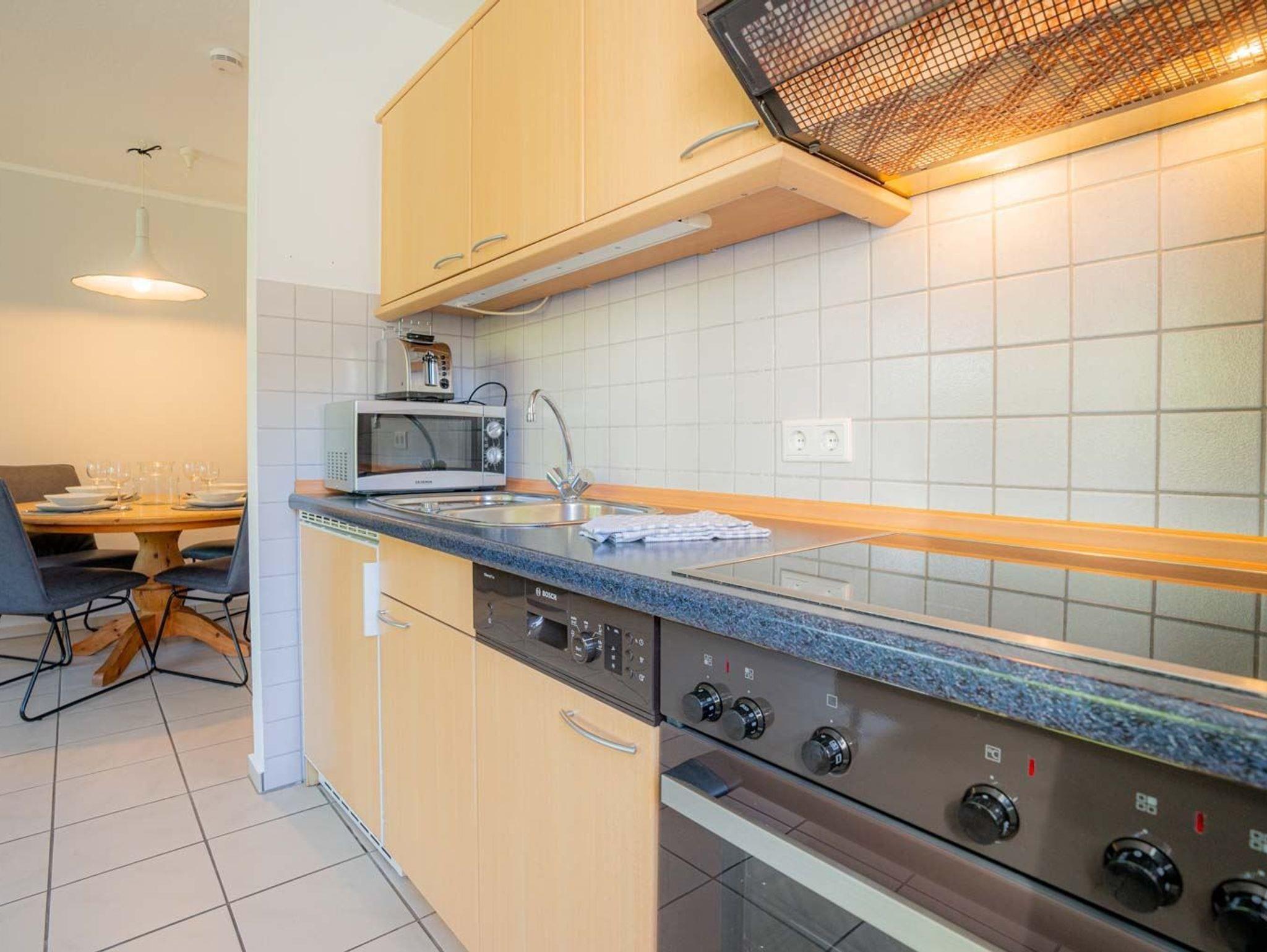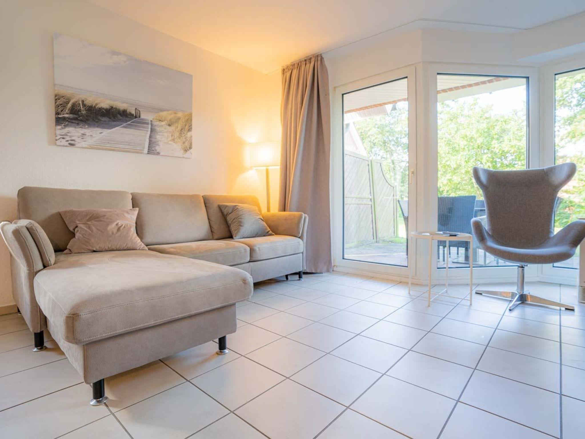 Wohnzimmer mit zwei Sofas (eines davon zum Schlafsofa ausziehbar, 120x200cm), einem Sessel, TV (Sat) und Esstisch mit 4 Stühlen. Direkter Zugang zur windgeschützten, möblierten Gartenterrasse nach Westen. Offene Küche mit Backofen, Mikrowelle, Geschirrspüler und Kühlschrank mit Gefrierfach.
