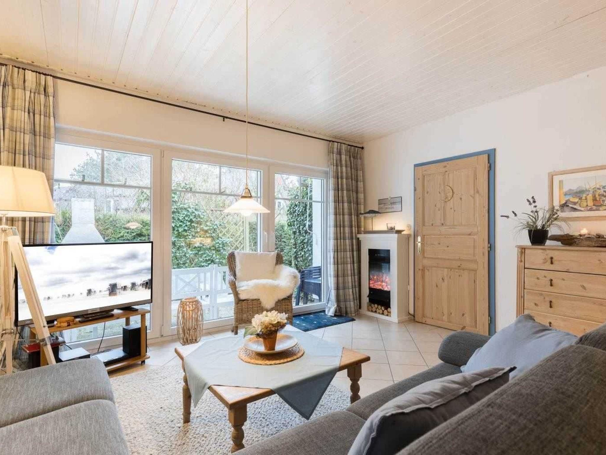Wohnzimmer mit großem Ecksofa für 4-5 Personen, Elektro-Kamin, einem Korbsessel, HD-TV (Sat), DVD-Player, Radio mit CD-Player und Esstisch für 6 Personen. Direkter Zugang zur schönen, möblierten Gartenterrasse mit Sonnenmarkise nach Süden.