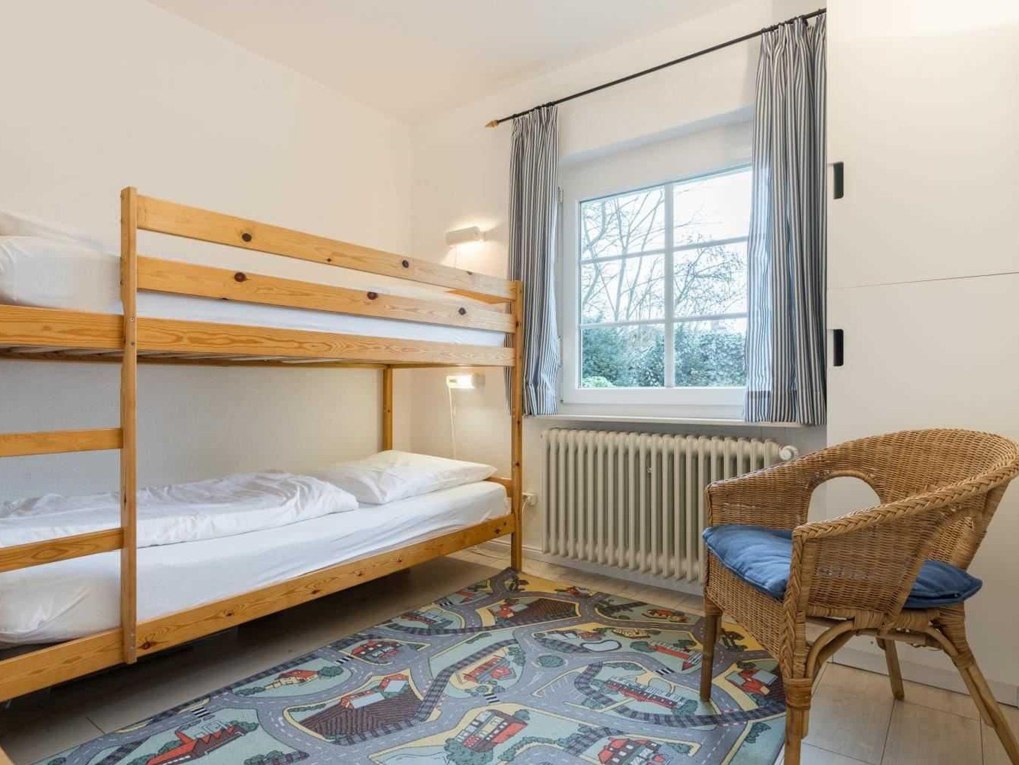 3. Schlafzimmer mit 2 Etagen-Einzelbetten (je 90x200cm), Kleiderschrank, Spielteppich, Spielen, Büchern und kleinem Tisch mit Stühlen.