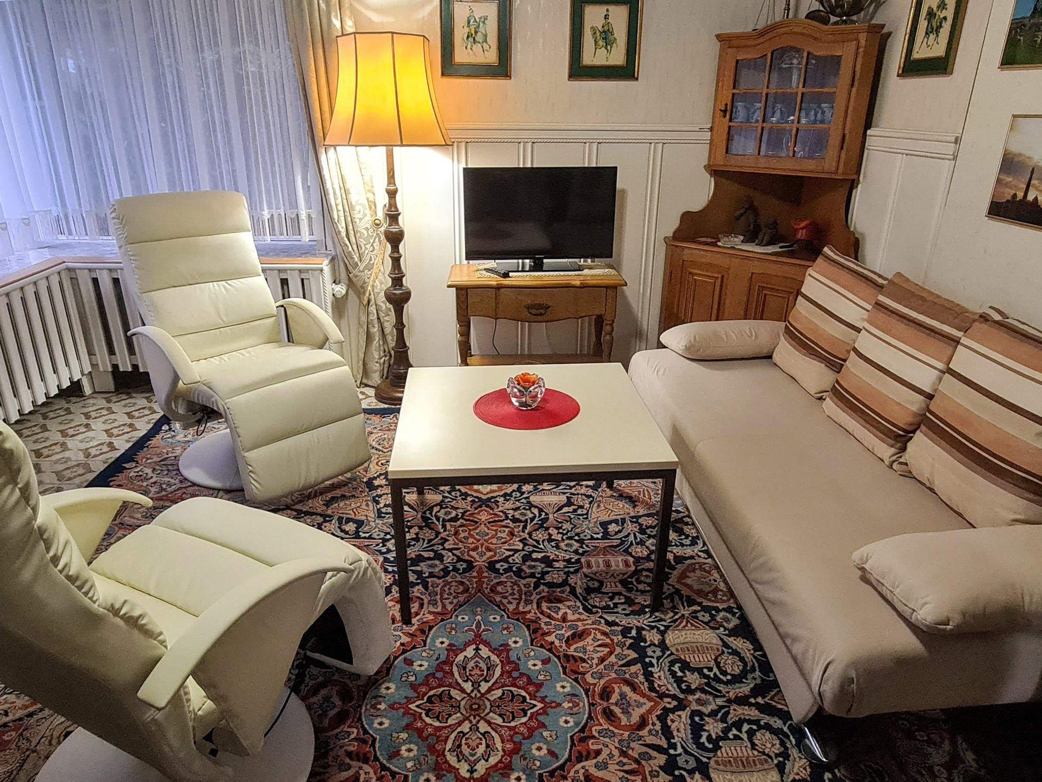 • Gemütliches Wohnzimmer mit ausziehbarem Schlafsofa, 2 Sesseln, Kleiderschrank, TV und Radio.