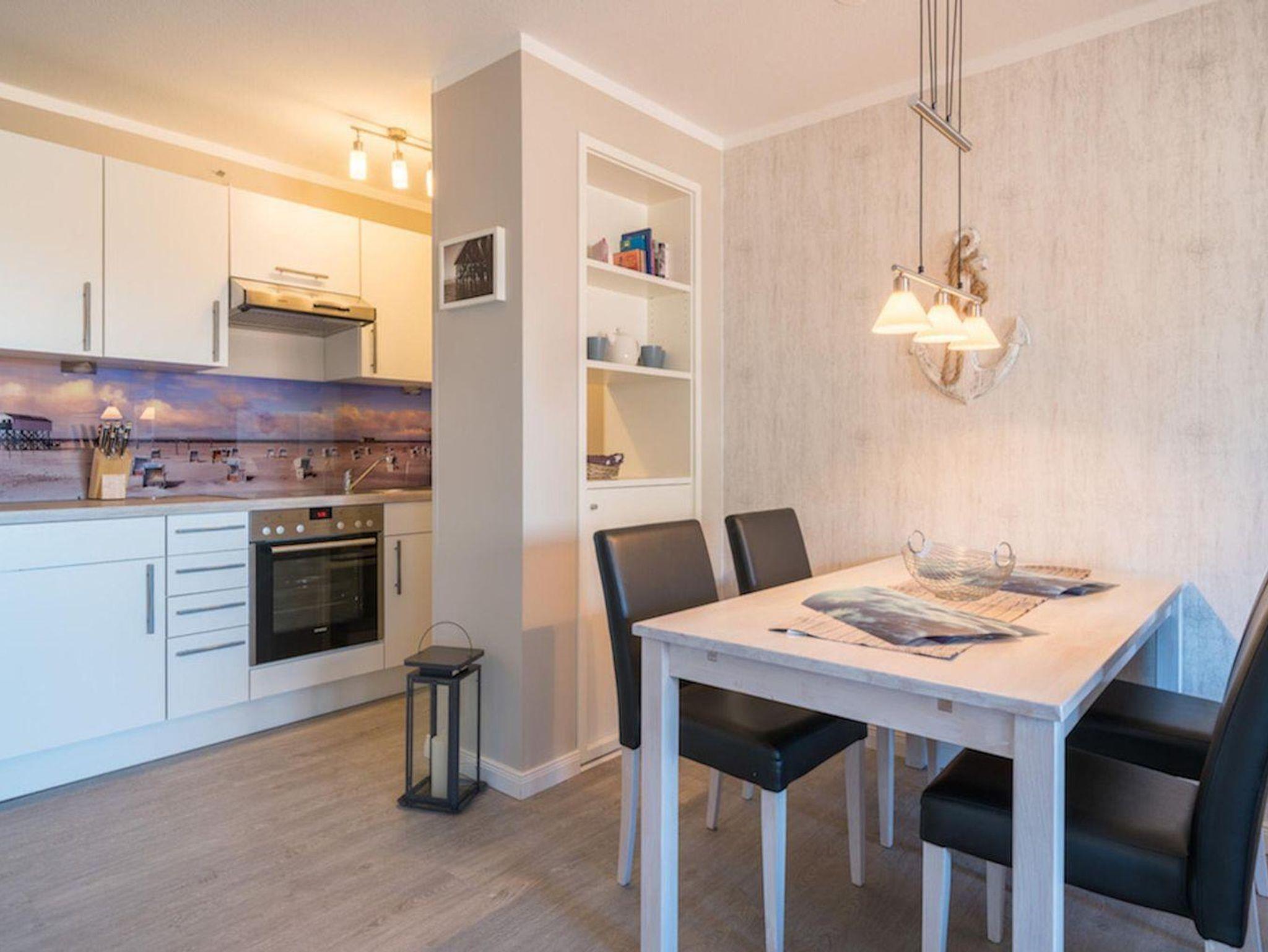 Die 49 qm Ferienwohnung besteht aus einem schönen Wohnbereich mit Couch und Couchtisch. Des weiteren steht ein Esstisch mit 4 Stühlen bereit. Die Küchenzeile der Wohnung ist ausgestattet mit einem Herd mit Ceranfeld und Backofen, Dunstabzugshaube, Geschirr, Kaffeemaschine, Kochtöpfe, Kühlschrank, Mikrowelle, Toastern und einem Wasserkocher.