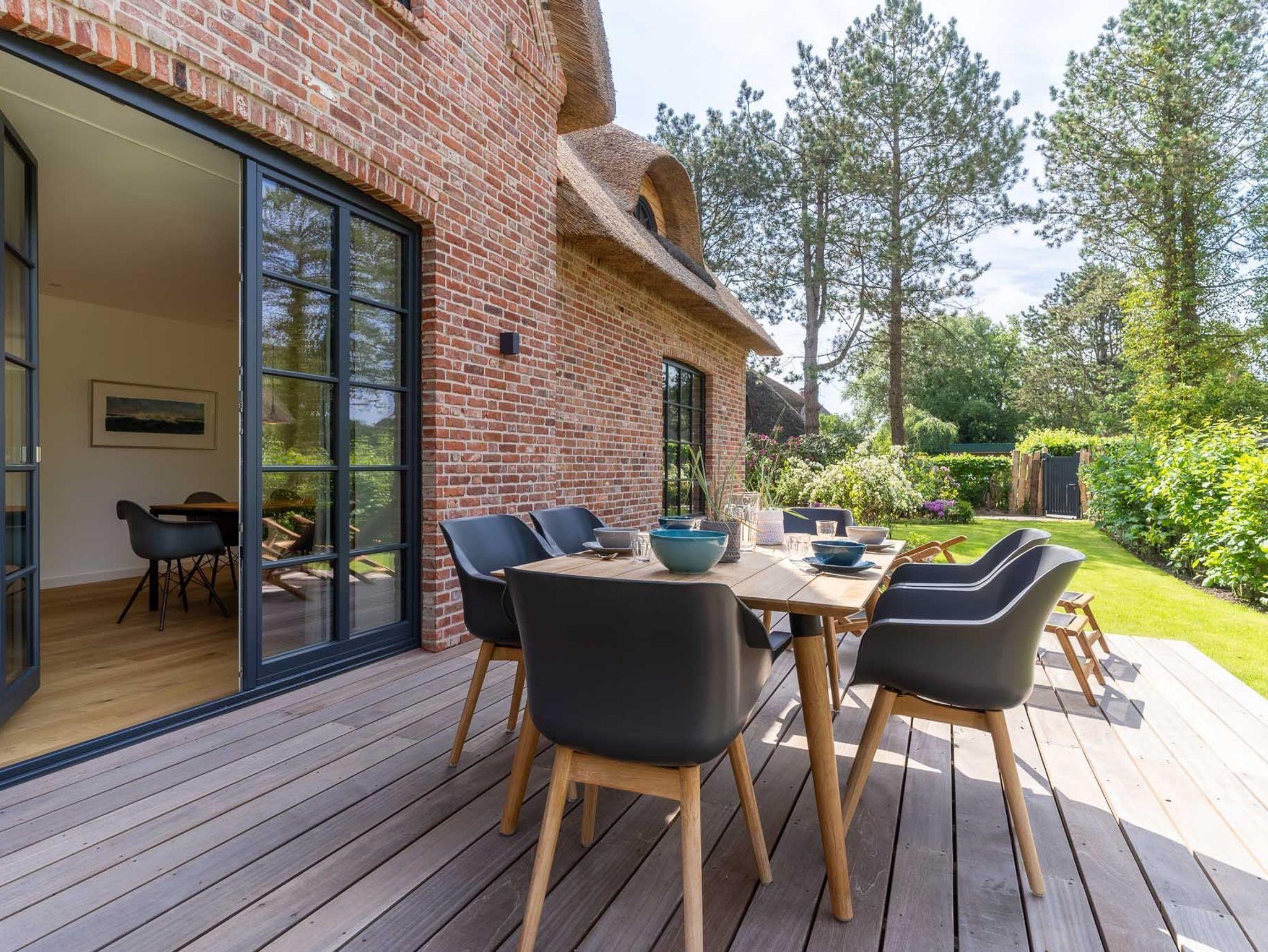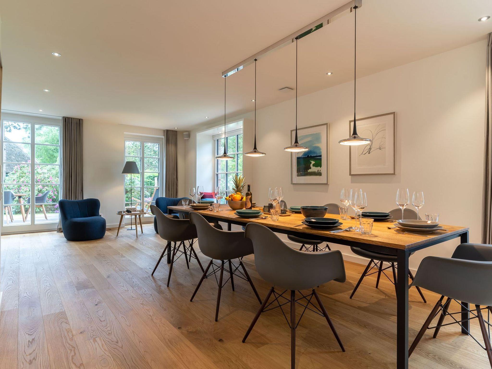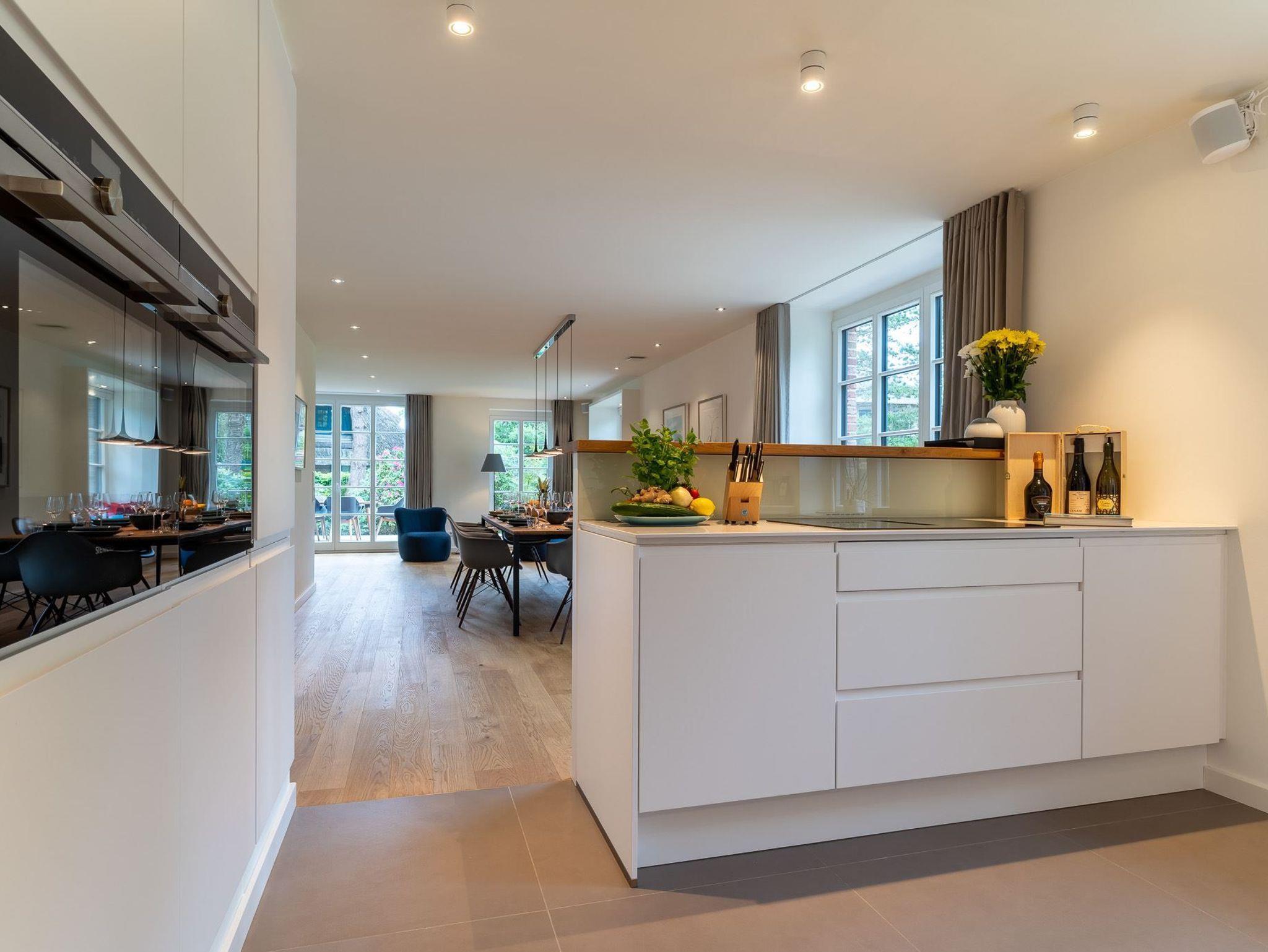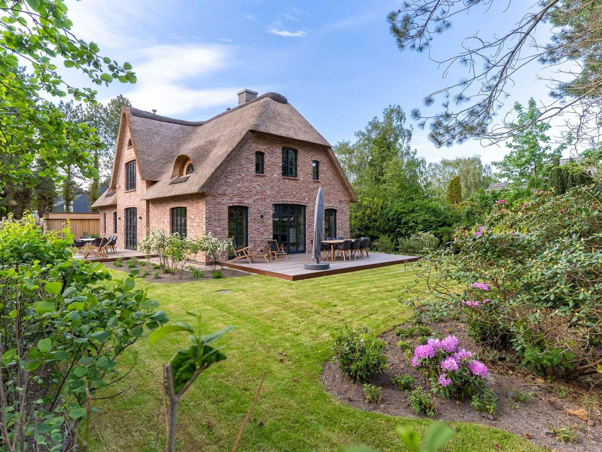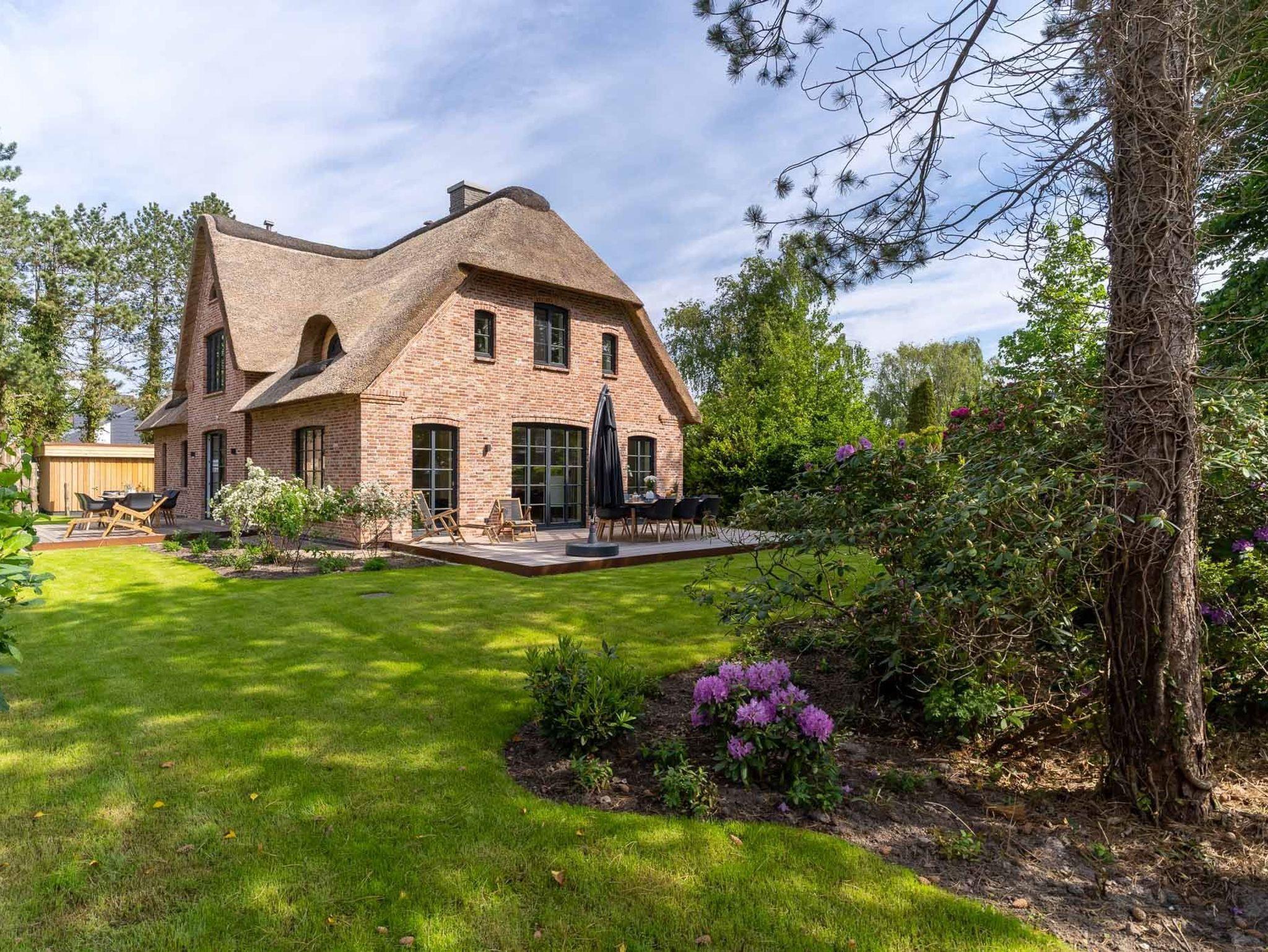 Exklusives, mit 5 DTV-Sternen ausgezeichnetes Prestigeobjekt - genießen Sie auf ca. 200 qm unvergleichlichen Luxus der Extraklasse. Das Reetdachhaus bietet mit 5 Zimmern auf 2 Ebenen, 2 Terrassen und Garten, Urlaubsräume für bis zu 8 Personen. Ein Juwel mitten im Stillen Dorf, eine von St. Peter-Ording´s Topadressen, qualitativ hochwertig und luxuriös ausgestattet, lädt das großzügige ?Hideaway Hoher Himmel?, der Name leitet sich aus dem sensationellen Eingangsbereich ab, zum Wohlfühlen ein, ob am offenen, von drei Seiten sichtbaren Kamin im Wohnzimmer, beim Entspannen im Spa, beim geselligen Beisammensein in dem 60 qm großen Wohn-Essbereich oder beim Kochen in der modernen, top ausgestatteten Küche. Umgeben von Musik über das Sonos Soundsystem, Streamingdienste, Smart TV, Fußbodenheizung erleben Sie einen unvergesslichen Urlaub. Im Außenbereich runden 2 große Terrassen und der liebevoll angelegte Garten den Zauber dieses Ferientraumes ab.