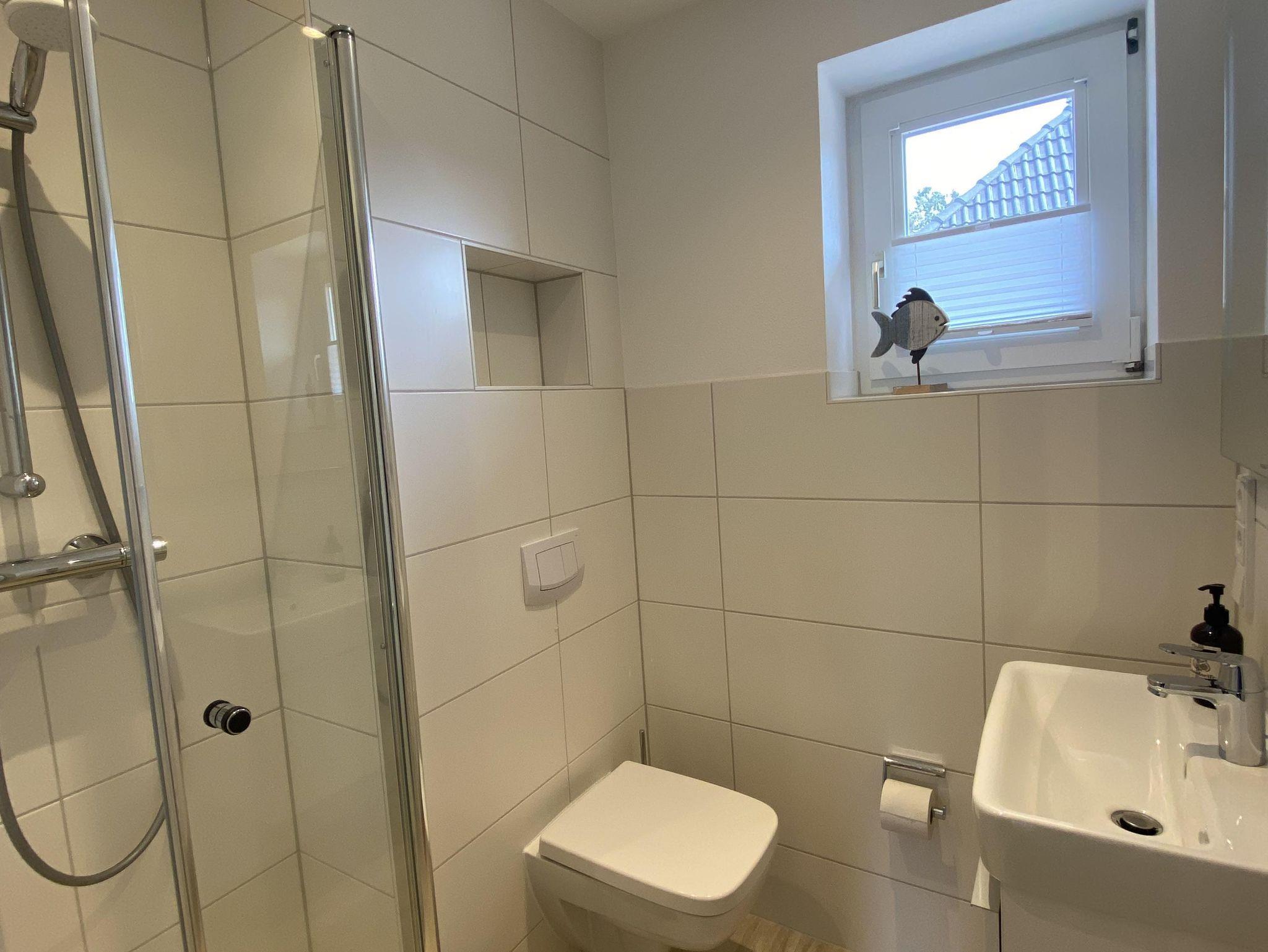 Erdgeschoss: Eingangsbereich, Wohnküche mit Essbereich und Zugang zur Terrasse, ein Schlafzimmer mit Doppelbett (180 x 200 cm), ein Duschbad / WC