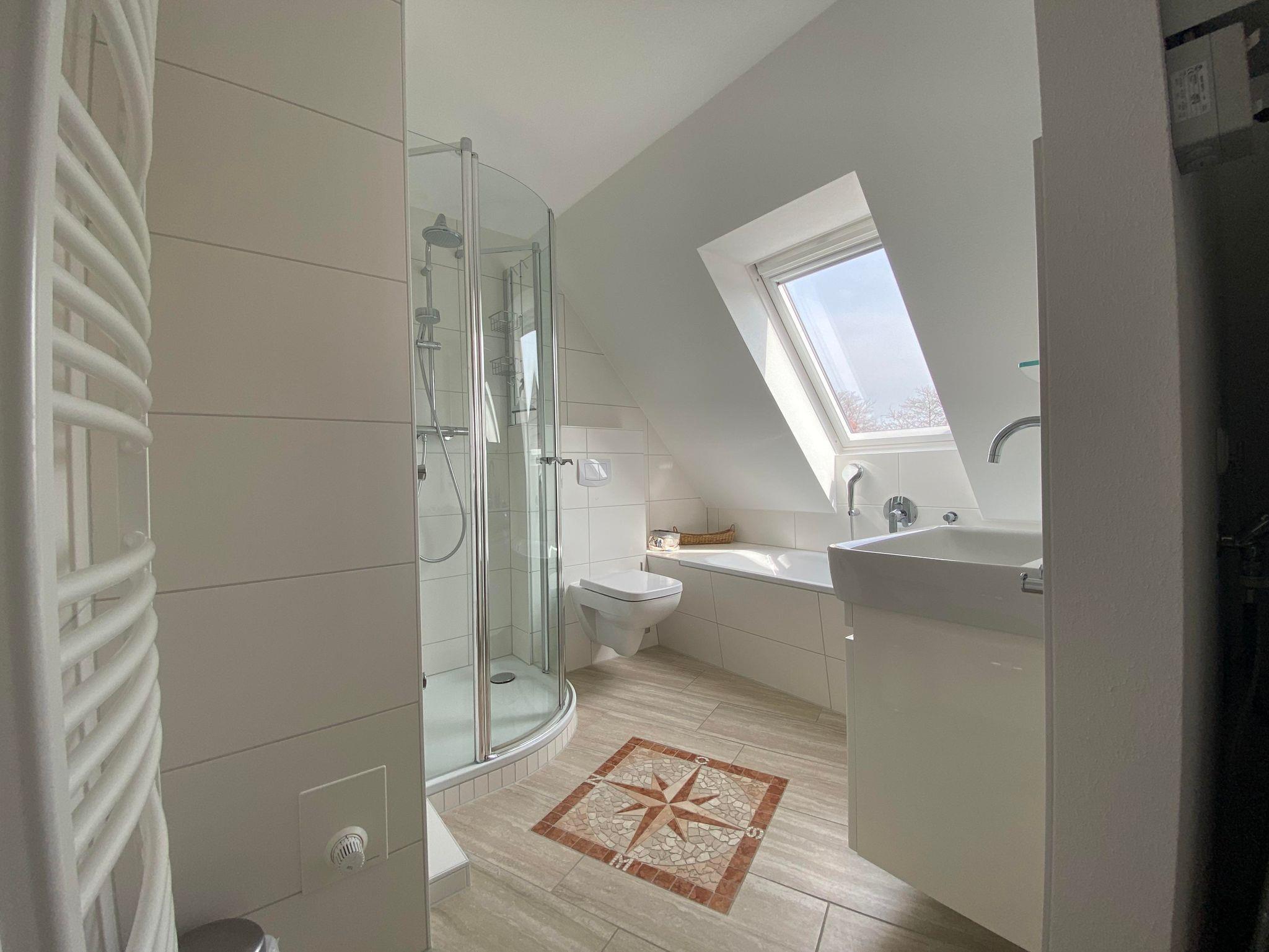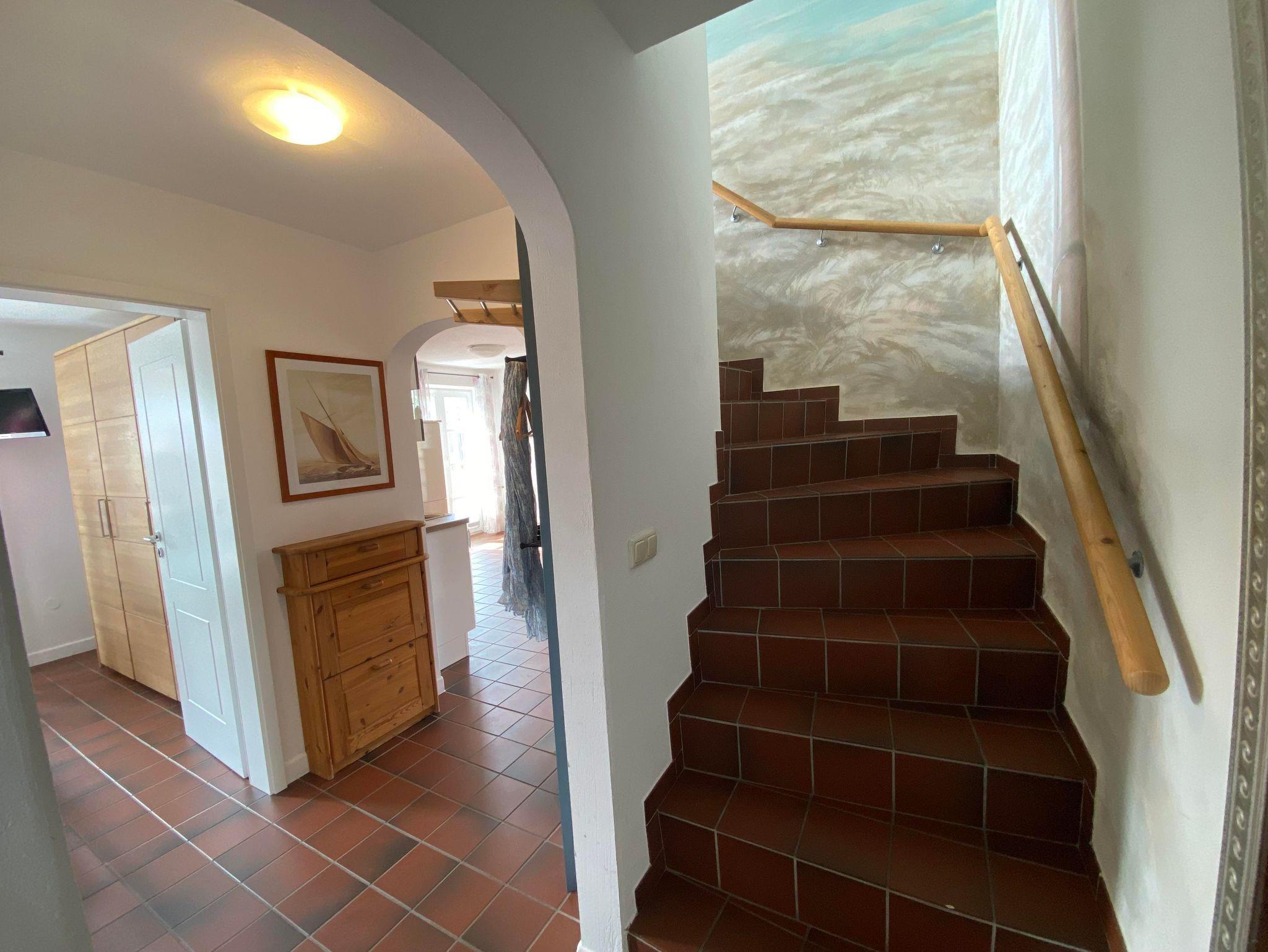 Obergeschoss: Wohnraum mit Zugang zum Balkon, ein Schlafzimmer mit Doppelbett (160 x 200 cm), ein Wannenbad / WC mit separater Dusche, sowie Waschmaschine und Trockner