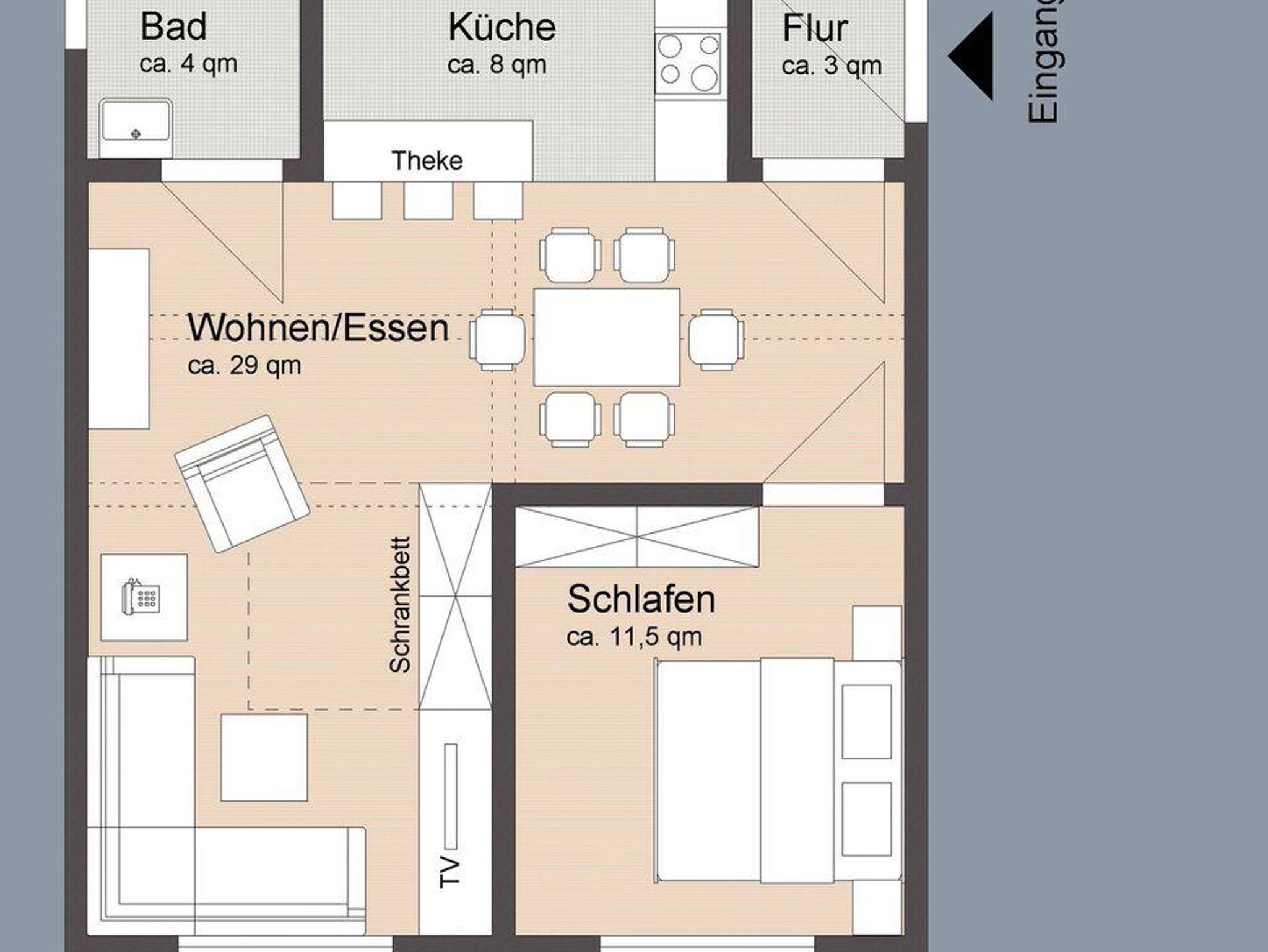 Es verfügt über einen behaglichen Wohn-Essbereich mit TV-Gerät und WLAN und einer modernen, offenen Küche. Angrenzend sind ein separates Schlafzimmer und ein komfortables Bad. Im Wohnzimmer befindet sich außerdem ein praktisches Schrank-Doppelbett.