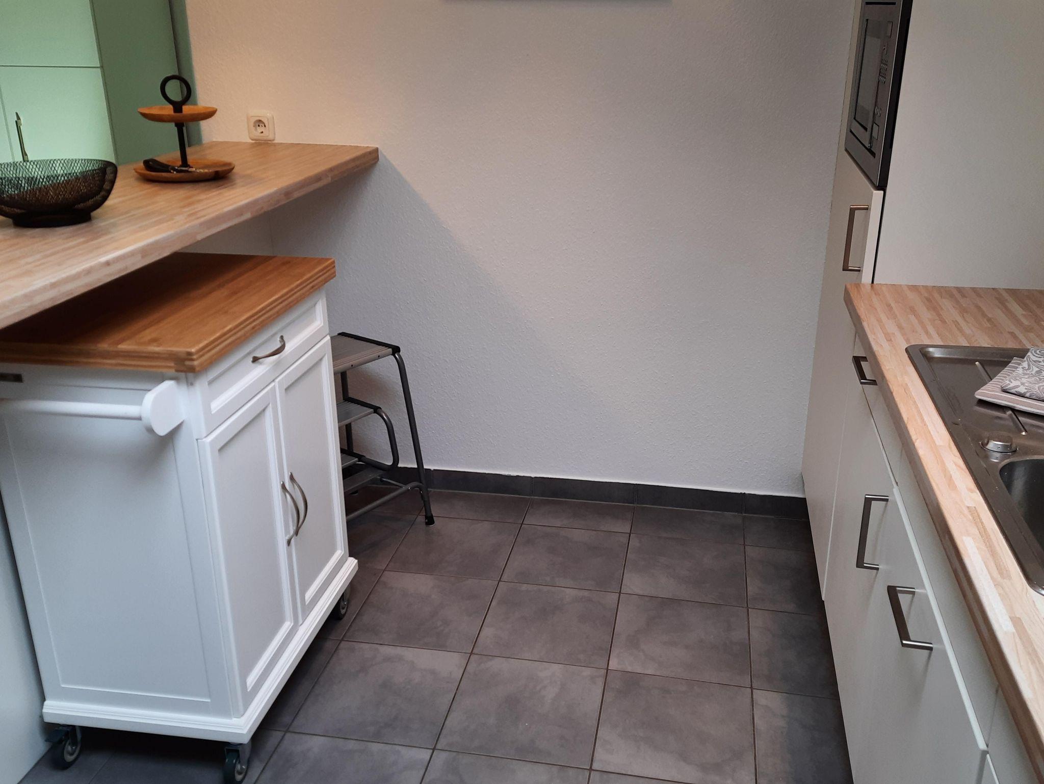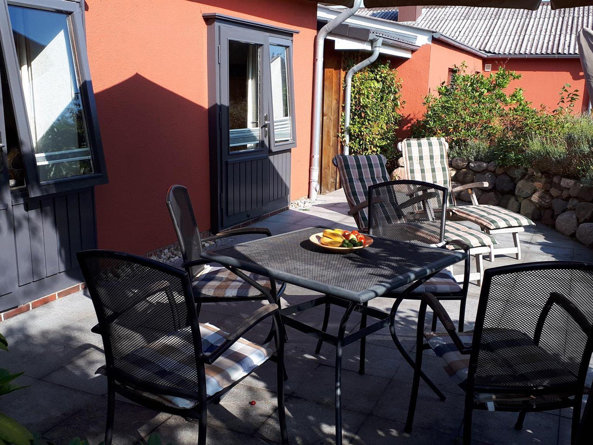 Die kleine, hübsche Terrasse mit Friesenwall ist direkt vor dem Wohnzimmer, im nach Süden liegenden Garten.