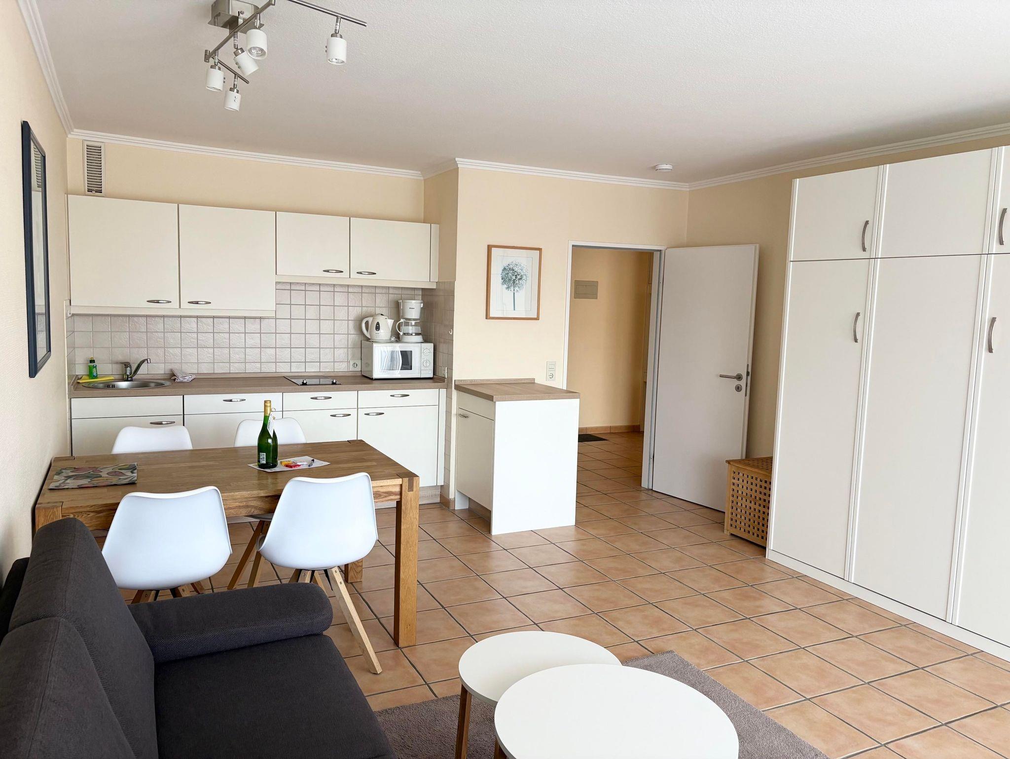 Schlafraum mit 2 Einzelbetten, Wohn-Schlafraum mit 2 Wandschrankbetten, Fliesenboden, Sitzecke, Essecke, Küchenzeile, Mikrowelle, Kabel-TV, Dusche/WC, Durchwahltelefon, Balkon, PKW-Platz Nr. 25, Aufzug und Fahrradkeller.