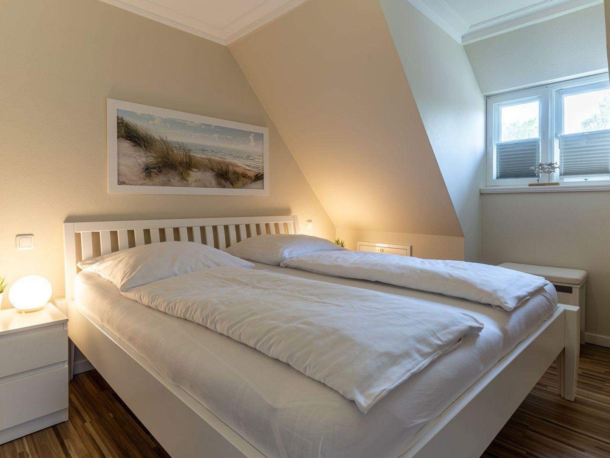 Über eine weitere Holztreppe geht es vom Flur ins Dachgeschoss mit einem gemütlichen Doppelbett.