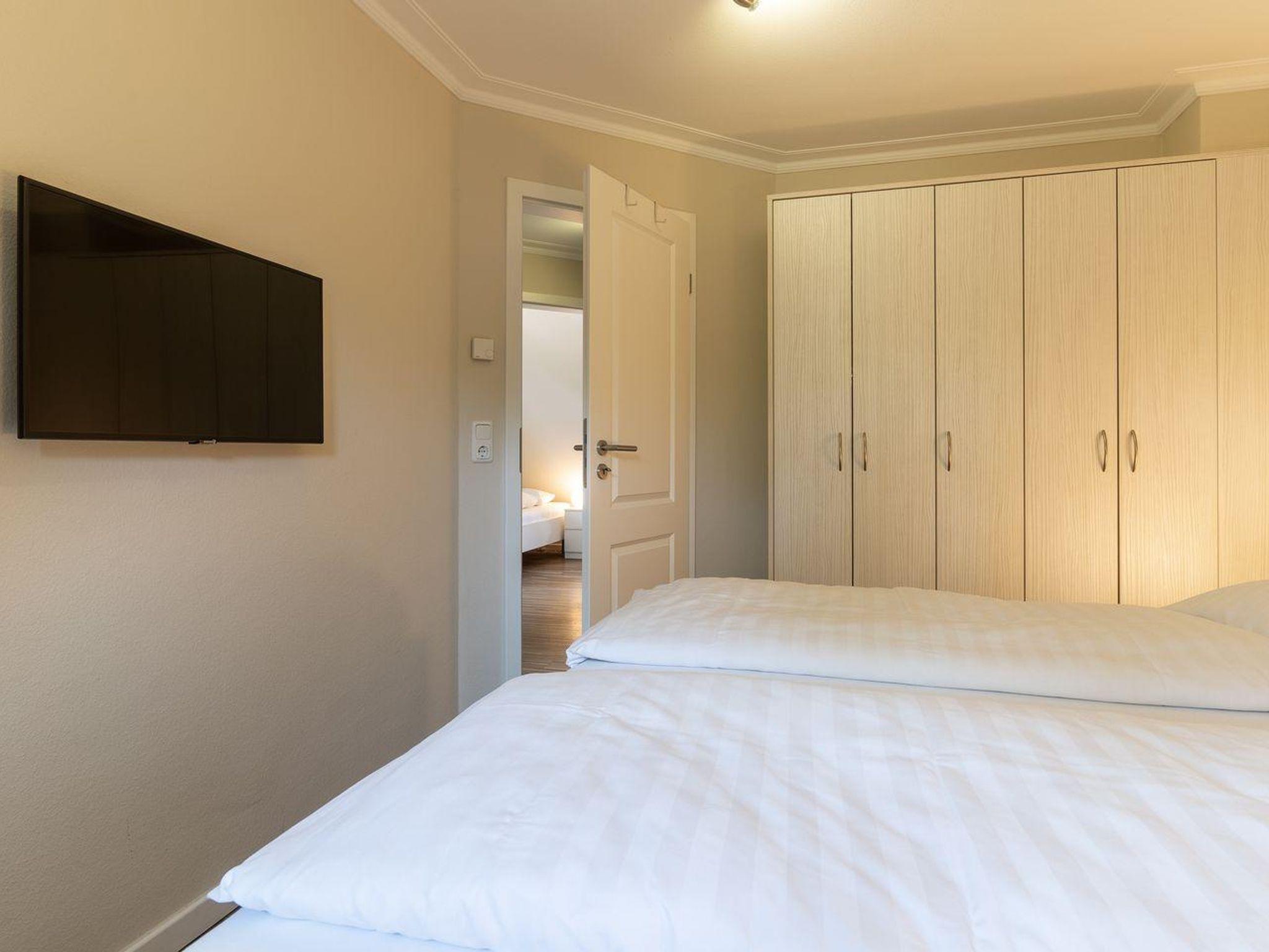 Ein Schlafzimmer ist mit einem großen Doppelbett ( 1,80m x 2,00m ), ein weiteres Schlafzimmer mit zwei Einzelbetten ( 90 cm x 2,00 m ) ausgestattet. Die Schlafzimmerfenster sind mit einem Mückenschutzgitter ausgerüstet.