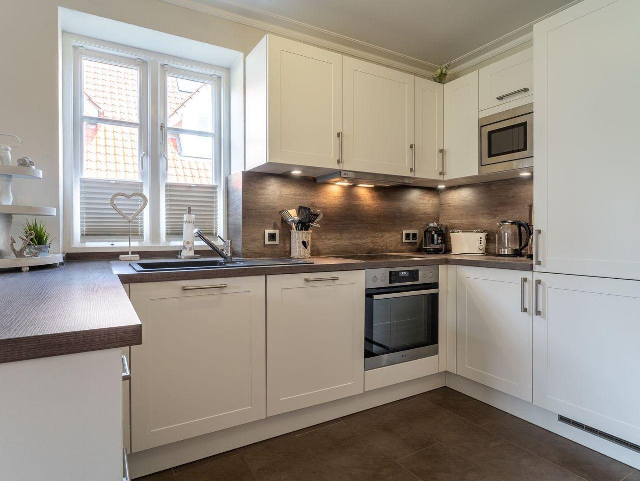 Die Küche verfügt über hochwertige Elektrogeräte und genügend Platz zum gemeinsamen Kochen.
