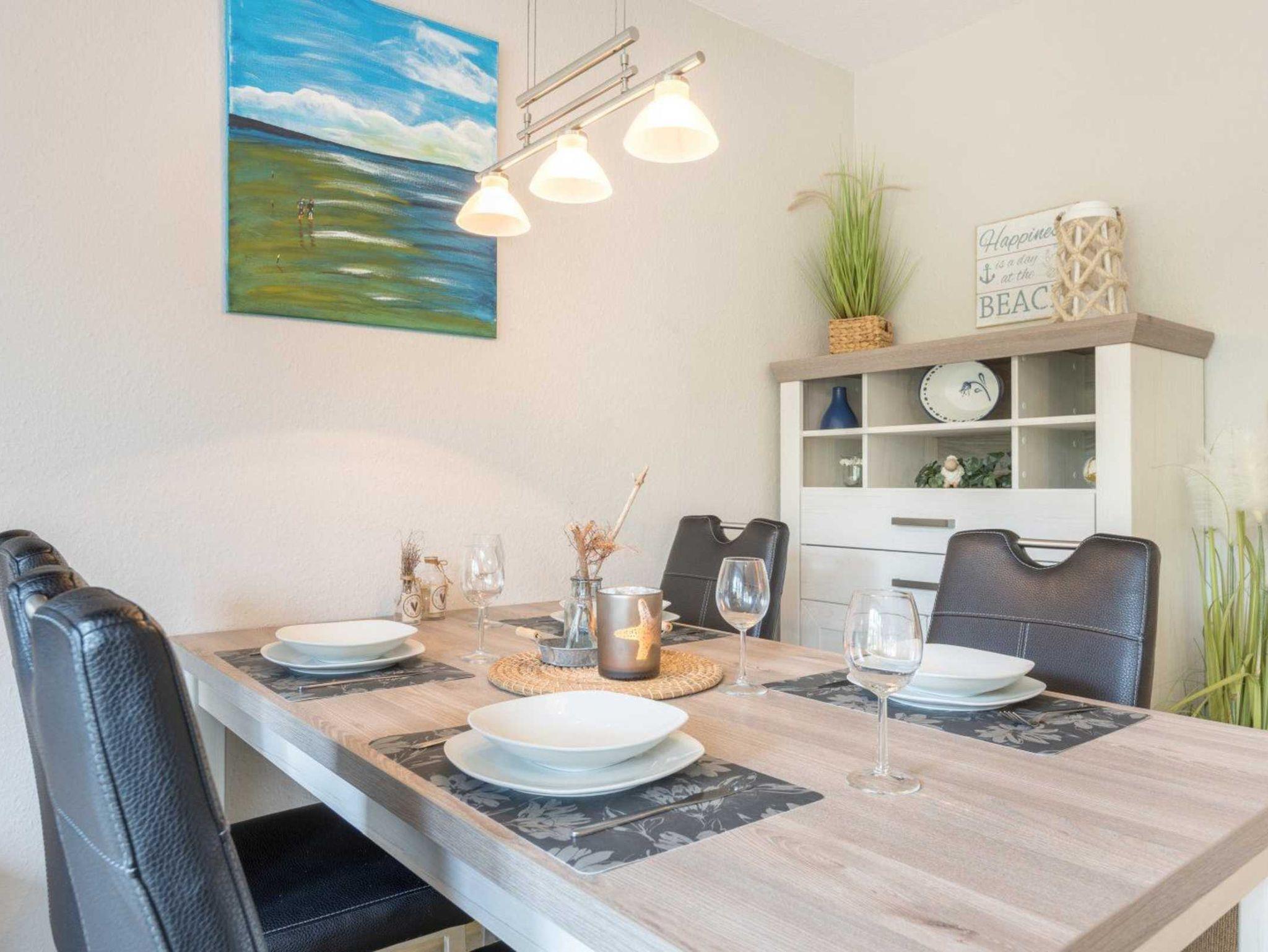 Modernes und elegantes Wohnzimmer mit Lederecksofa, Ruhesessel, TV (Sat) und Esstisch mit 4 Stühlen. Direkter Zugang zur möblierten und überdachten Gartenterrasse nach Westen mit Grillmöglichkeit. Offene Küche mit Backofen, Geschirrspüler und Kühlschrank mit Gefrierfach.